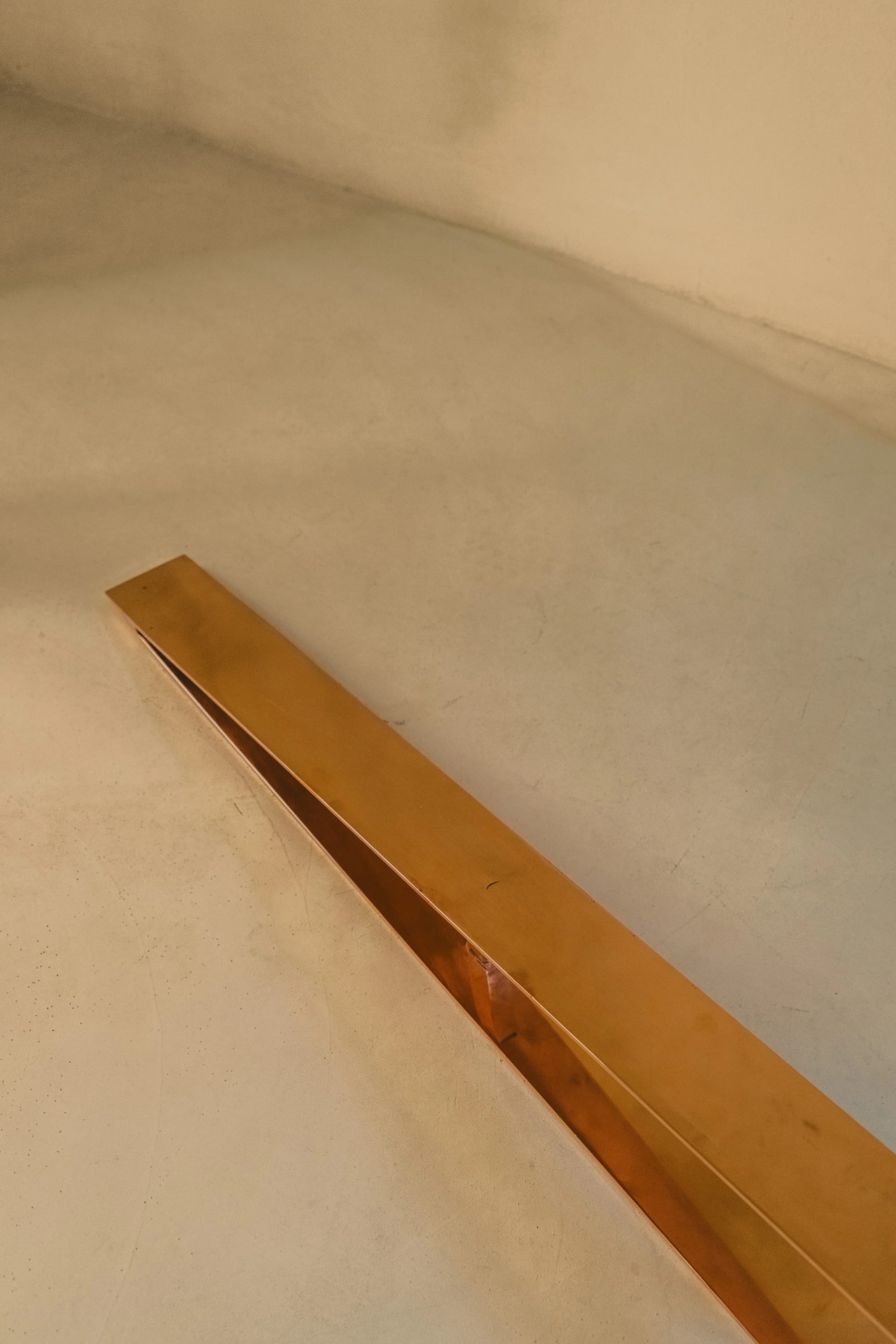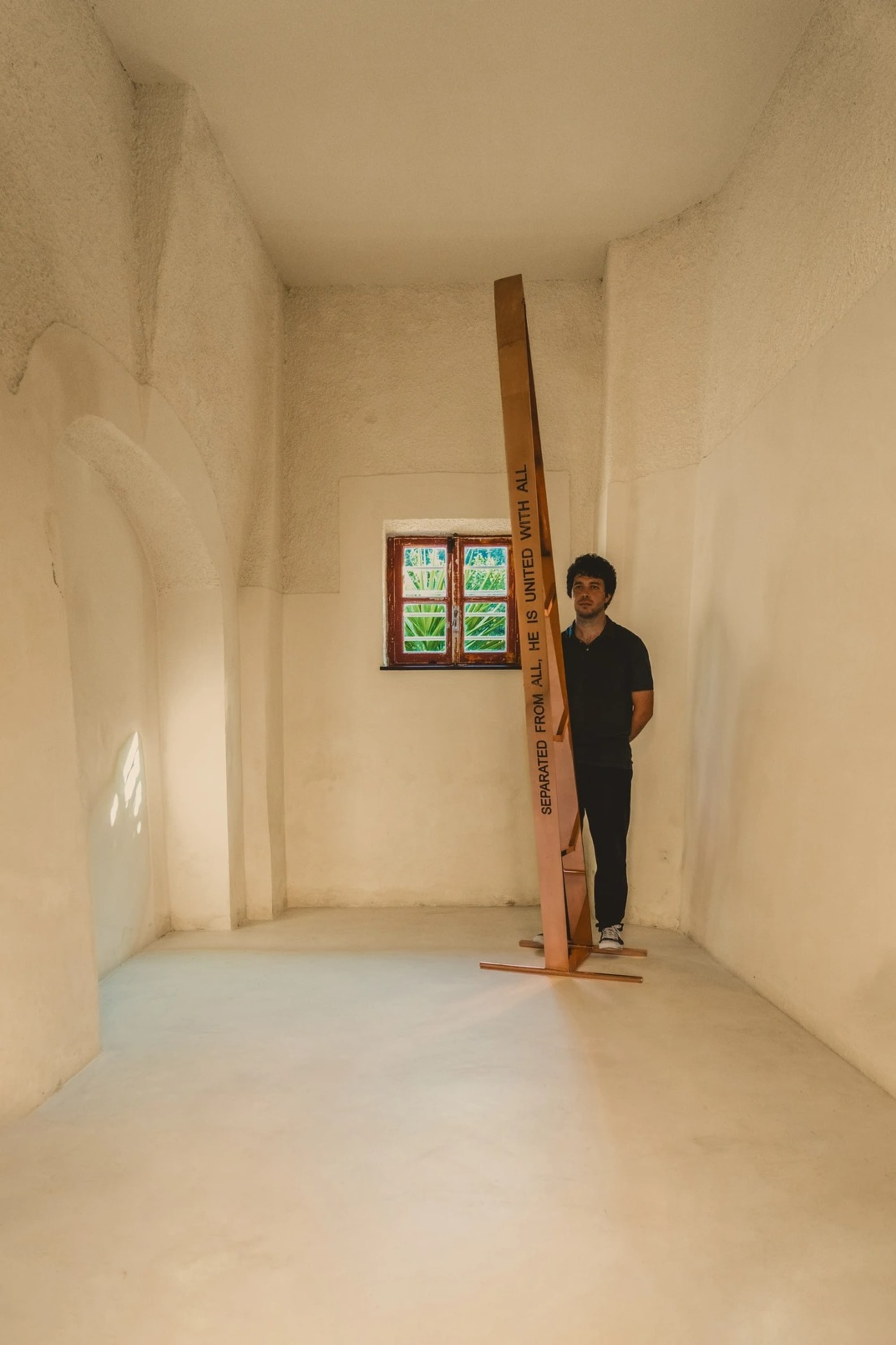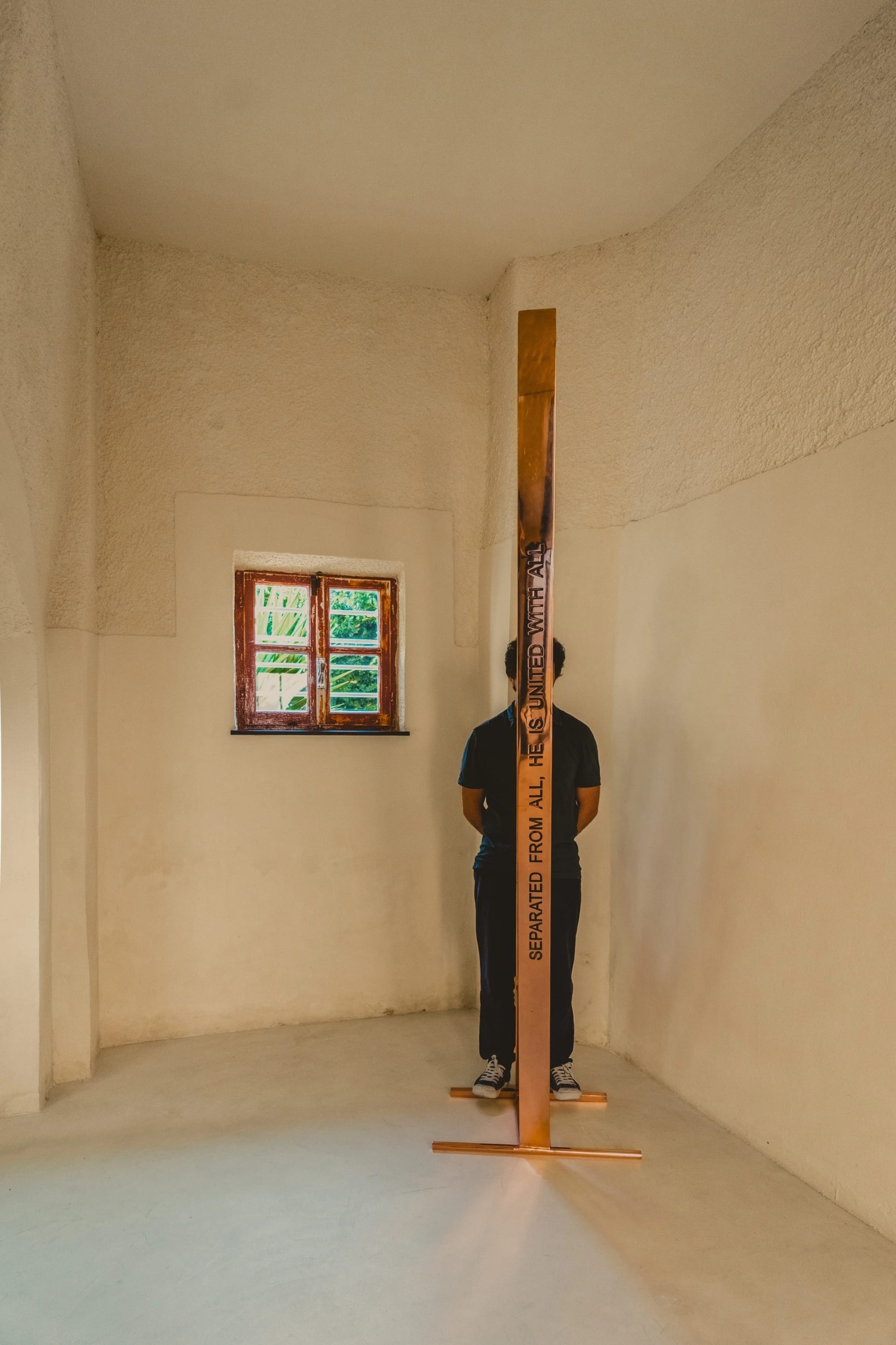 Francesco Arena presented in the small space of Aedicula Raffaella Cortese in Albisola Superiore a new copper sculpture that lives only when it is accompanied by a person holding it up. If no one takes charge of its unbalanced center of gravity, it lies on the ground without showing the writing that hides under the long side. Separated from all, he is united with all is a quote from The Brothers Karamazov; it is a sentence spoken by Zosima to the two. Zosima is a starec, a sage who assumes the role of a spiritual guide, a father of faith always ready to show the way and give advice. And it is precisely this figure – which has been popular since the Eastern Christian monasticism of the fourth century – that inspired Arena to think of the new work, which takes precisely the title Starec. It is a copper triangle with an obtuse angle, which can stand stably when stretched out on its long side, but needs a counterweight to keep it from falling when lifted up and resting on its short side. The message on the bottom is therefore only usable if someone makes a commitment to it, correcting this distortion by taking on its impermanence.
