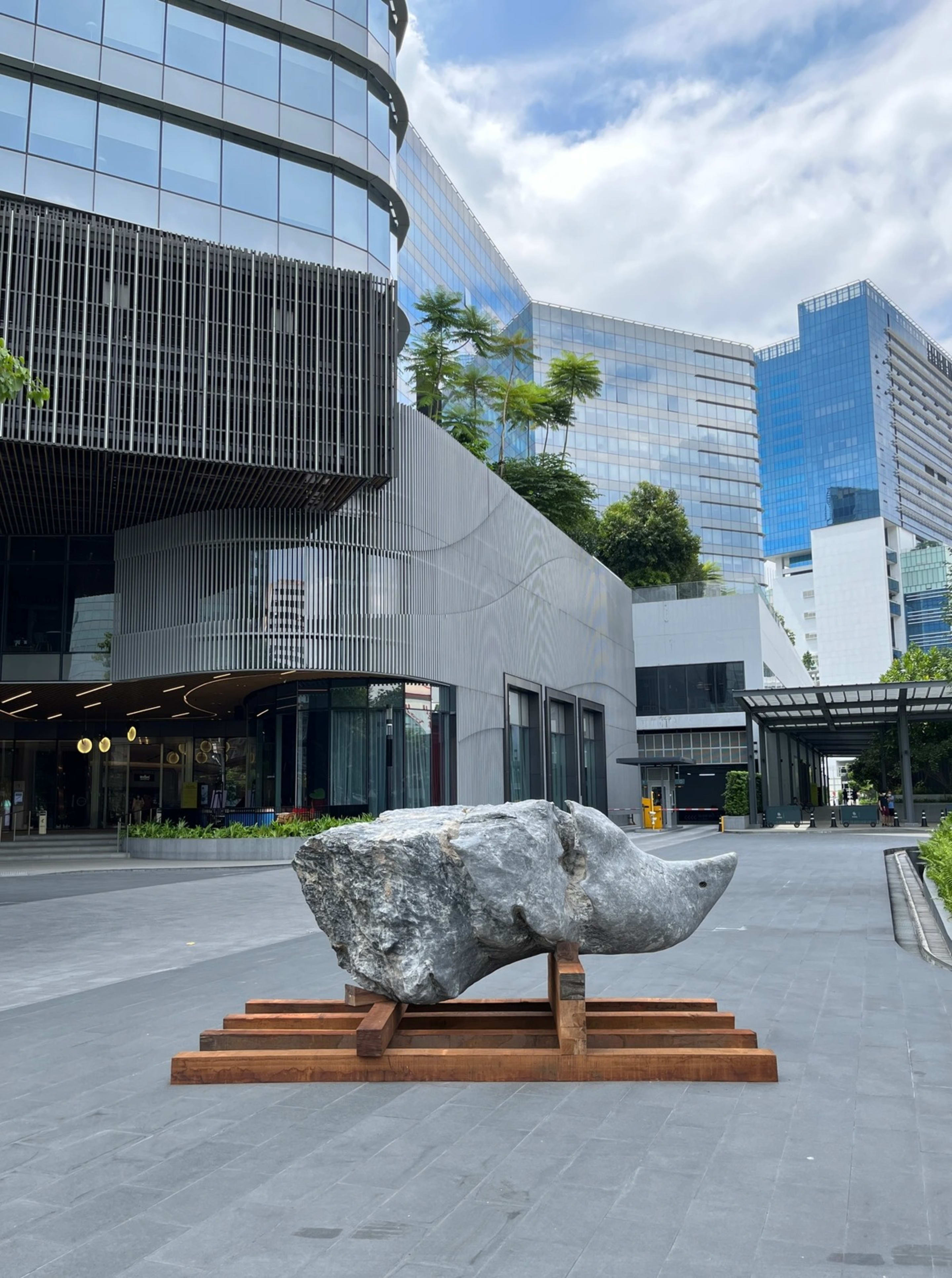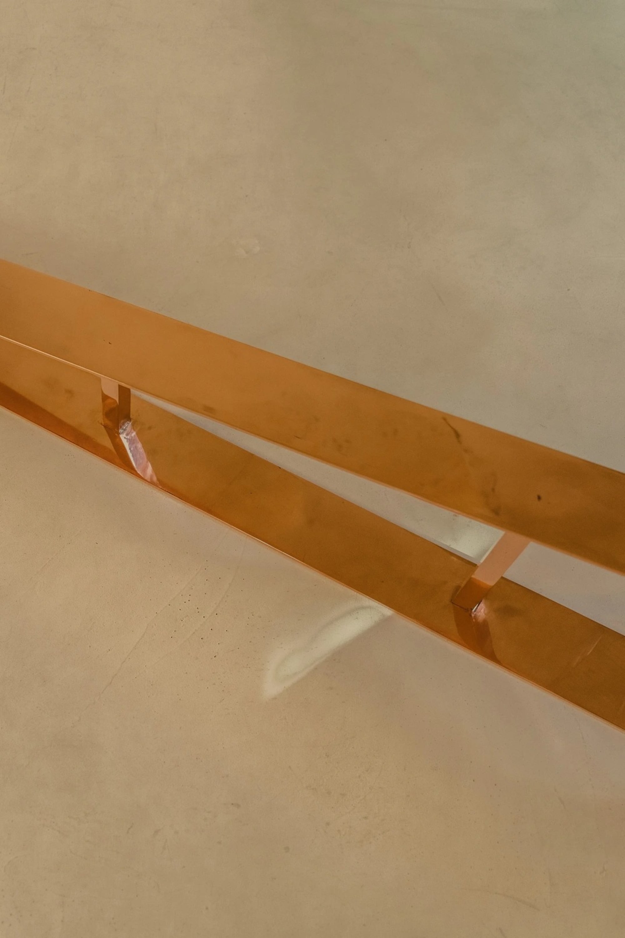 Titled Lo Starec, it consists of an obtuse-angled copper triangle. When it's laid flat on the longer side, it can stand upright with stability. If lifted and placed on the shorter side, it requires a counterweight to prevent it from falling, as the center of gravity is unbalanced. The message inscribed on the bottom becomes accessible only if someone commits to it, correcting its distortion, and taking on its impermanence.