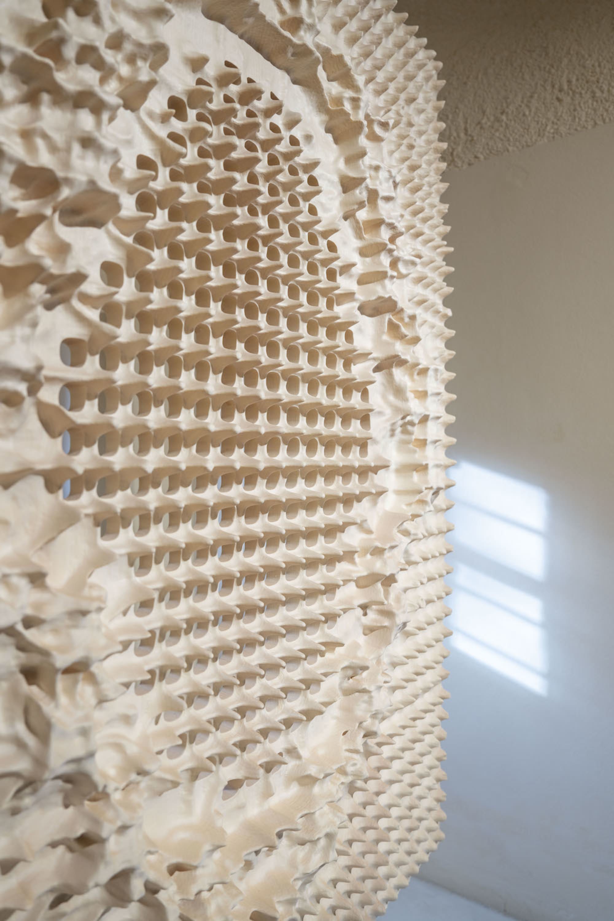 At the core of the research lies the concept of “translation”: what happens when one medium is transposed into another? What is lost, what is transformed, and which new properties come to light? Within the silhouette of the head, there are not two eye openings but a multiplicity of holes. This choice opens up a reflection on identity: who we are, and how many different identities coexist simultaneously within each of us.