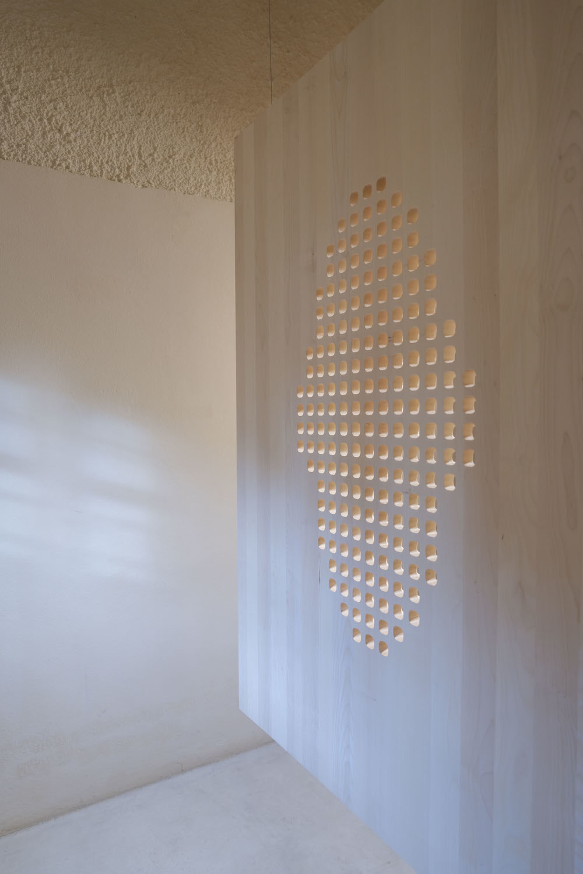 The resulting luminous image is fixed photographically, marking the transition from the material to the immaterial. The data from the photographic image are then transferred to a machine — a 3D wood milling machine — which once again returns the image in the form of matter. The lighter areas correspond to raised sections, while the darker ones indicate depth.