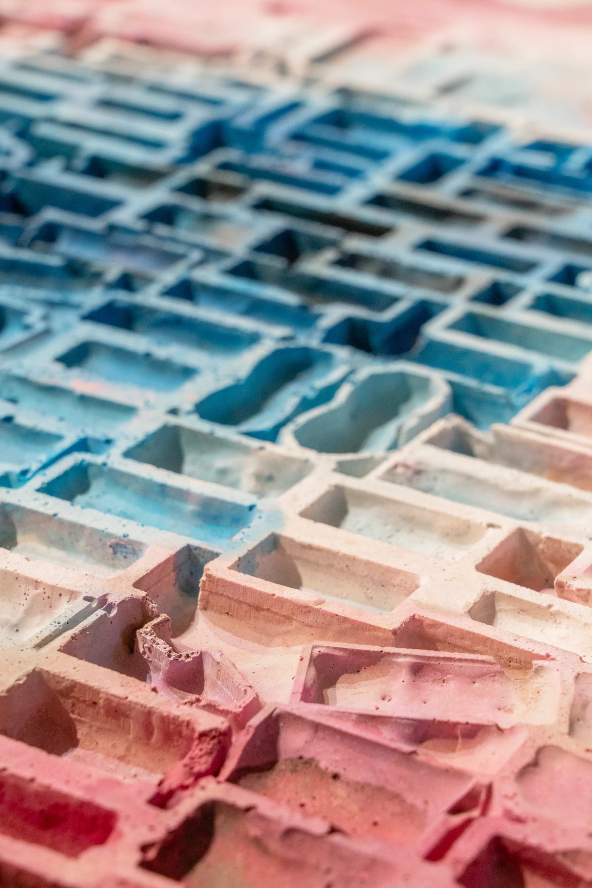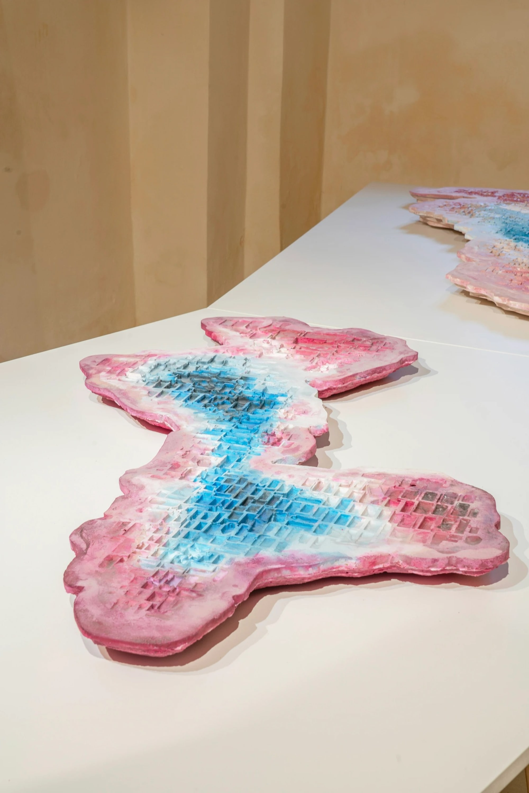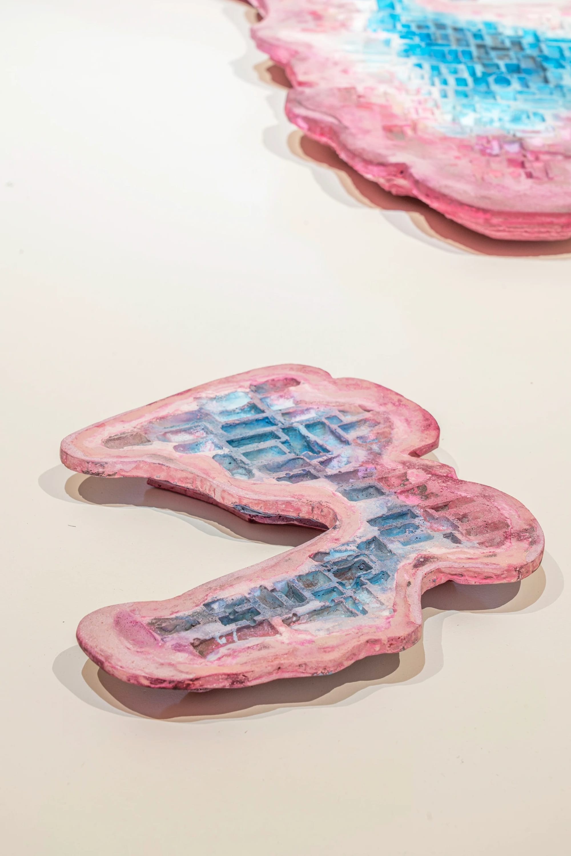 In the series of large sculptures Lakes Drying, Tides Rising (2022), Ansarinia reassembles the water voids of the Jordan neighbourhood in Tehran, previously explored in the Connected Pools series. The result is an irregular, honeycombed lake— an evocative representation of the fragile balance between wetness and dryness, not only of the city’s pools but, more broadly, of the entire country. In recent years, amid droughts and severe power shortages in Iran, water has shifted from evoking nostalgia for a prosperous past to becoming a resource in crisis, with significant economic and social repercussions. The shapes and colour palettes of the works reflect this tension: colours blend to create fluid, organic surfaces, reminiscent of moving currents. The layering process adopted by the artist recalls the formation and transformation of landscapes over time, shaped by wind and rain. The rust and ochre tones outlining the edges of the sculptures evoke the walls and divisions of pools, suggesting the presence of a carefully sculpted desert settlement. But, as with Lake Urmia, an open question remains: are these bodies of water drying up, or, on the contrary, is water beginning to flow again, bringing with it new hope?