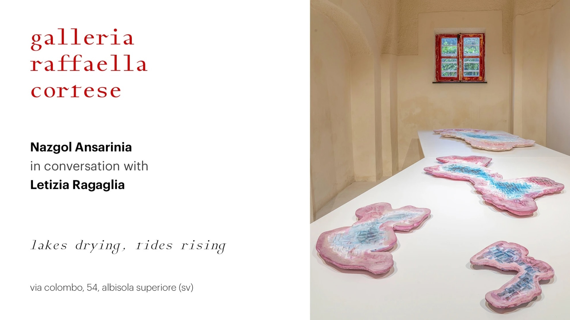 Galleria Raffaella Cortese presents Lakes Drying, Tides Rising in Albisola, a project by Nazgol Ansarinia (Tehran, 1979) that continues the research initiated with Pools and Voids (2020–2022) and analyses a crucial theme: water—or rather, its absence.