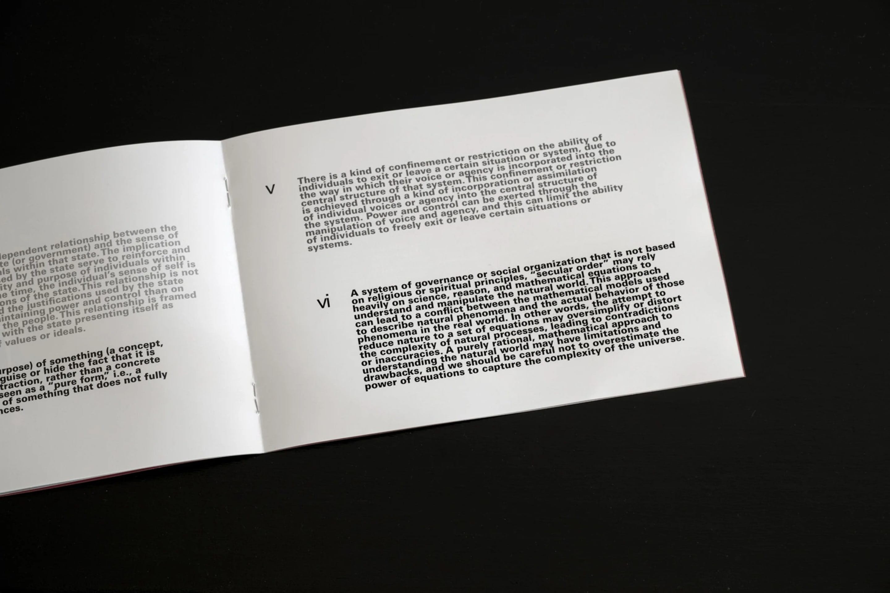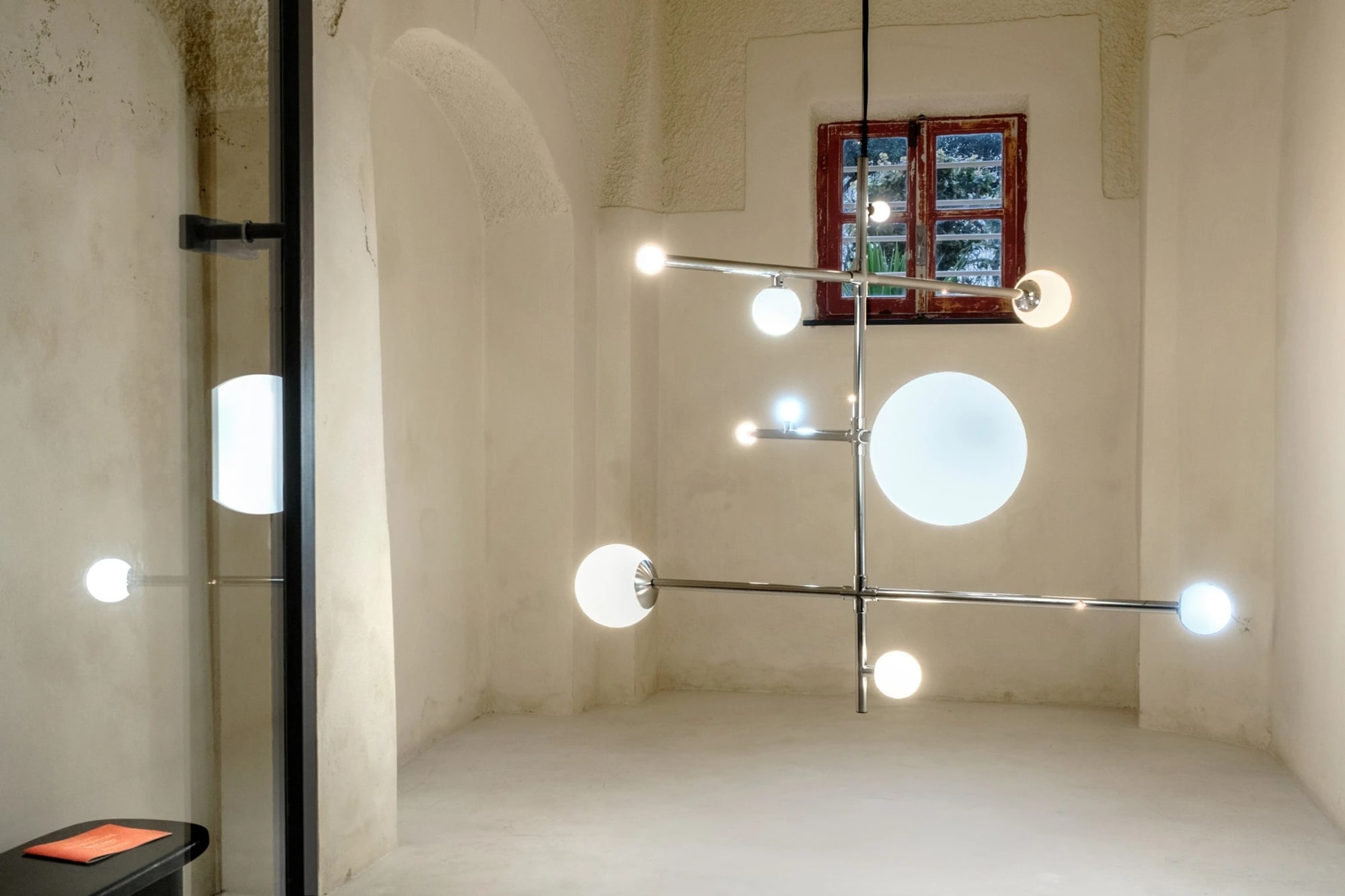 In Albisola Noah Barker presents lux principum (2023), a light constructed of marine grade stainless steel supplemented with an annotated design manual. The new work is intended for consultation by a potential sovereign seeking guidance in the medieval genre of “mirror for princes”. In substituting the furnishing of reflection for illumination, the light accounts for political structure in western democracies today.