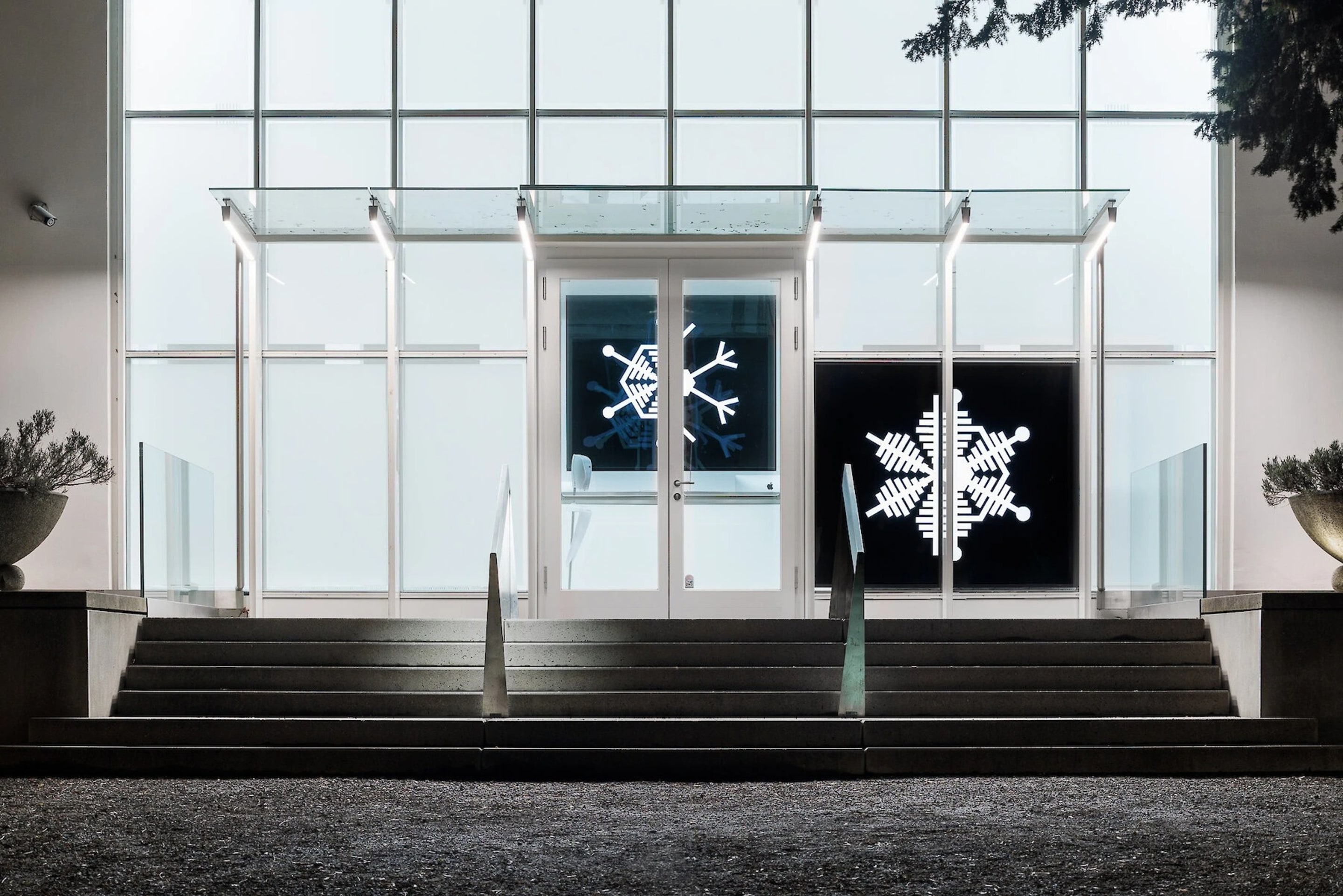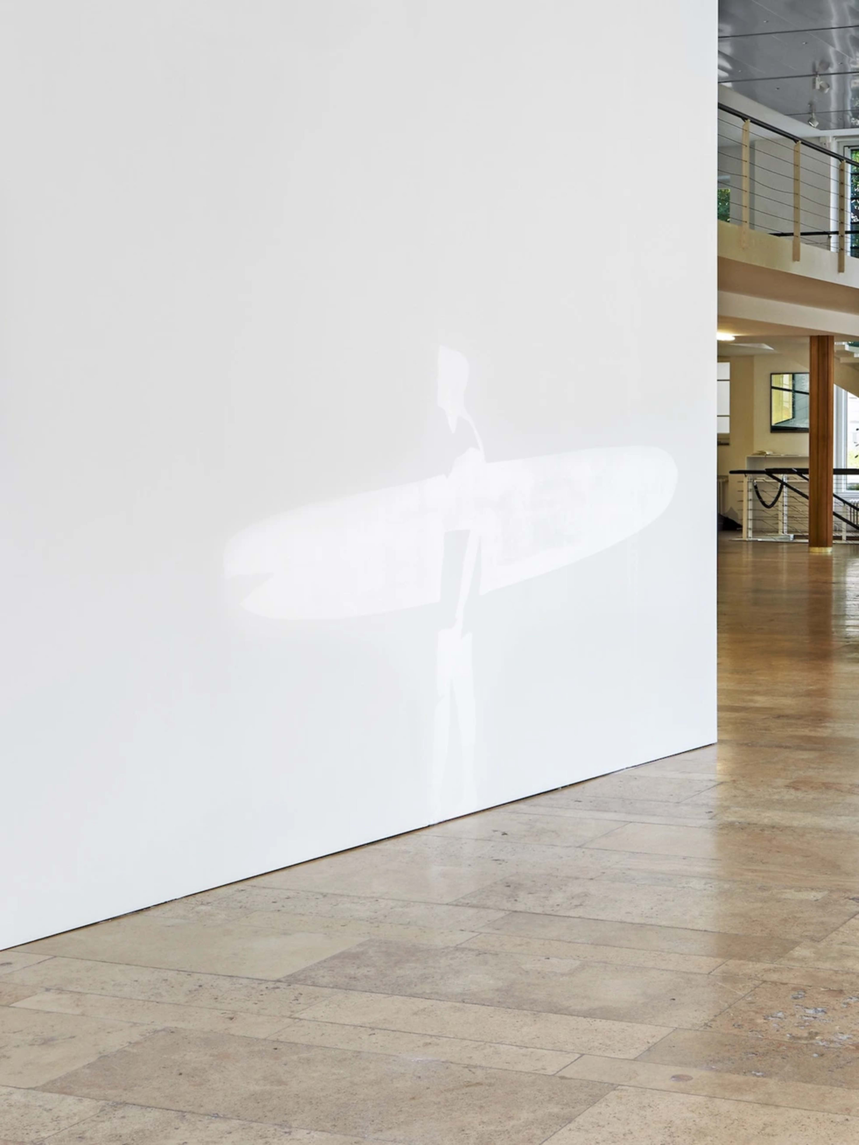 Lighting, screens, and reflective murals are frequent in Barker’s work, raising questions