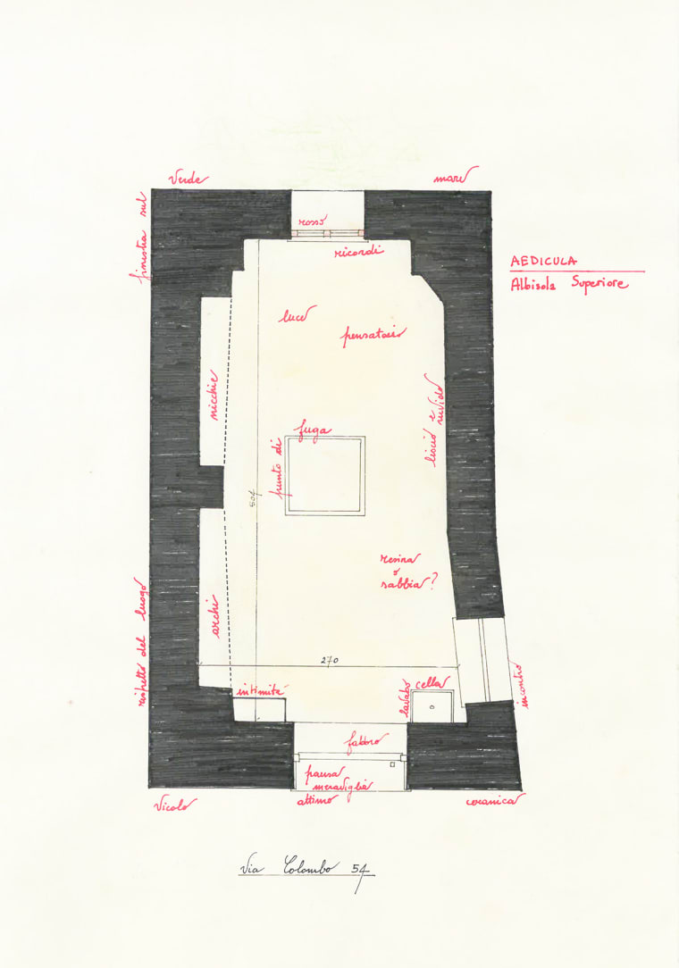 Saranno gli artisti, come sempre, a definire quella che ho voluto chiamare Aedicula pensando alle numerose statue sacre agli angoli delle case liguri. Vorrei che la stanza avesse una dimensione materiale e spirituale, richiamando gli sguardi dei passanti distratti. Mi sono chiesta, attraverso questo incontro fugace, se le persone potessero concedersi una pausa di gioia e di vicinanza all'arte. Ho creduto che sì, avrei tentato di raggiungere Aedicula con alcuni amici appassionati d'arte e amanti del mare, possibilmente con il telo sottobraccio, sedermi con loro sulla sabbia, notando le stranezze della Liguria, terra di grandi artisti, poeti e cantautori. Ho voluto ritagliare una nicchia ad Albisola, nel tratto che separa Genova da Savona, sicuramente non più conosciuta come una meta d'arte contemporanea, ma ancora spontaneamente sensibile. Per questo motivo ho scelto di operare qui, di risvegliare anche solo un po' l'orgoglio di quello che è stato. An hour is a sea.