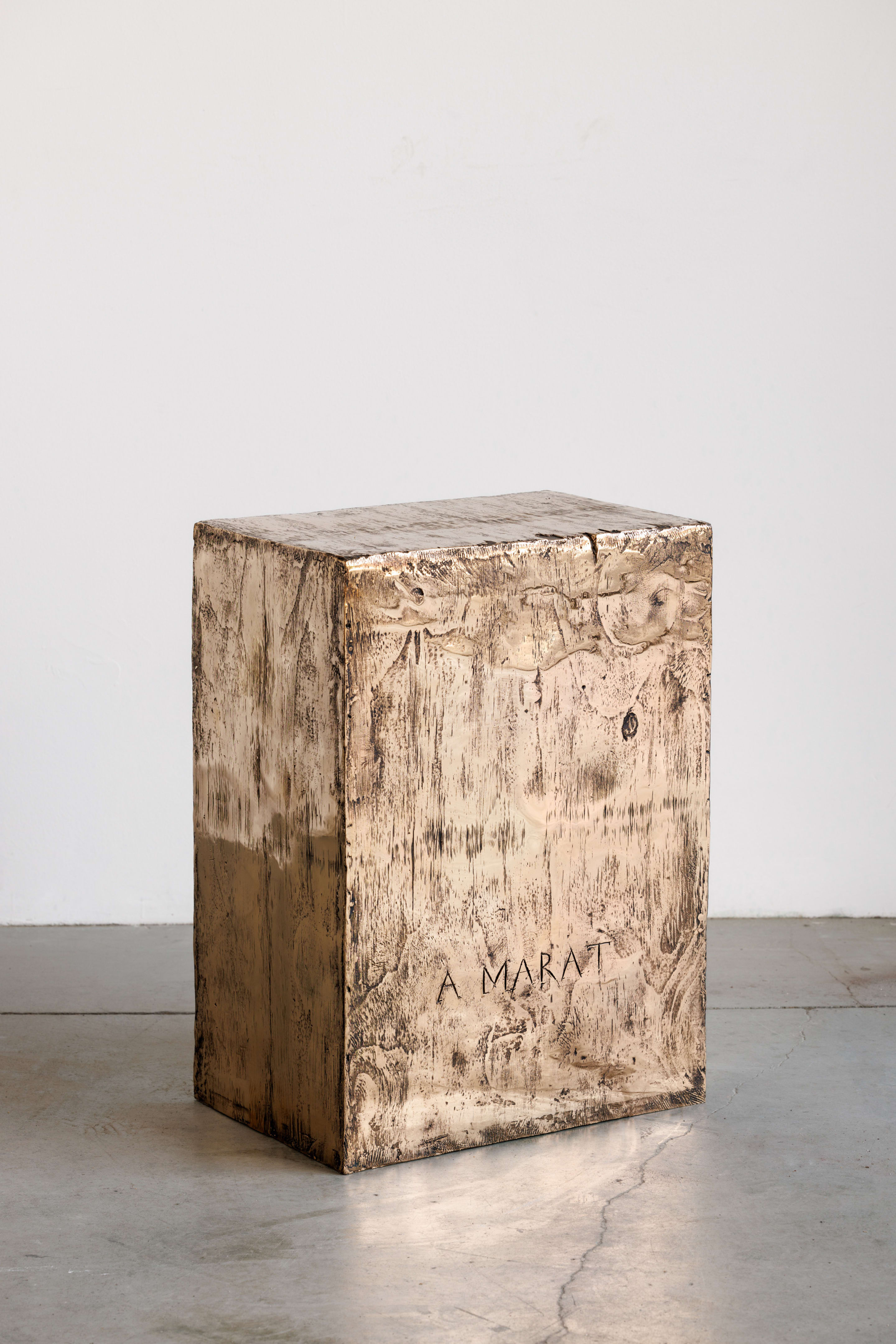 Cassetta, 2023 is the three-dimensional realization of the wooden box which is the focal point of the painting La Mort de Marat by Jaques-Louis David from 1793, in the painting this old wooden parallelepiped is used by the murdered Marat as a support for the sheets and the inkwell he used to write while he was immersed in the bathtub. David's painting is preserved at the Musées Royaux des Beaux-Arts de Belgique. The mirror-polished bronze sculpture reflects everything that is around the work, sucking it into it, making it almost invisible.