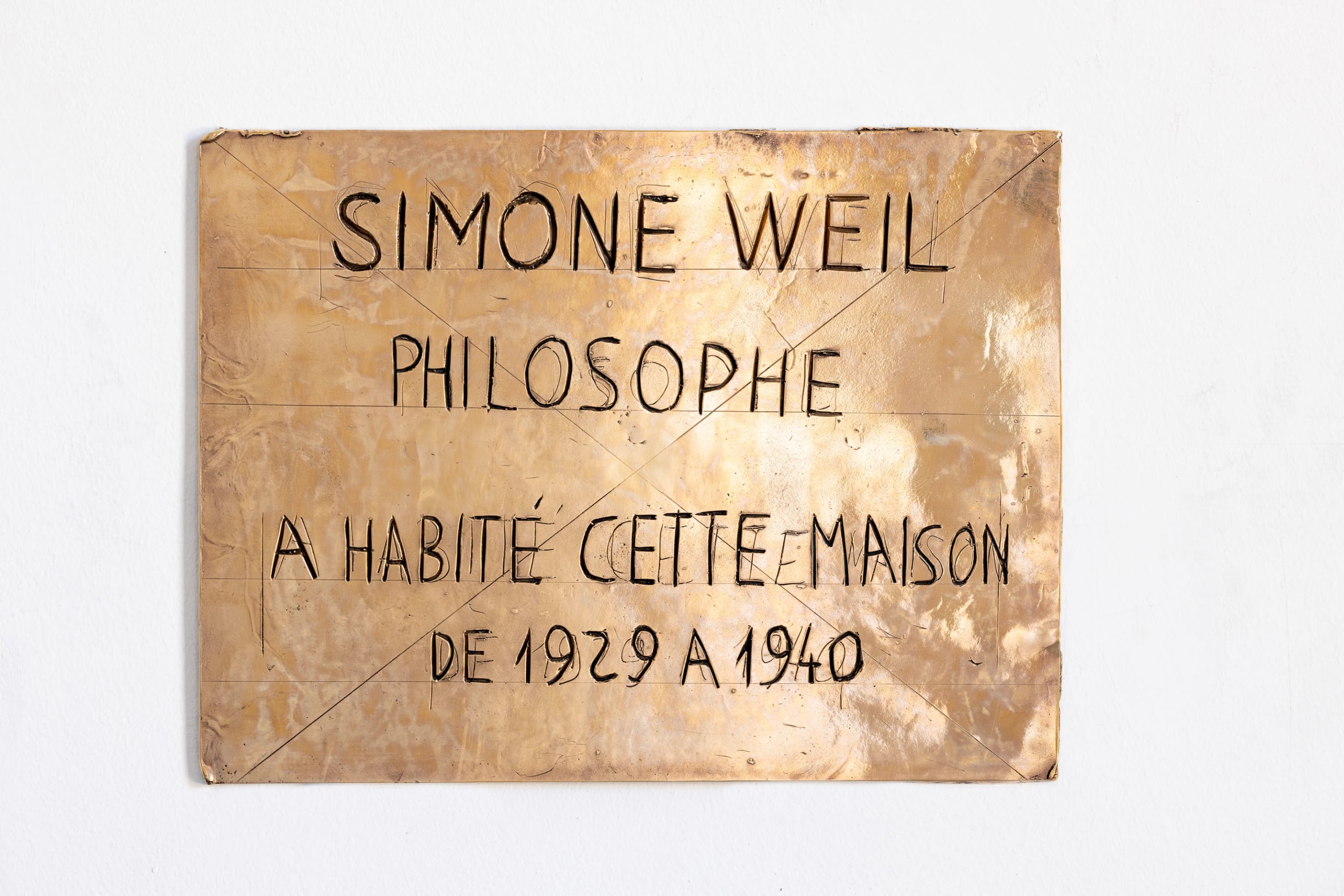 As in Arena's series of multiform portraits, Simone, 2025 depicts French philosopher Simone Weil in the bronze plate signaling the years she spent in Rue Auguste Comte in Paris.