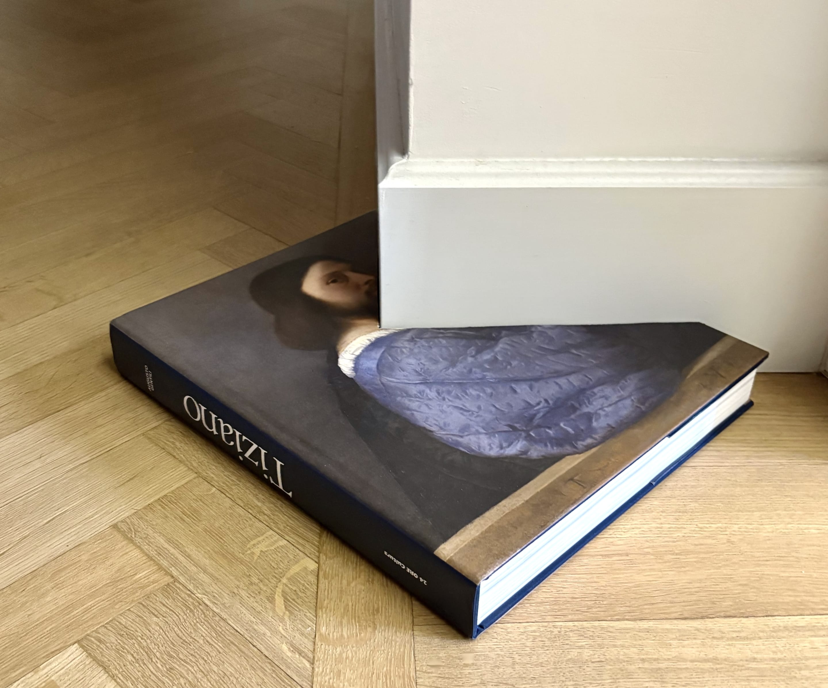 The works appear as installation objects, composed of catalogs of ancient art — including Titian, Cimabue, Giorgione, and others — cut and placed on the ground and marked by angular cuts, becoming an integral part of the hosting architecture. The books thus become the foundations of the place, as if they were a necessary element of construction — a load-bearing brick, yet one imbued with culture.