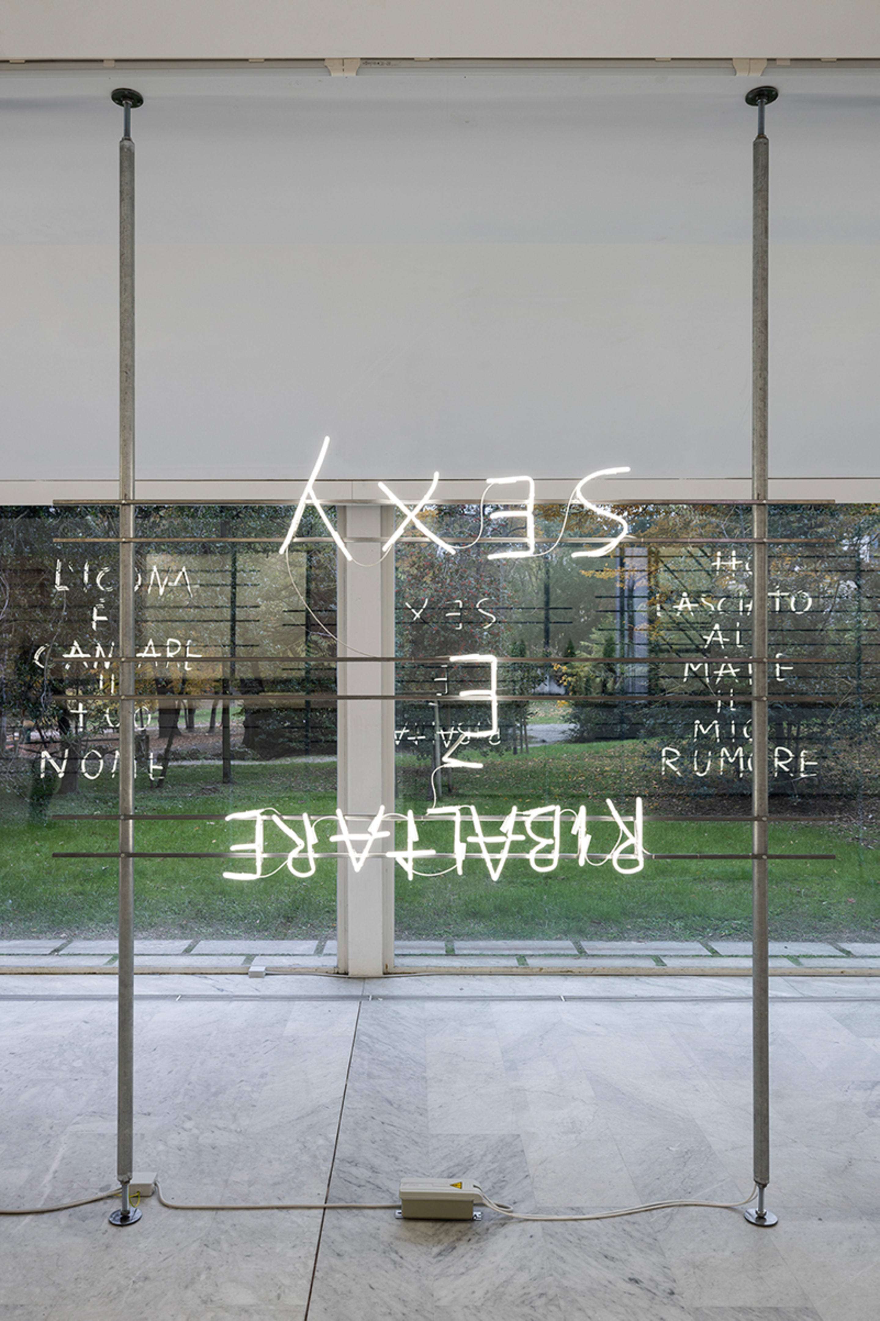 Monica Bonvicini emerged as visual artist and started exhibiting internationally in the mid-1990s. Her multifaceted practice—which investigates the relationship between architecture, power and gender—is translated into works that question the meaning of making art, the ambiguity of language, the limits and possibilities attached to the ideal of freedom, in a dry-humored, direct tone imbued with historical, political and social references.