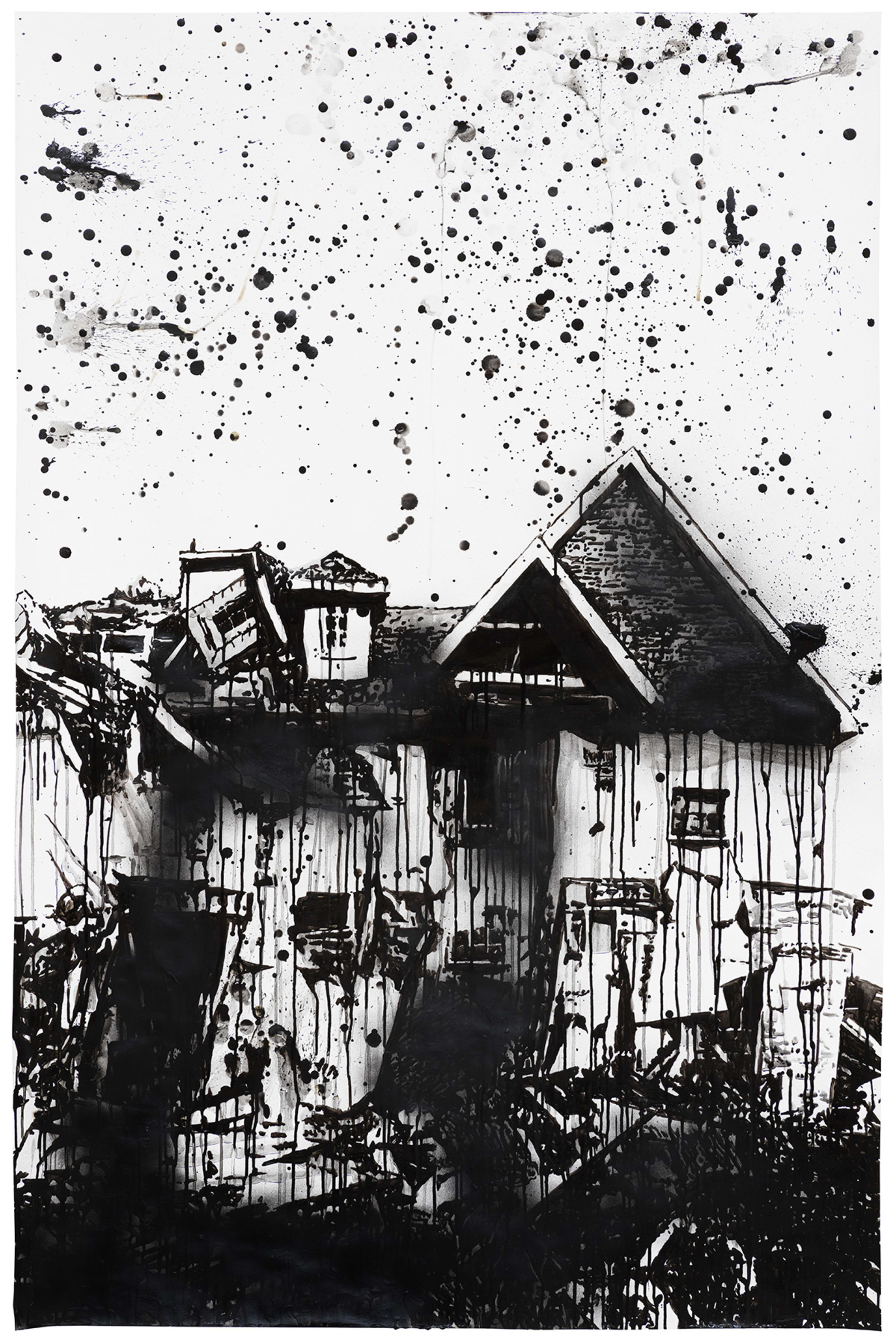 Monica Bonvicini emerged in the mid-1990s with a multifaceted practice examining architecture, power, and gender. Her Hurricanes and Other Catastrophes series are large-scale black-and-white drawings reflecting on climate-driven destruction and its social implications.