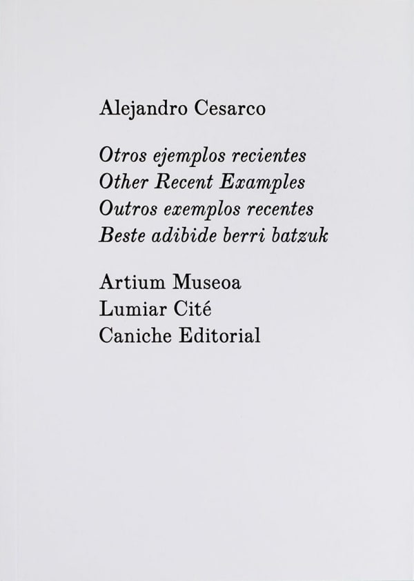 Recent solo exhibitions include: Other Recent Examples, Lumiar Cité, Lisbon, Portugal (2023); Otros ejemplos recientes, ARTIUM, Vitoria, Spain (2023); The Ongoing Story, Galleria Raffaella Cortese, Milan (2022); Todo en negro, los ojos cerrados por el exceso del desastre, Fotogalería Teatro San Martín, Buenos Aires (2021); Alejandro Cesarco, a solo exhibition, Witte de With Center for Contemporary Art, Rotterdam (2019); Aprendiendo el Lenguaje, Museo Amparo, Puebla, Mexico (2019); Tactics & Techniques, Contemporary Art Center, Vilnius (2019); Alejandro Cesarco. Apprendre la langue (présent continu I), Jeu de Paume, Paris and CAPC musée d’art contemporain de Bordeaux, Bordeaux (2019); Song, The Renaissance Society, Chicago (2017); The Inner Shadow, A Tale of a Tub, Rotterdam (2016); Prescribe the Symptom, Midway Contemporary Art, Minneapolis (2015); Secondary Revision, Frac Île-de-France /Le Plateau, Paris (2013); A Portrait, a Story, and an Ending, Kunsthalle Zürich, Zürich (2013); _Alejandro Cesarc_o, mumok, Vienna (2012); A Common Ground, Uruguayan Pavilion, 54th Venice Biennial (2011); One without the Other, Museo Rufino Tamayo, Mexico City (2011); and Present Memory, Tate Modern, London (2010).