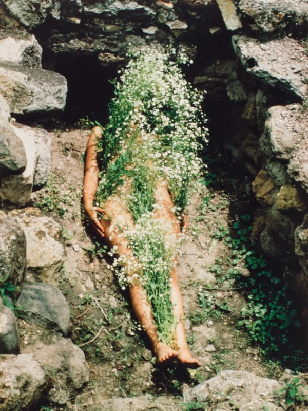 Ana Mendieta, among the most celebrated Cuban artists, was originally trained as a painter: she soon turned to filmmaking and photography, and later drawing and sculpture, in her short yet extremely prolific career. She established an exceptional personal synthesis of Body and Land Art through the introduction of the human and female body in the landscape. The realization of ritual performances, translated through all her media, steep her own body into nature, thus emphasizing her physical and spiritual link with the Earth. She traveled and performed between Iowa and Mexico, revealing her interest in the earth as a site to address issues of displacement by recording the presence of her body—or the imprint it left behind—within different natural elements and environments.