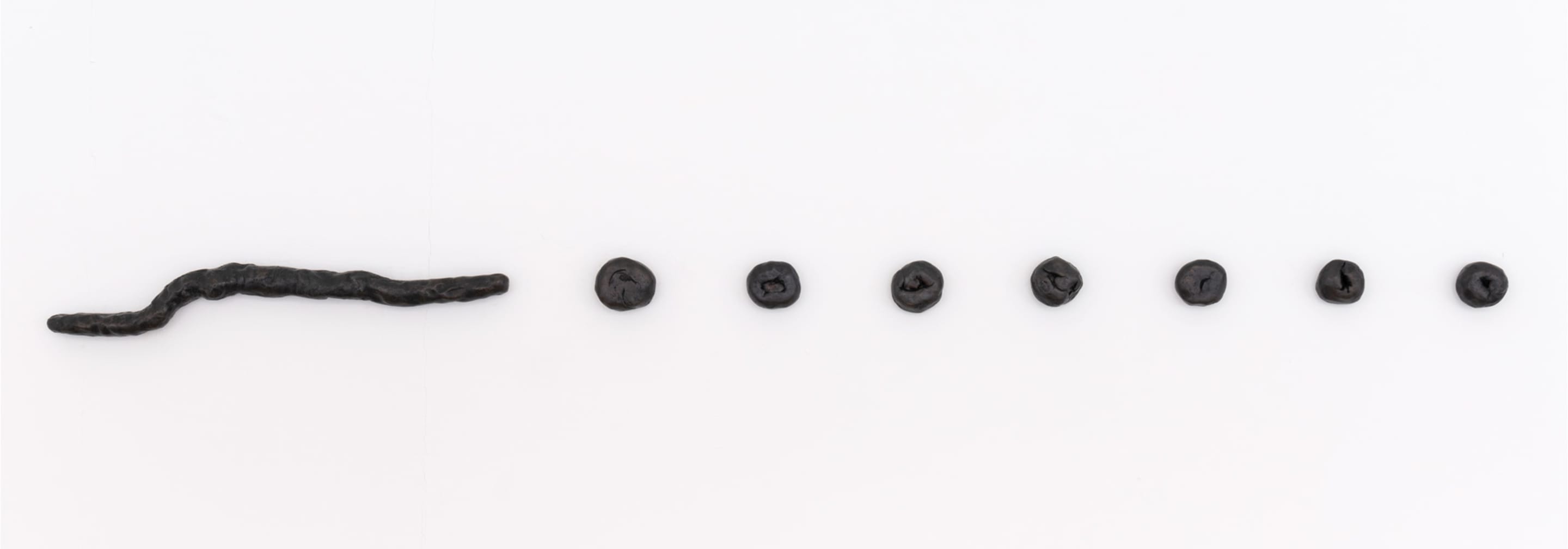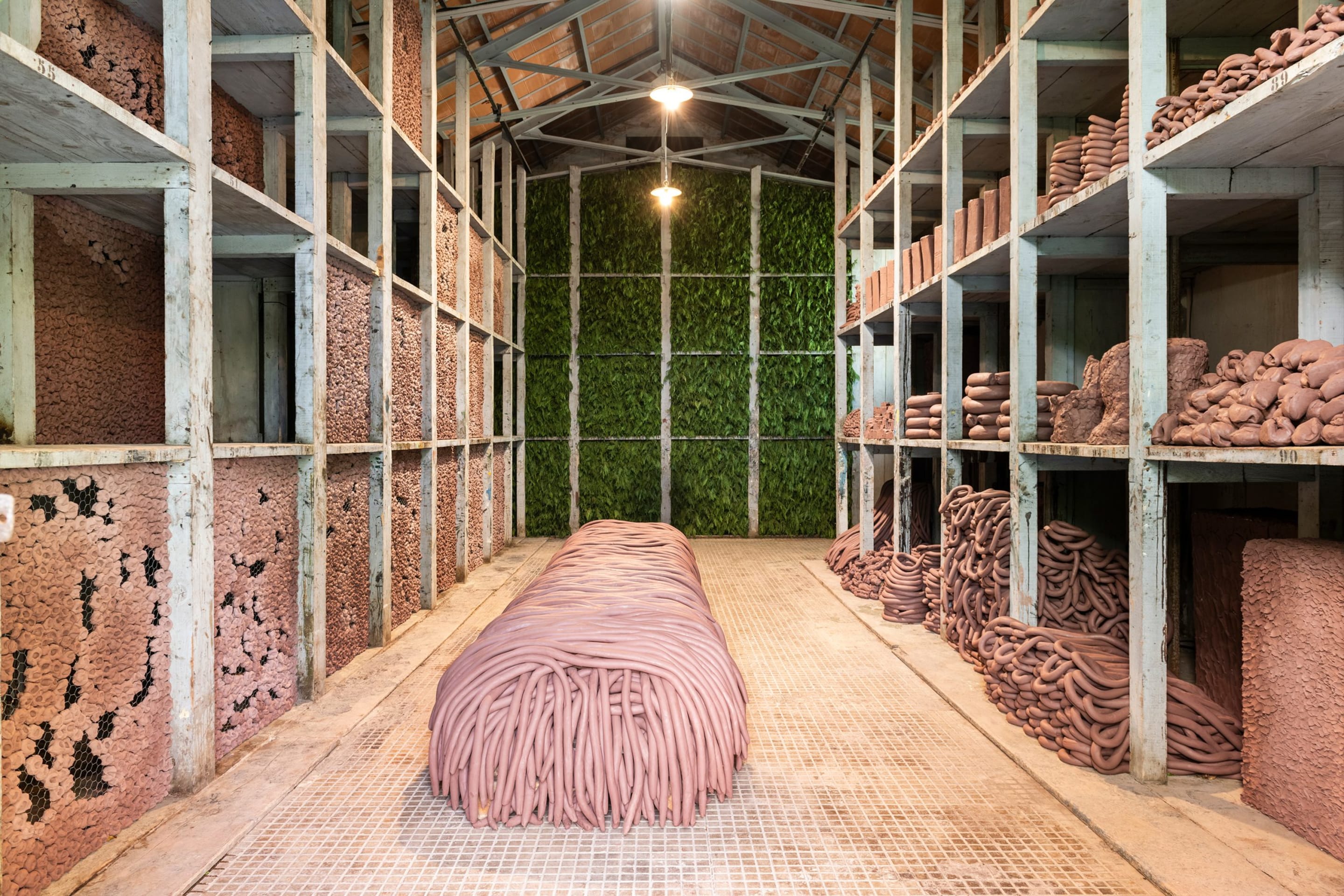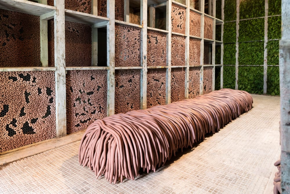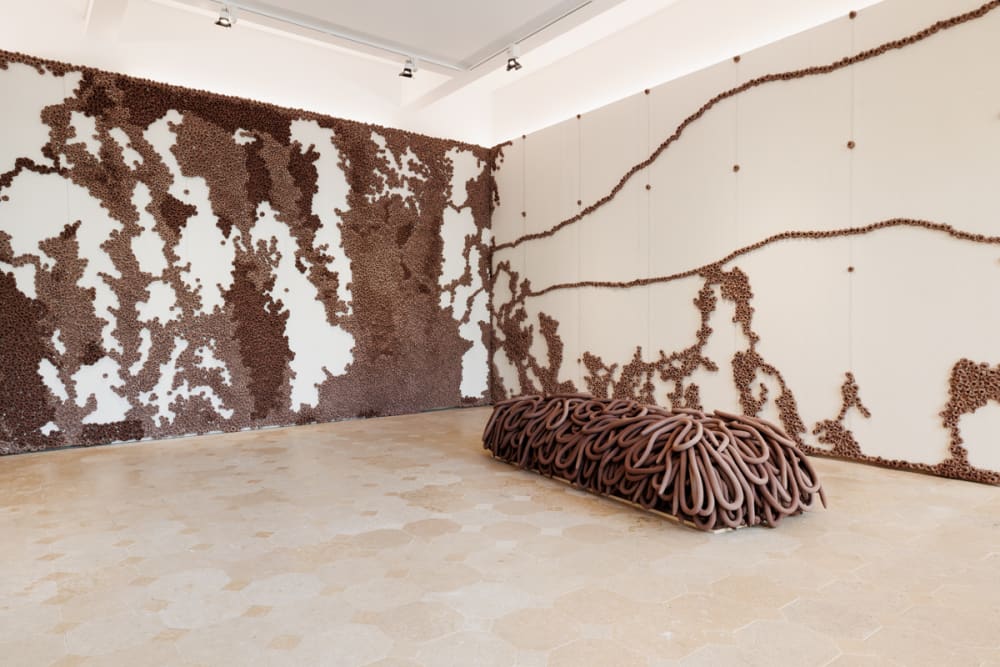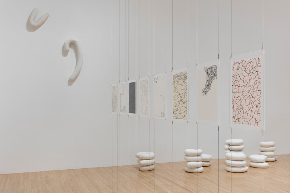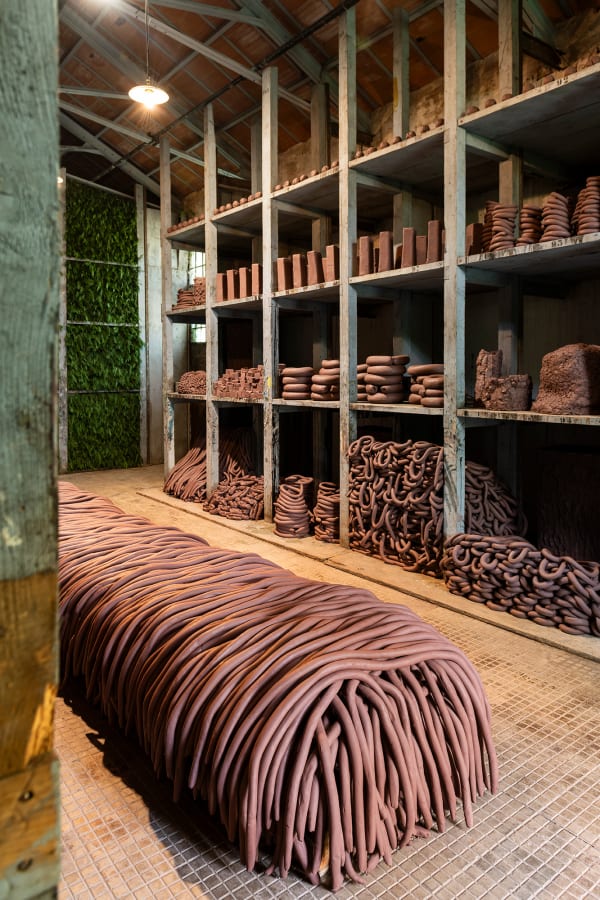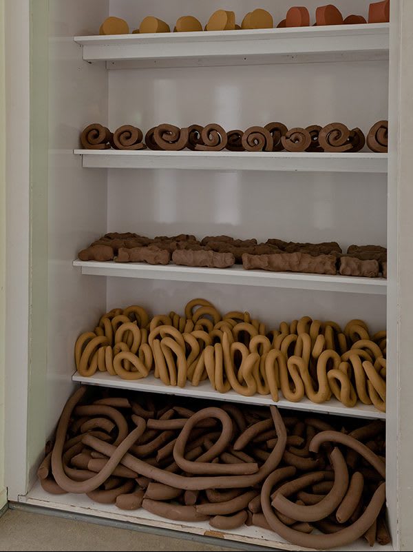Maiolino was involved in Brazil’s 1960s New Figuration movement: her representational prints and drawings from these years were acts of resistance to the national military regime, rising urban inequalities, and culturally ingrained patriarchy. She would later cultivate an interest in spatial and existential issues with a shift towards Minimalism and Conceptualism, creating installations that coaxed interaction between viewer and object. Since 1989, Maiolino has started working with clay, crafting impermanent labor-intensive installations that foreground her physical handling of the material, references to the unconscious and recurrent gestures of everyday life.