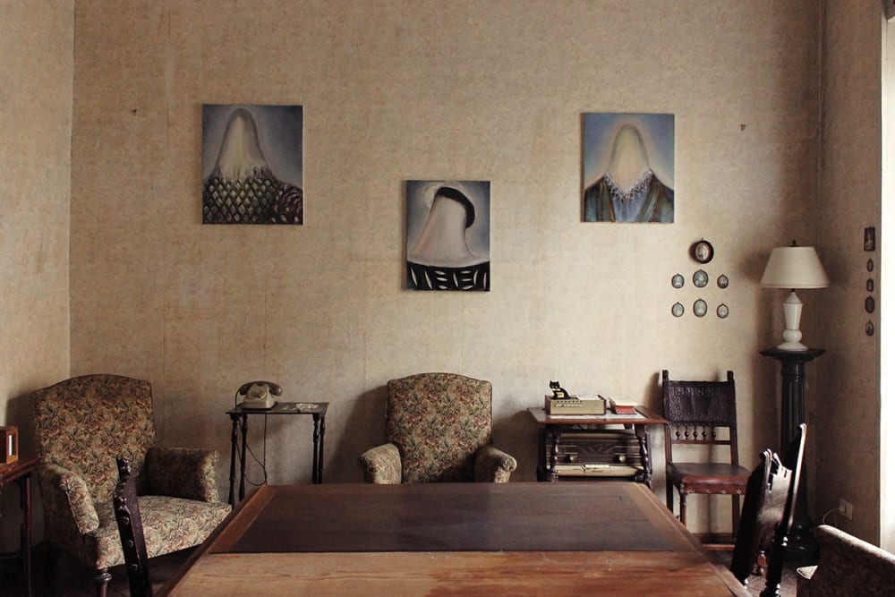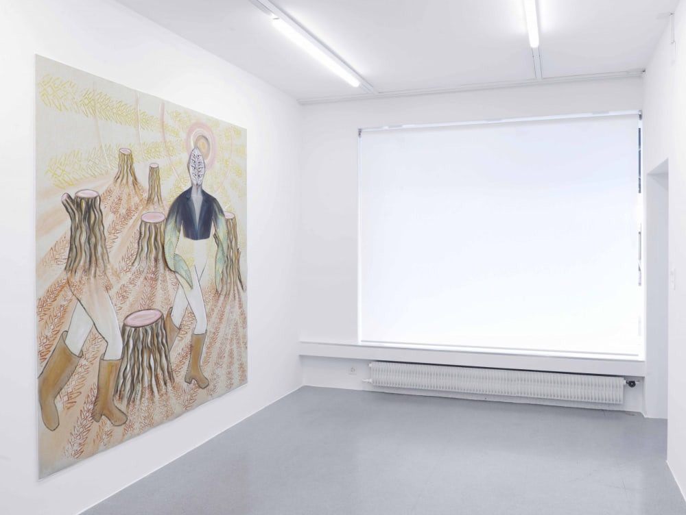 Her research often embodies fictional offshoots or parts of a narrative, where constellations of self-made costumes, mystic representations of animals and nature often seem like props, an abandoned stage set, or solitary protagonists of an unfamiliar yet compelling reality.