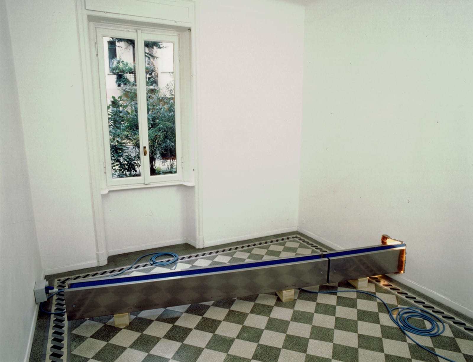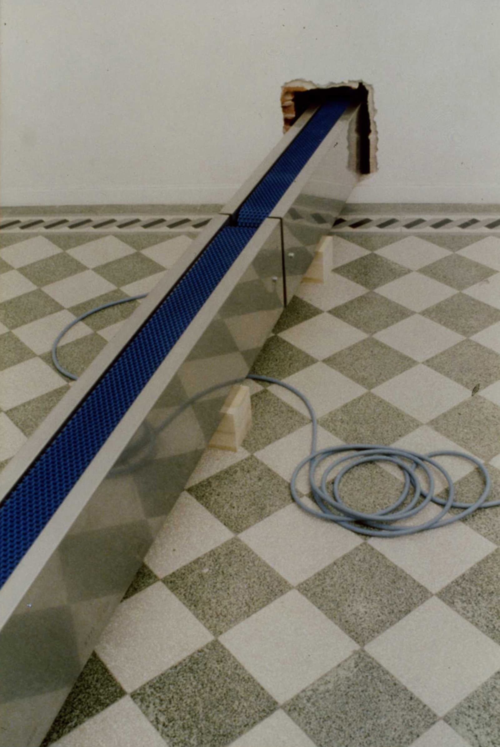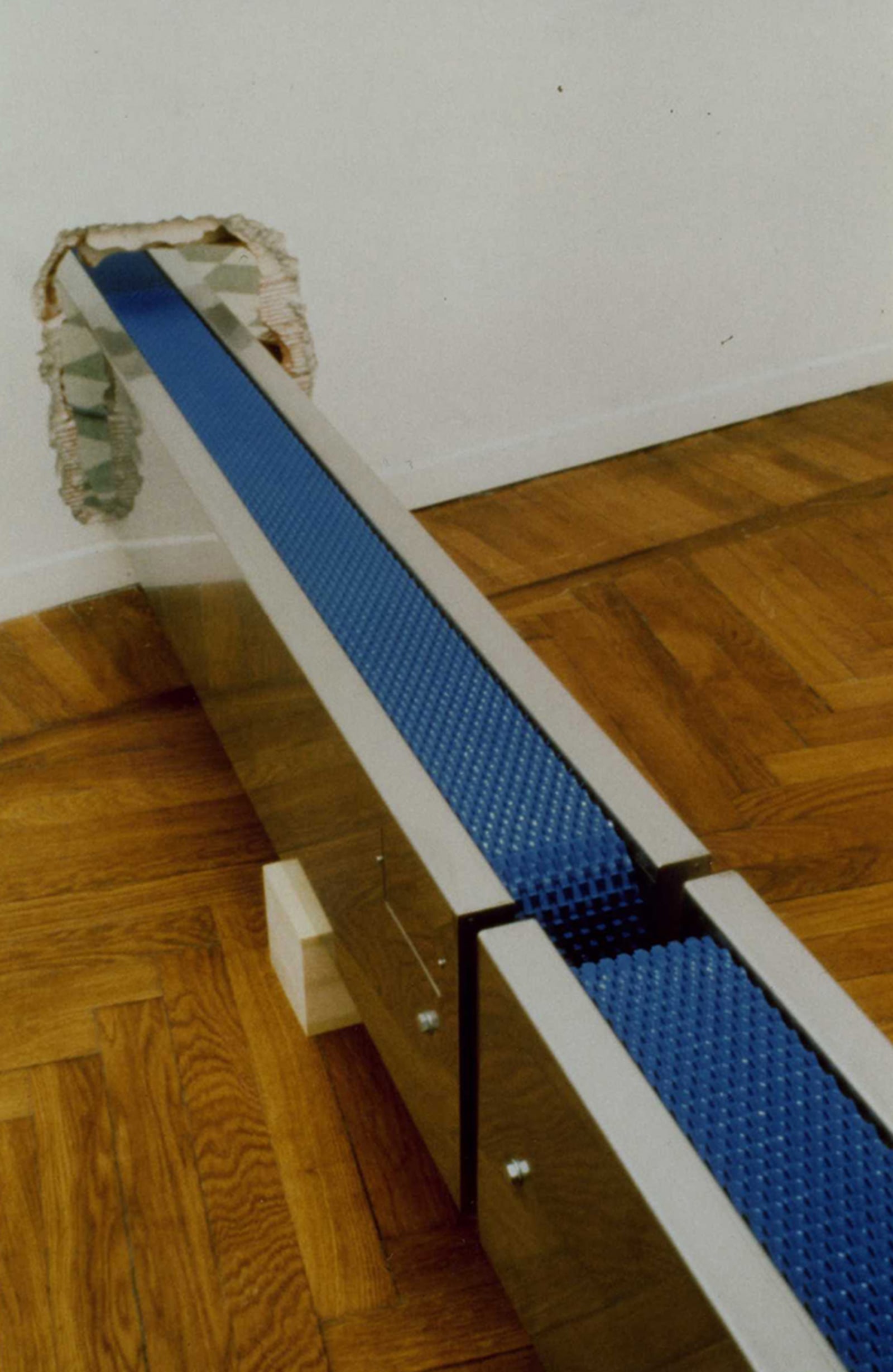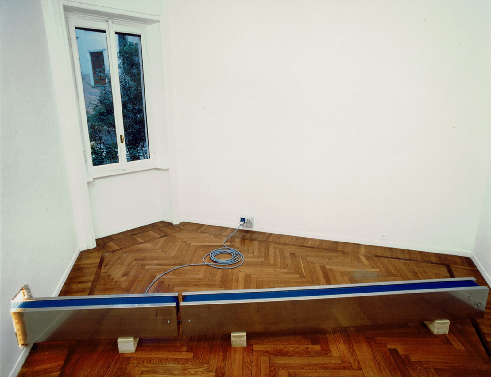 Umberto Cavenago’s work redefines the traditional concept of sculpture. The artist uses technology and industrial production methods, overturning their functional logic and subverting it to his own ends. For this current exhibition Cavenago has created an installation consisting of a conveyor belt made of stainless steel, 7.5 metres long, designed and executed according to industriai criteria. Ready to take its piace in the production of consumer goods, it is located in an art gallery rather than in a factory. The blue PVC belt does not carry goods but ideas; completely devoid of any practical utility, it exists through this profound tension, thus stimulating reaction and thought. In order to orient the work in accordance with the sun’s east-west trajectory in the sky, the artist has made a hole in the wall separating two of the gallery’s rooms. To see the installation in its entirety the viewer, accompanied by the vibrating sound produced by the movement of the belt, must go from one room to the other, being both physically and emotionally involved and reflecting upon the human condition in the industriai era and the function of art.