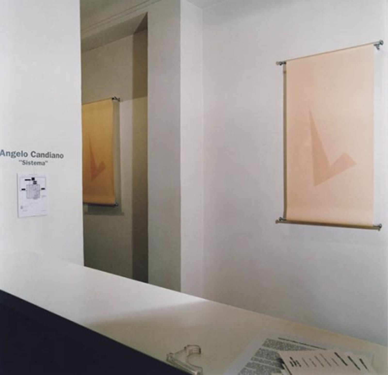 The installation, entitled “Sistema”, is the result of different experiences developed in recent years: Situazioni, three dimensional objects in photosensitive paper blackened by exposure to light; Carbon paper, which consists of photographs of Situazioni taken in the dark, producing only vague traces; Mutanti, works in which the top layer of paper is raised at its edge to reveal the pink photosensitive paper below, like skin; and, Semiosi, colour photographs of two-dimensional images projected by basic forms.