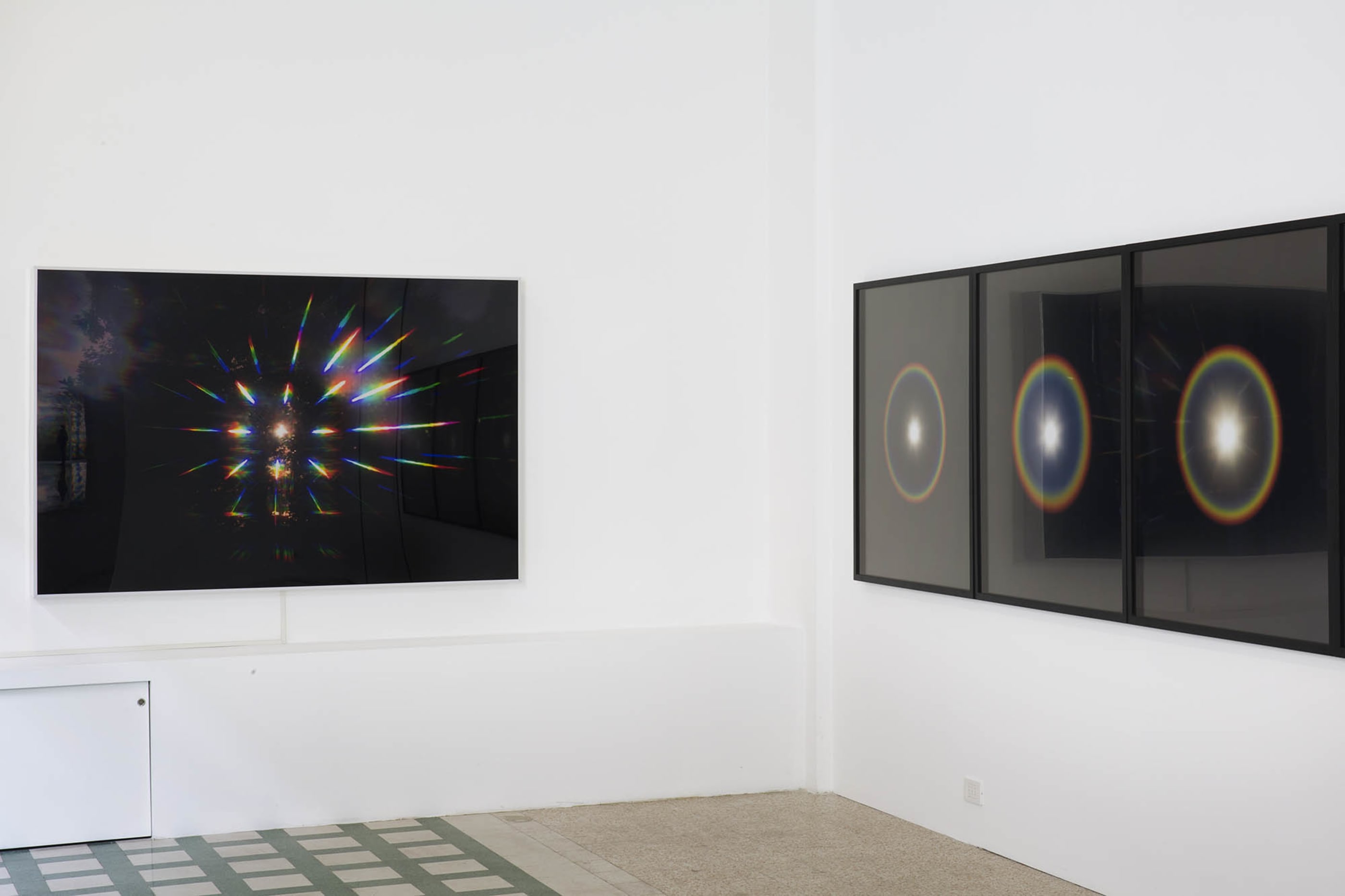 Rendered as lightboxes, the To Breathe works further investigate the architecture of color through surface, reflection and abstraction, while The Sun – Unfolded shows circles of spectral color taking shape in concentric waves around the sun, creating forms reminiscent of a mandala or the sun as a breathing body.
