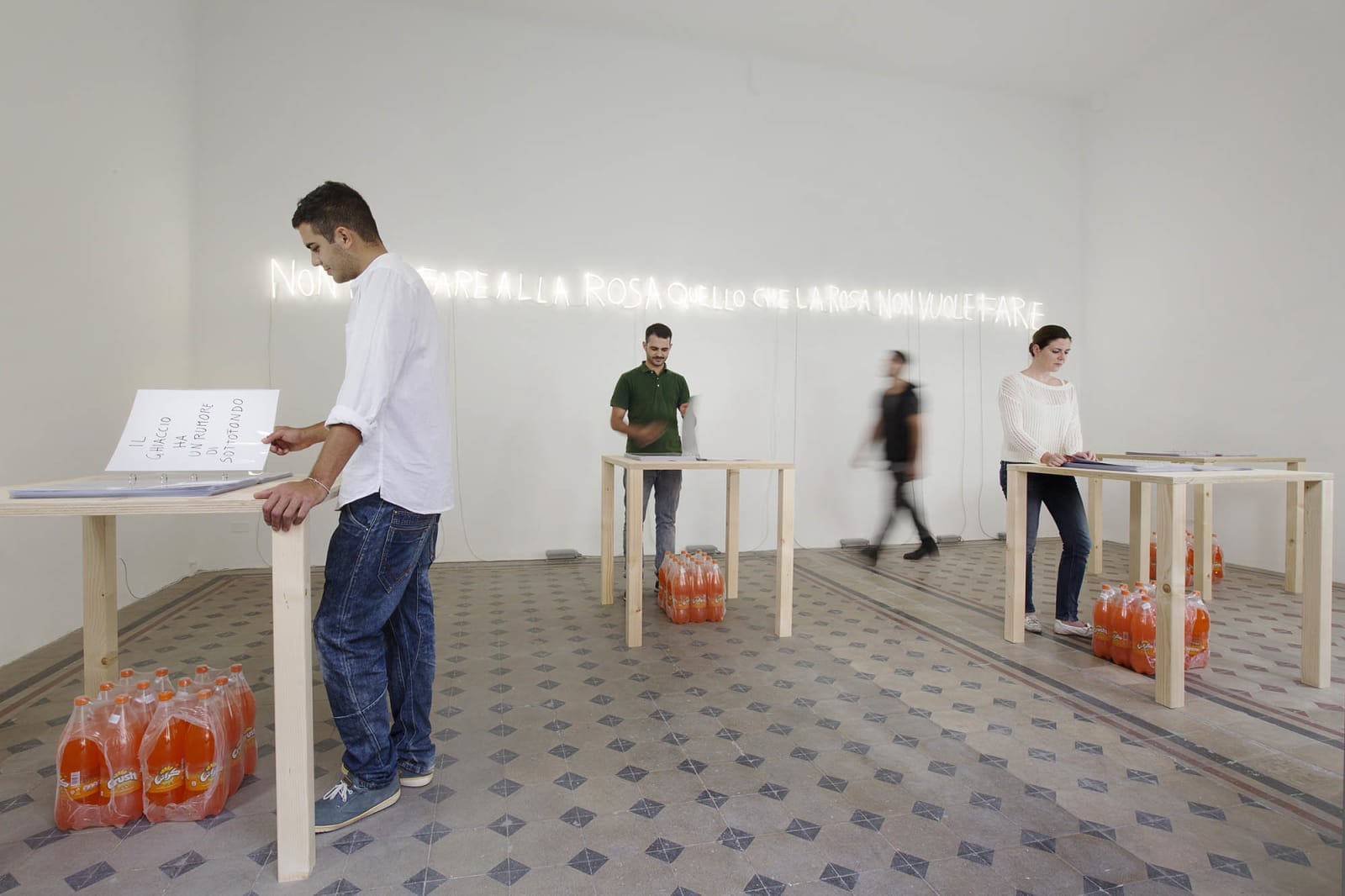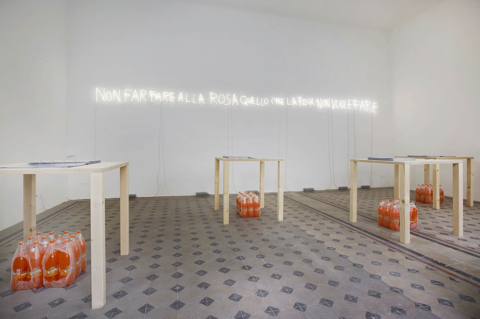 His artistic production reflects in a various and ironic way the multiple and conflicting aspects of the social reality in which we live, its variants, its interpreters, its moods. An eclectic artist, that through installations, often addressed in public spaces, establishes a direct empathy with the audience, while generating feelings of wonder and alienation. Author of dreamlike imagination – though unequivocally rooted in the collective culture – Maloberti creates works that emerge thanks to their physicality and energy, and produce a spontaneous theatrical impact.