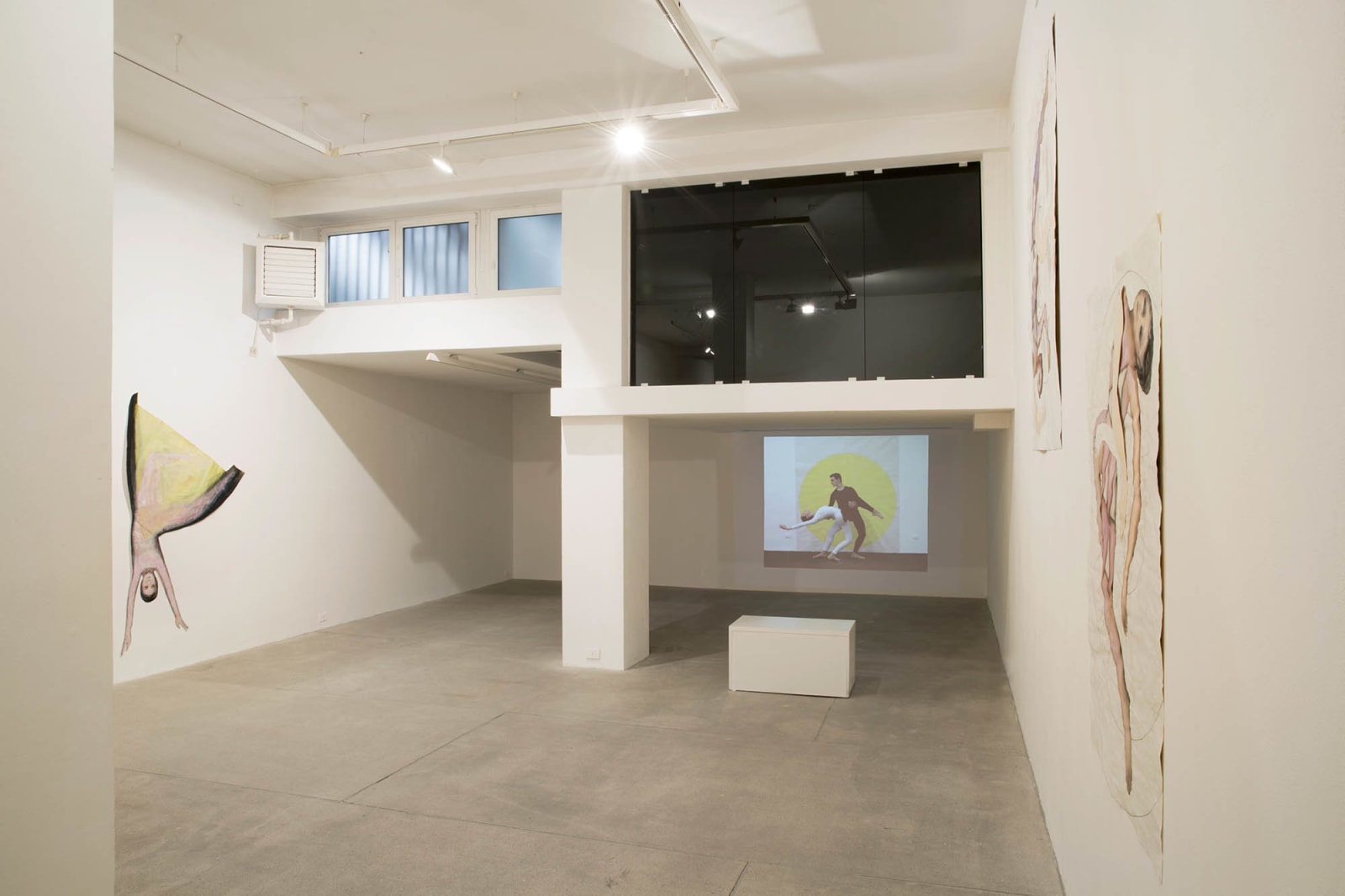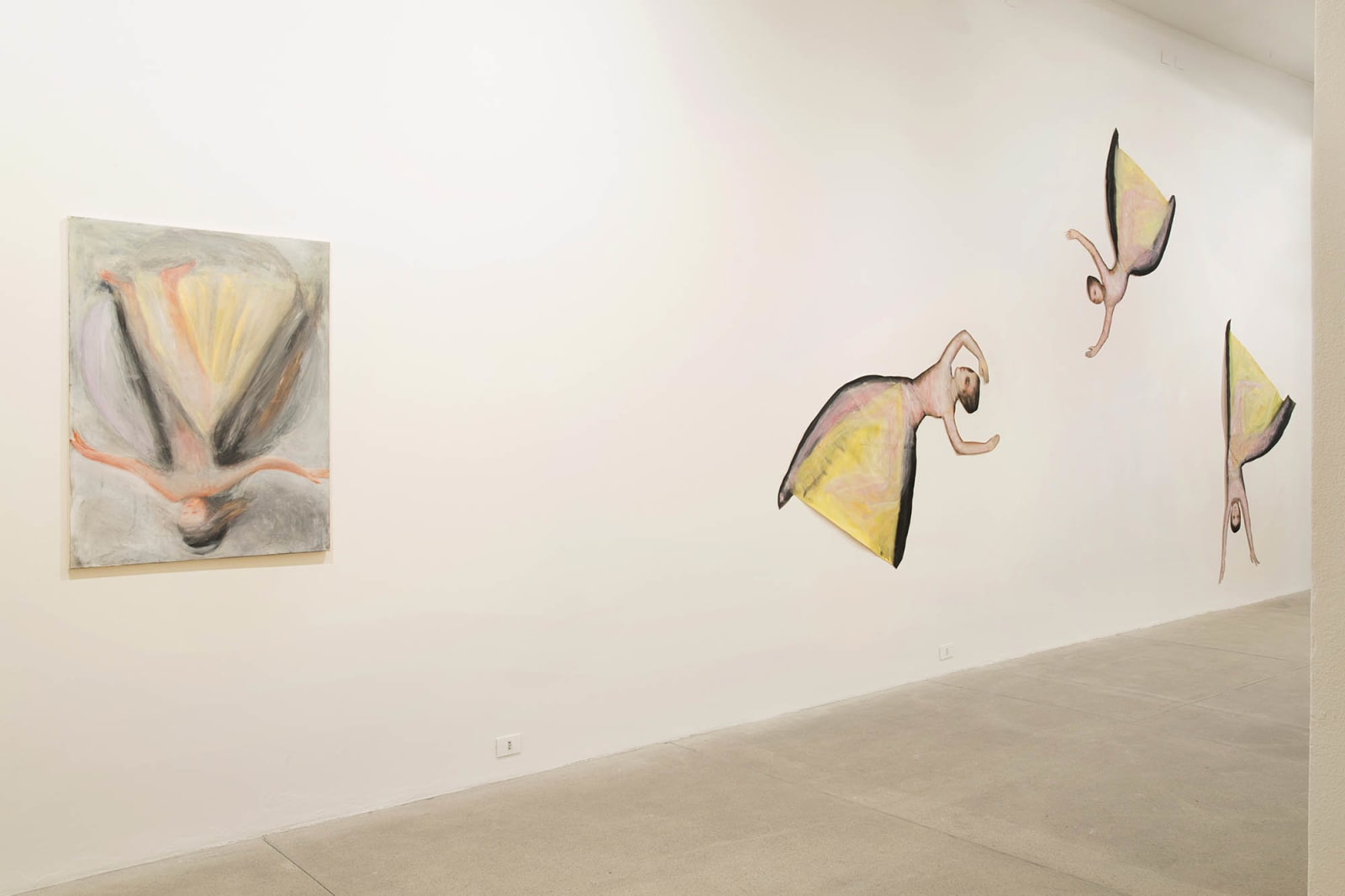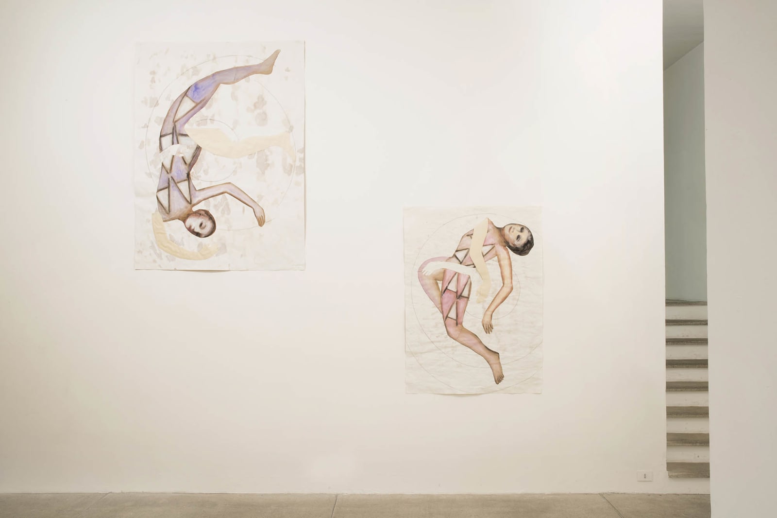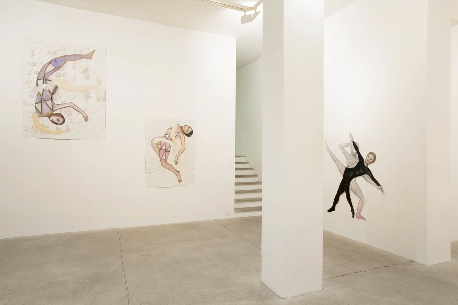 Mathilde Rosier’s current show is influenced by her years of experience with dance and physical gestures in relation to the narrative representation of space and time. Having dedicated much of her art practice to the investigation of a possible fusion of the animal realm and the human being, her most recent research is focused on the human figure, especially on the representation of movement. In her latest works she underlines her will to give life to paintings and collages usually strictly related to her performances where sound, body and action combine all together.