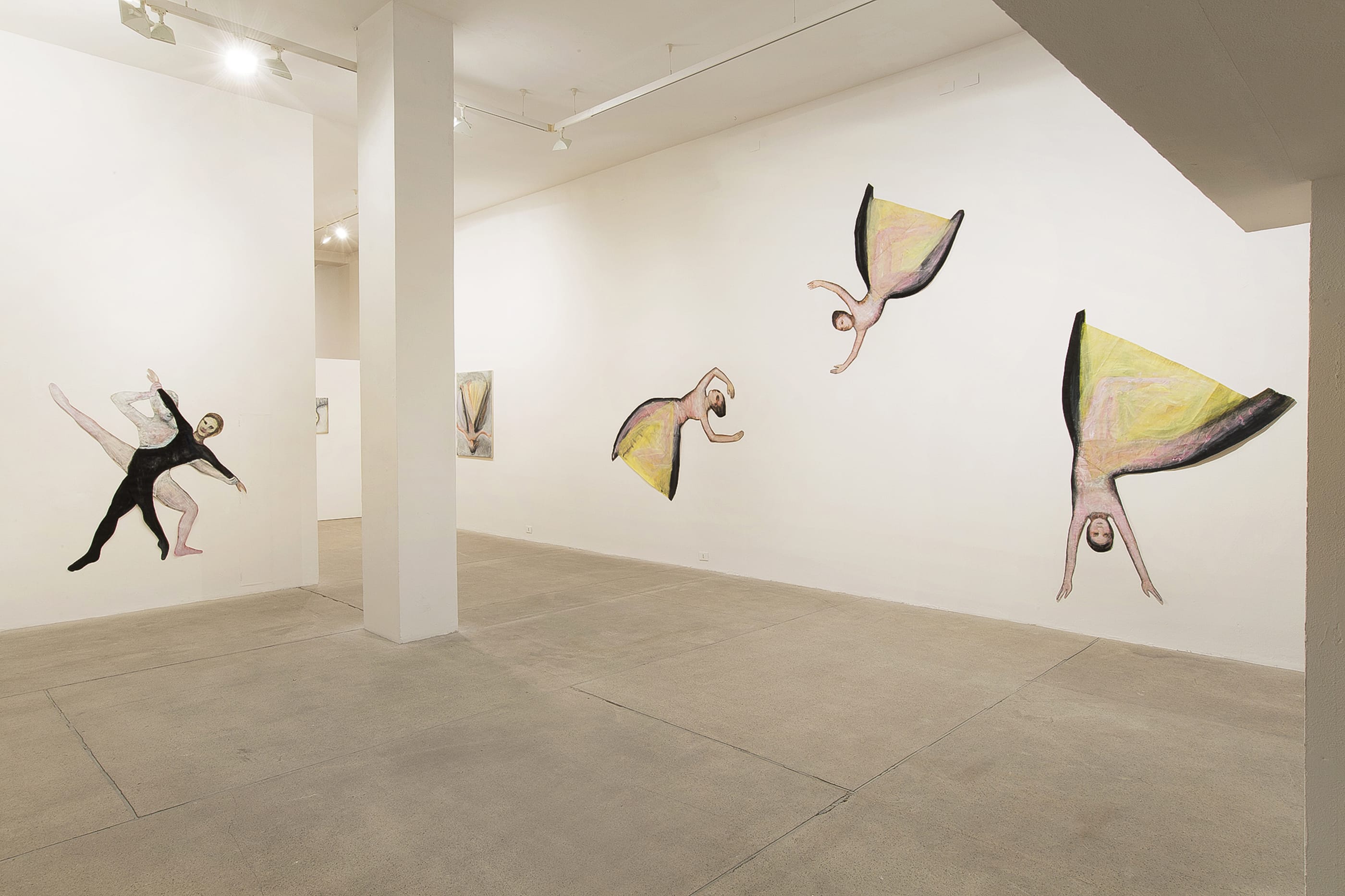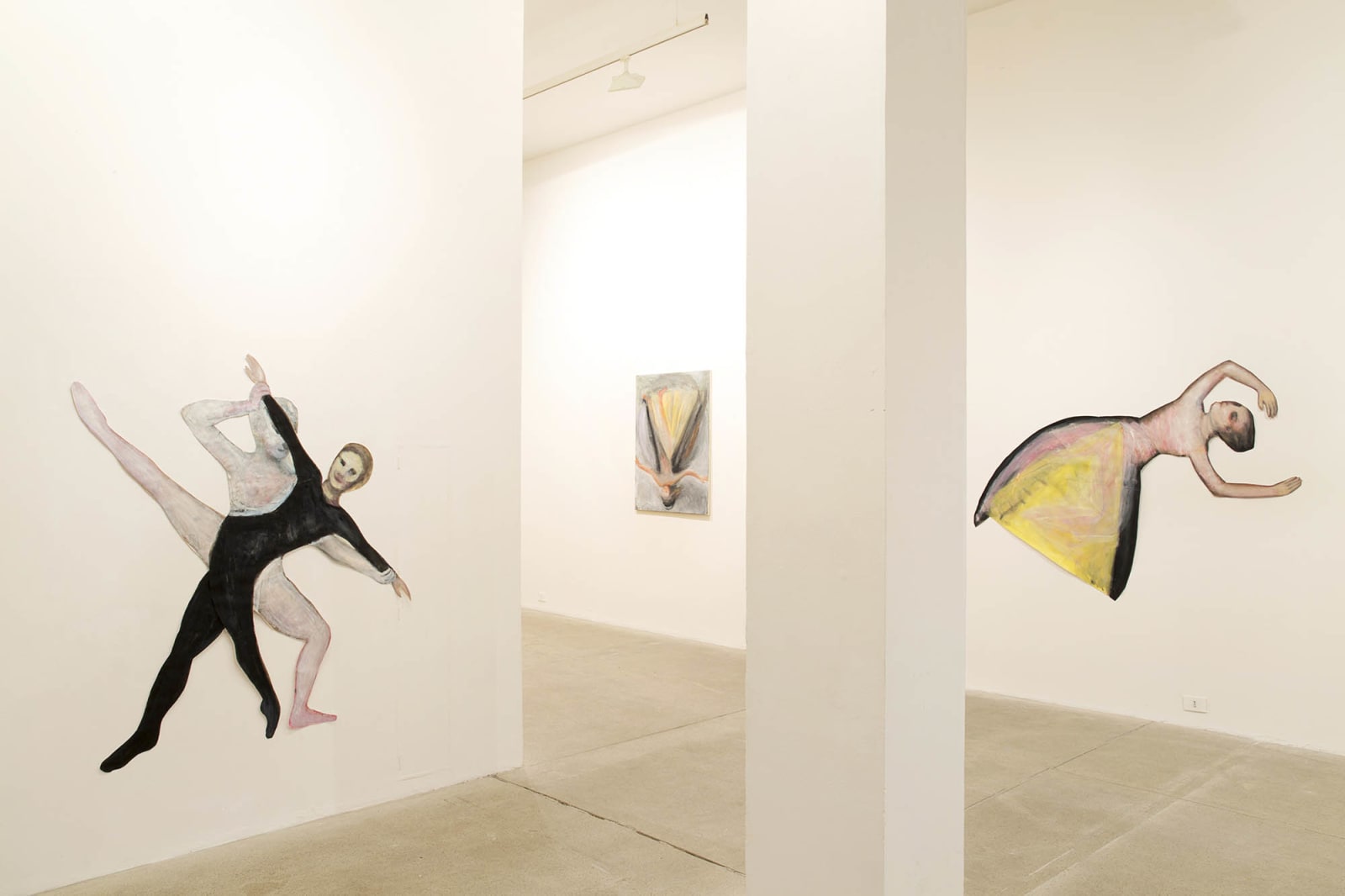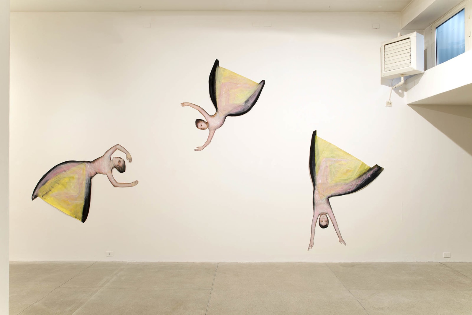 Mathilde Rosier’s current show is influenced by her years of experience with dance and physical gestures in relation to the narrative representation of space and time. Having dedicated much of her art practice to the investigation of a possible fusion of the animal realm and the human being, her most recent research is focused on the human figure, especially on the representation of movement. In her latest works she underlines her will to give life to paintings and collages usually strictly related to her performances where sound, body and action combine all together.