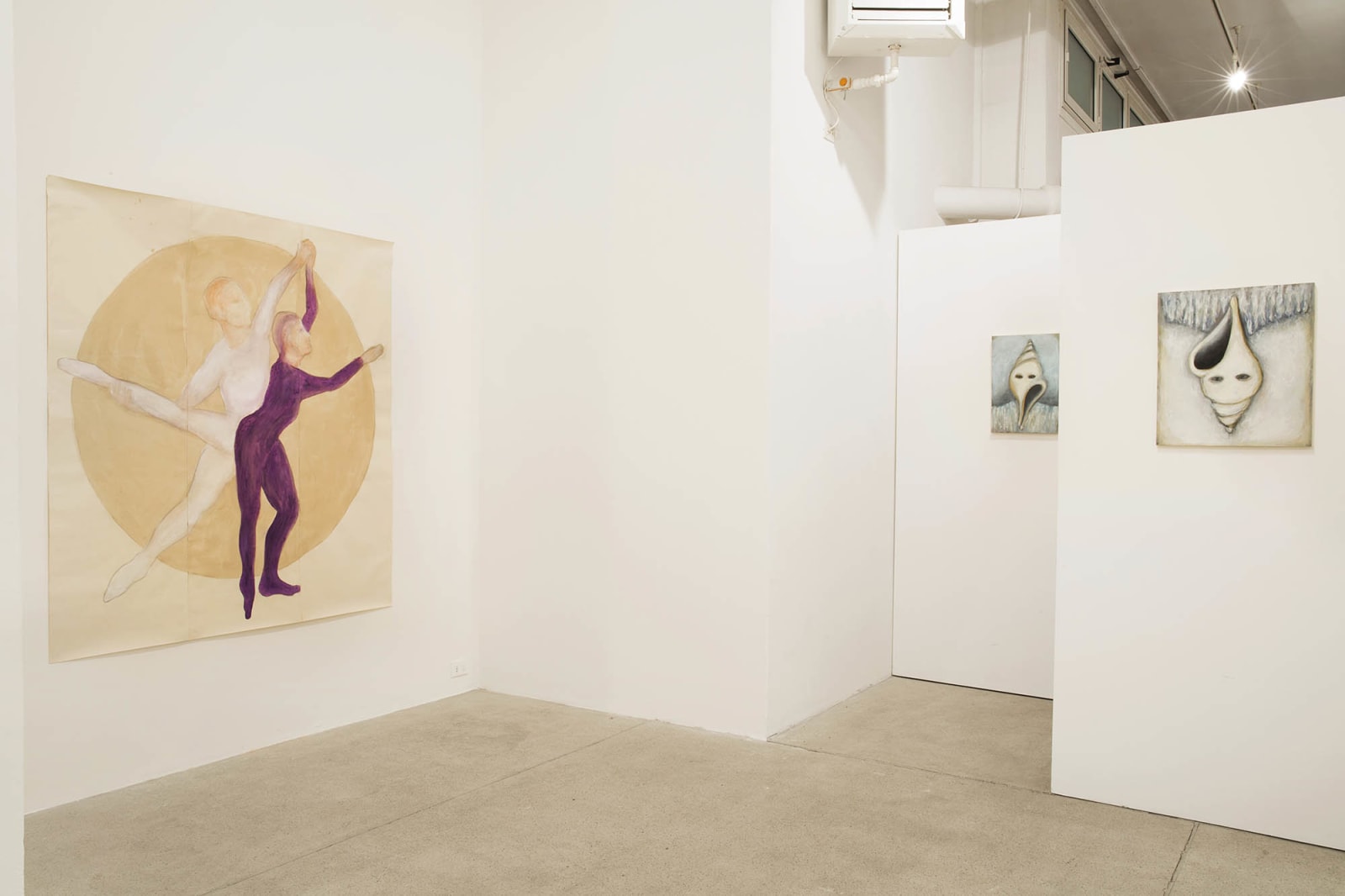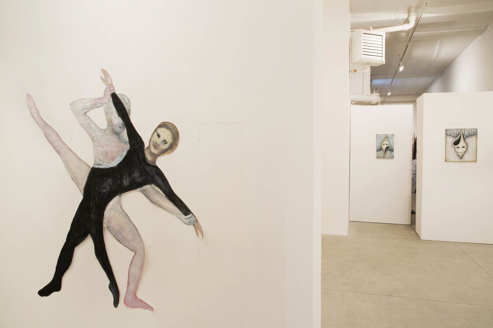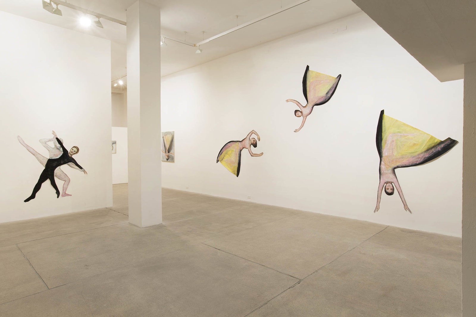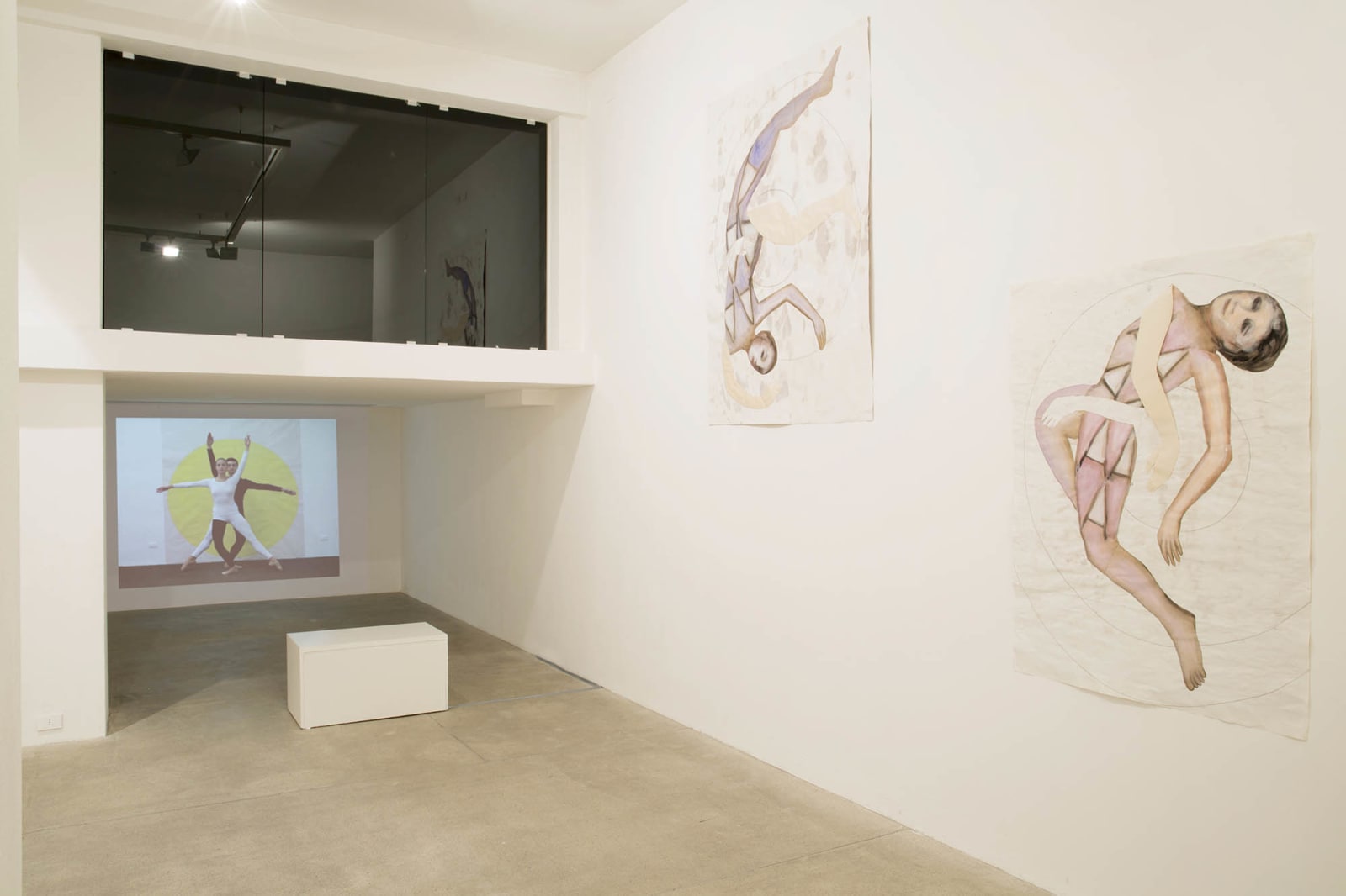 Mathilde Rosier’s current show is influenced by her years of experience with dance and physical gestures in relation to the narrative representation of space and time. Having dedicated much of her art practice to the investigation of a possible fusion of the animal realm and the human being, her most recent research is focused on the human figure, especially on the representation of movement. In her latest works she underlines her will to give life to paintings and collages usually strictly related to her performances where sound, body and action combine all together.