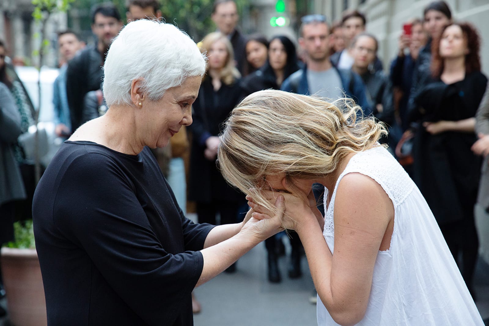 The performance springs and advances thanks to the relationship between the two women, the one young and the other older. Sandra evokes a corporeal soundscape, where much is left to improvisation. Anna, the older woman, is close to her, attentive and caring: her presence serves metaphorically as a teacher and induces the young woman to her return to life.