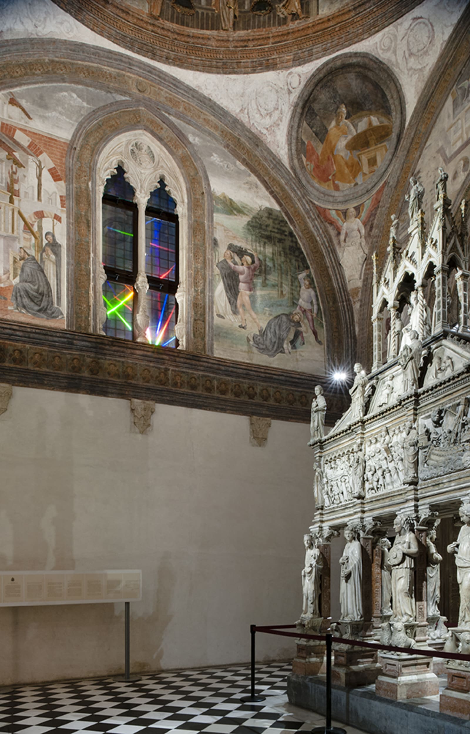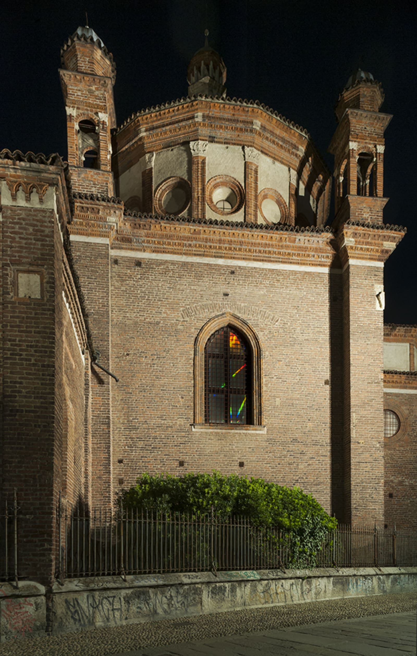 The Portinari Chapel is a square space surmounted by a spectacular lantern-shaped dome and was designed as an independent space in the second half of the 15th century. The frescoes are by Vincenzo Foppa and include paintings made of polychrome slivers that allude to divine light and, probably, also Heaven. The Solarian Chapels date back to the second half of the 15th century, and in the chapel on the left side (facing the Portinari Chapel) there are frescoes by Daniele Crespi (executed 1620-21). One of the more striking is his Saint Paul Taken to Third Heaven by the Angels, which shows the saint wrapped in the veils of the Evangelists. At the far left of the fresco there is a sort of supernatural light as well as light from the “third heaven”, which, as Dante wrote in the Divine Comedy and dedicated to “spiritual lovers”, still retain something of human inclinations, and also physically the shadow cast by the Earth when lit by the sun.