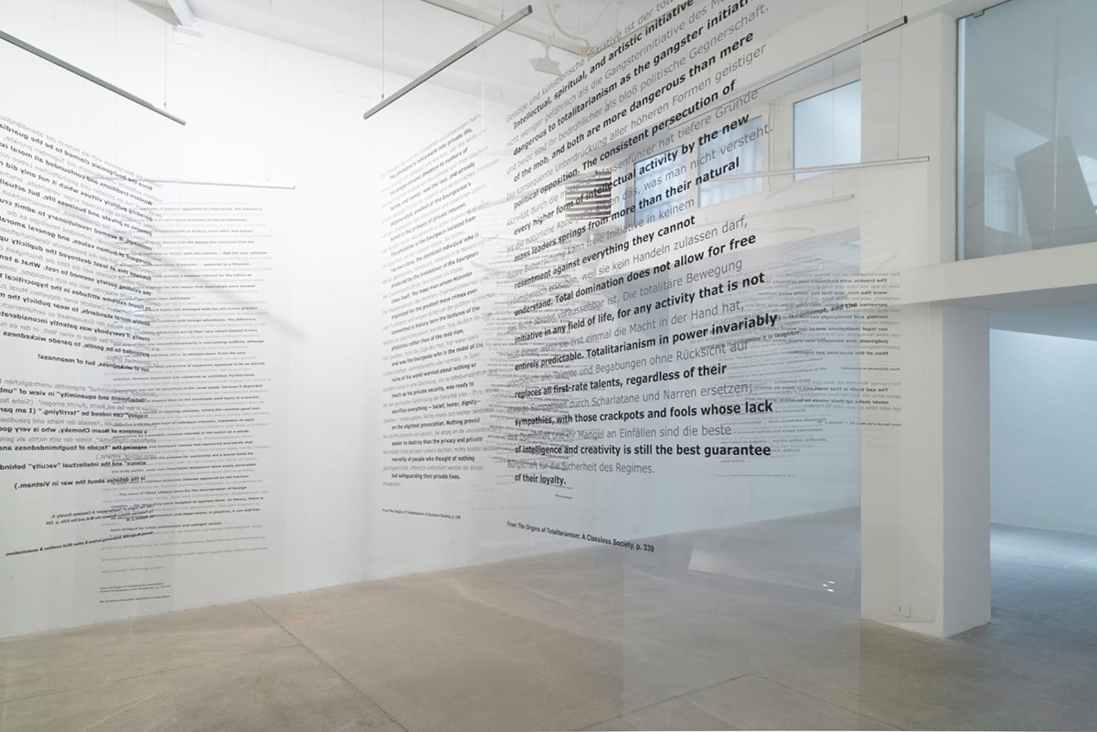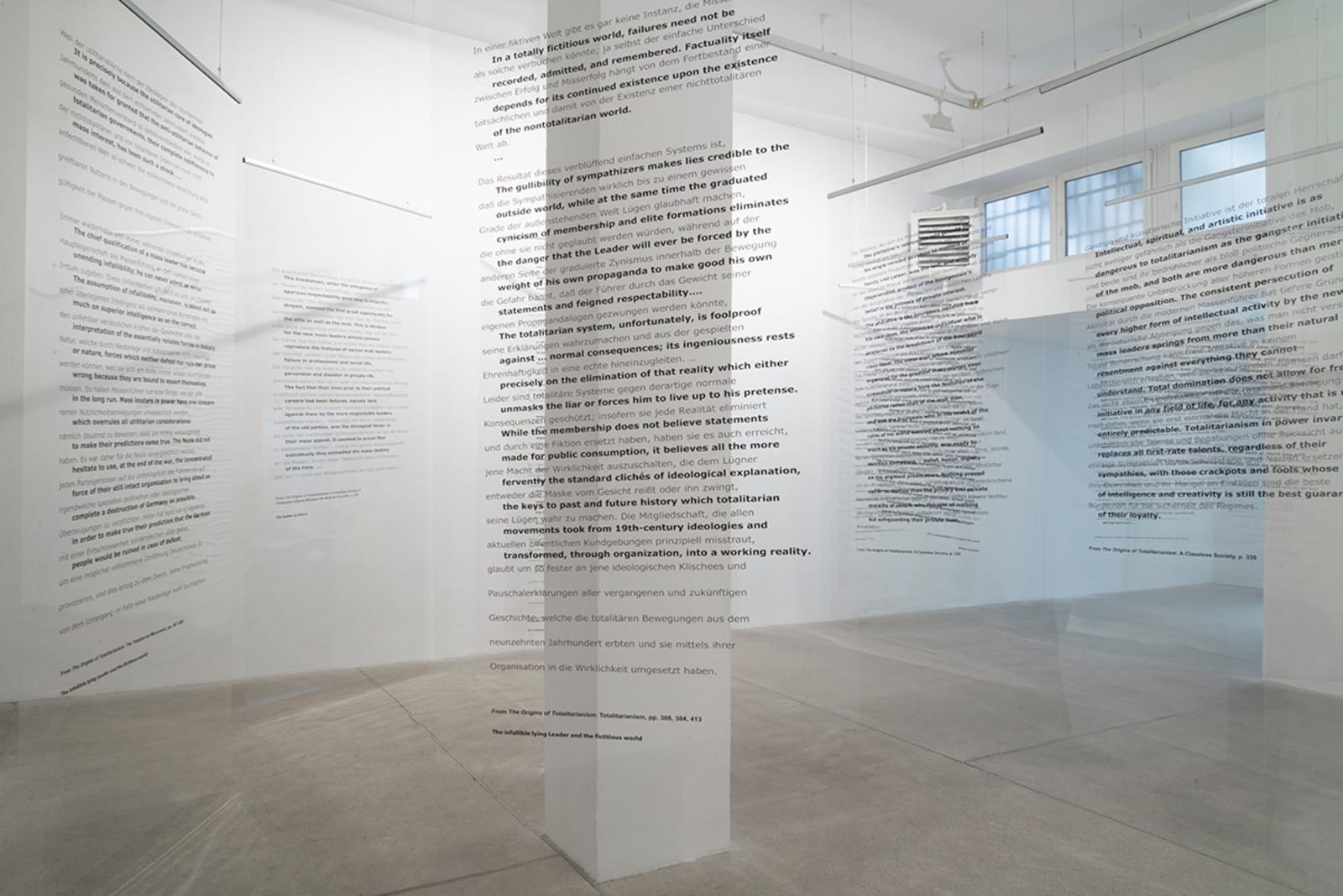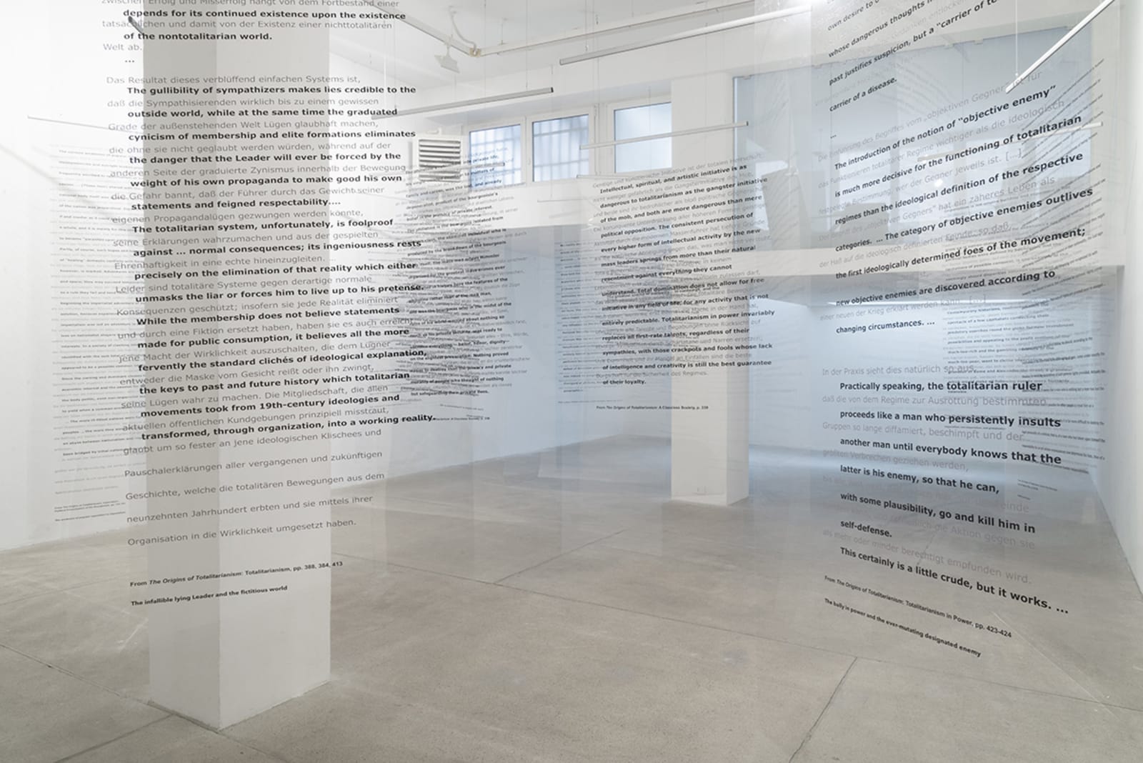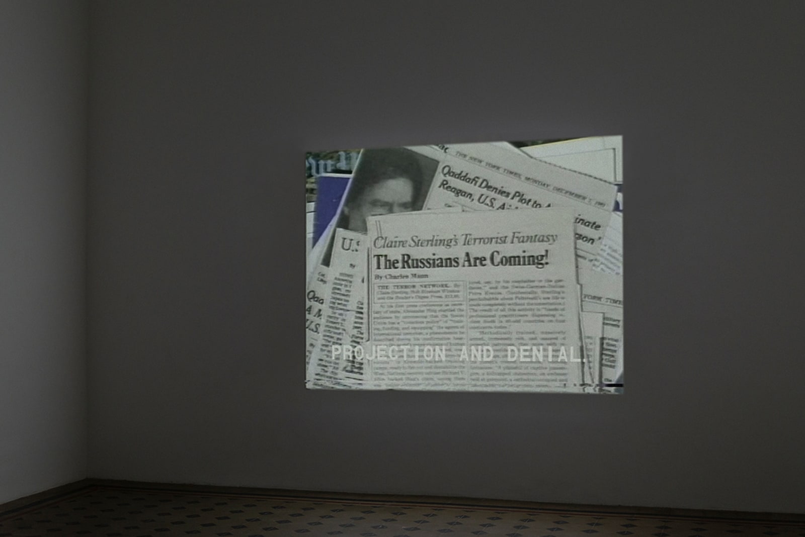 The exhibition brings together three key works by the artist – spanning video, photomontage, and sculpture – in a discursive dialogue with one another that reflects her longstanding engagement with theory, criticality, and the written word. At its heart is a concern for the most insidious operations of authoritarianism, and the manifestation of proto-fascist tendencies and policies in the current political climate.