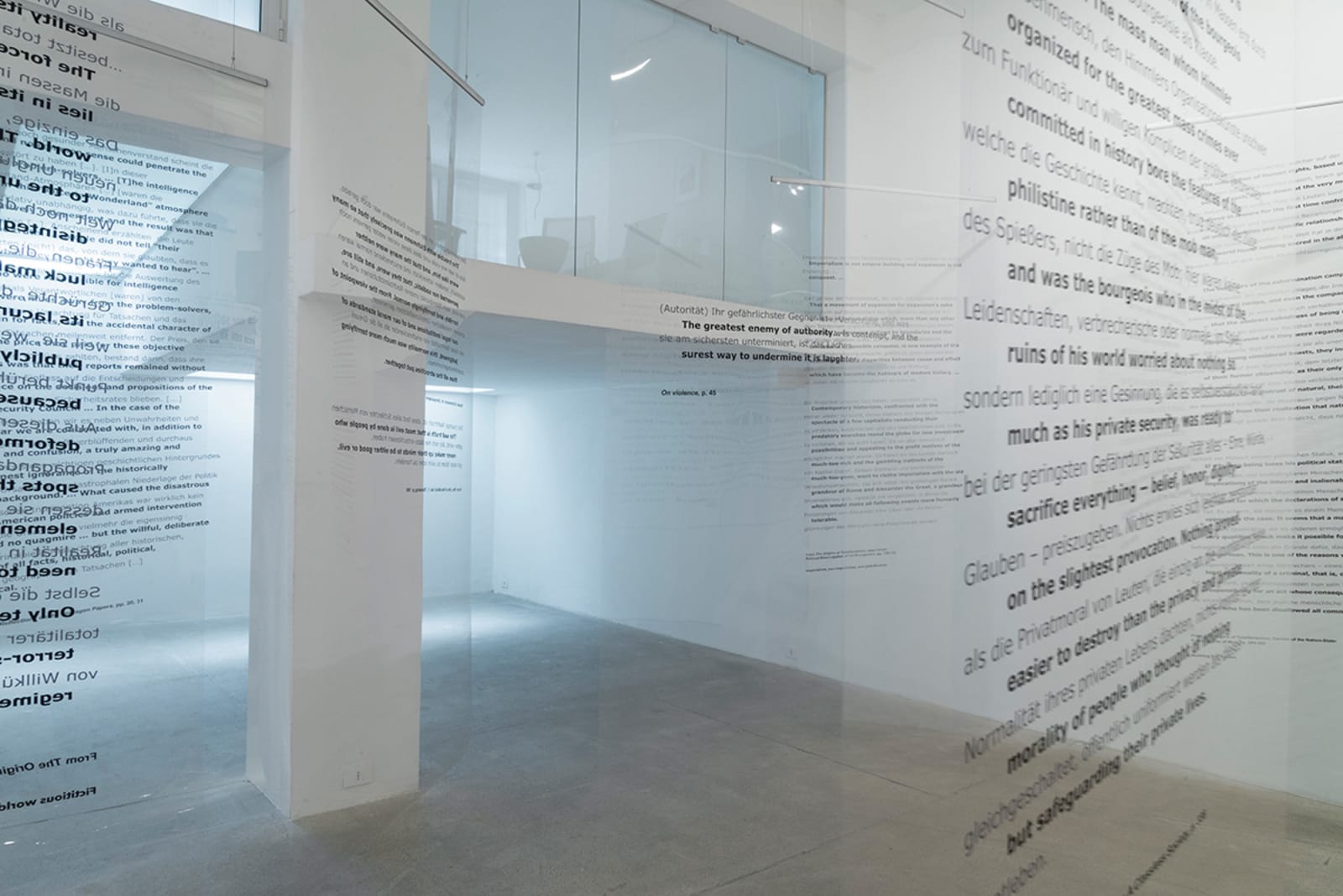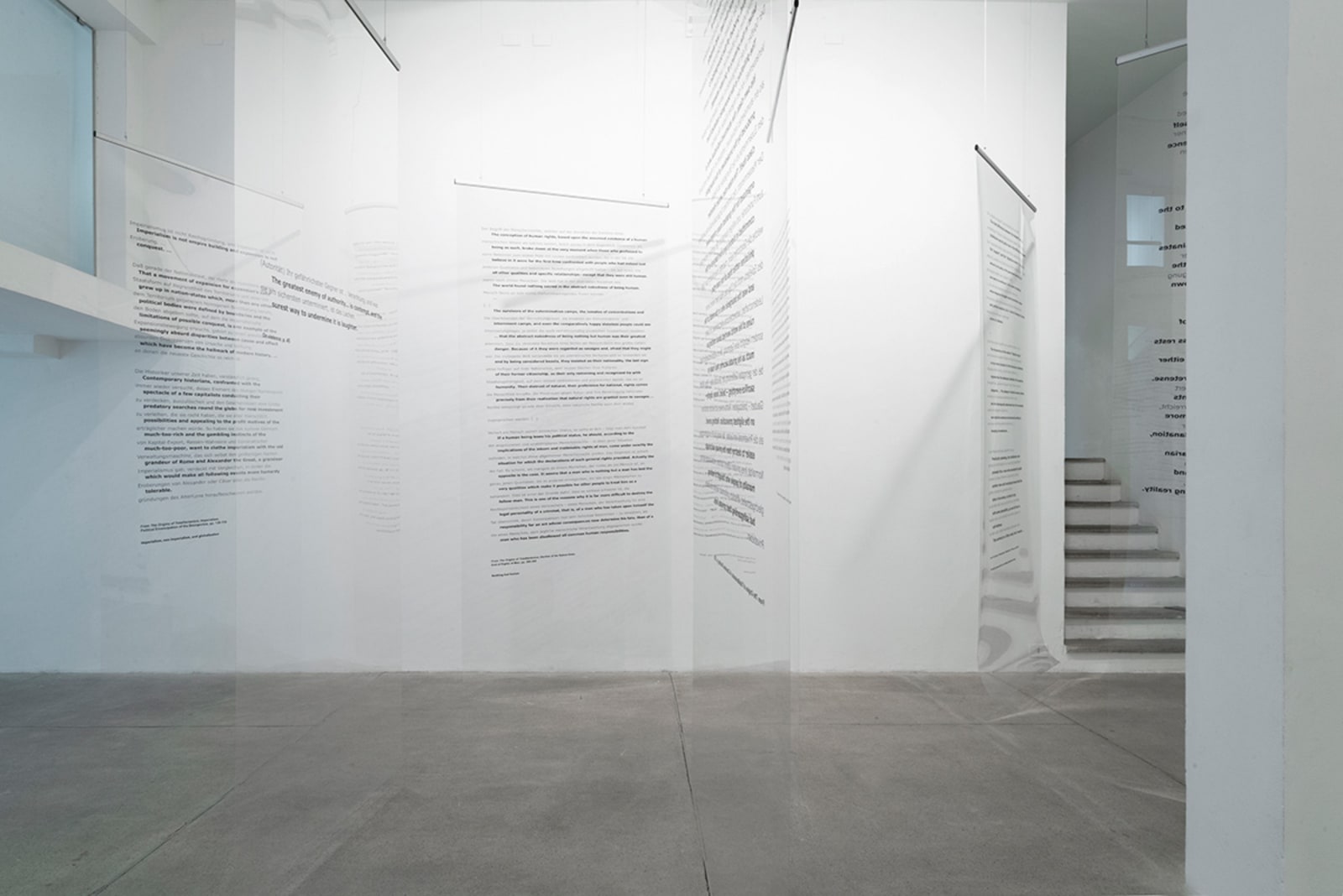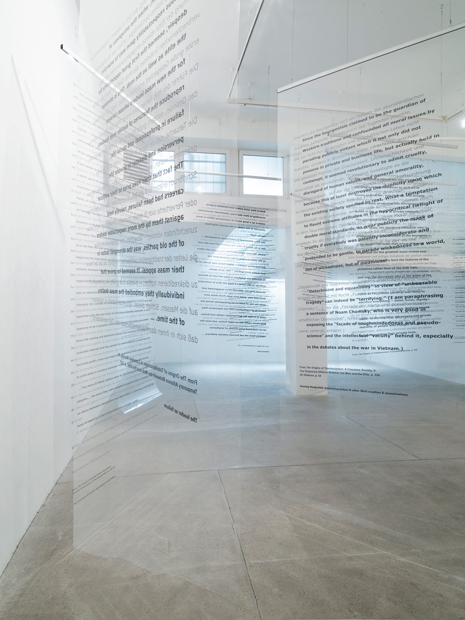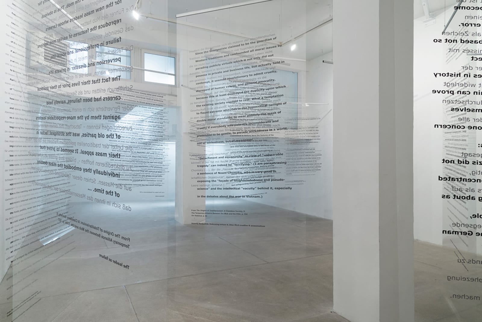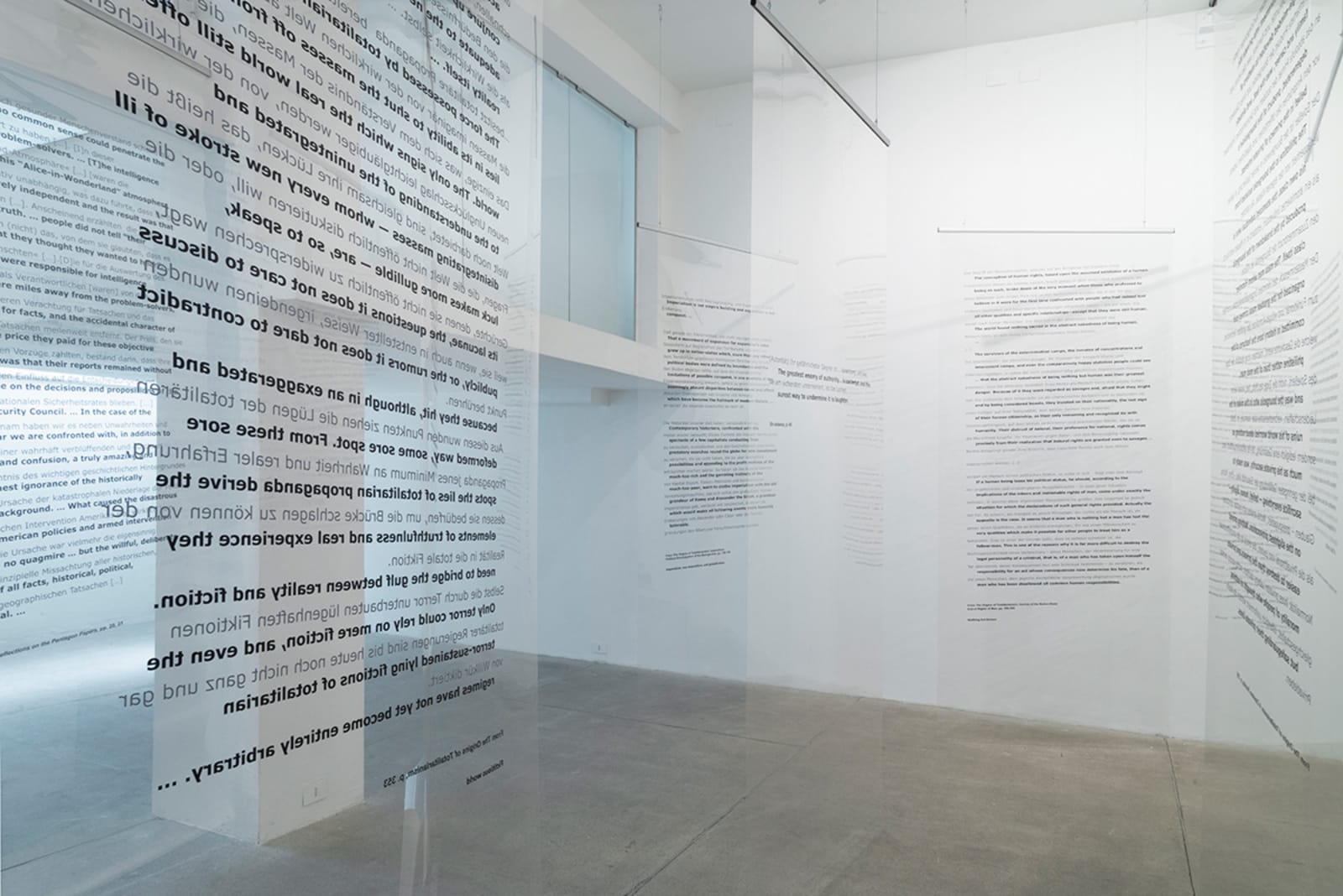 The exhibition brings together three key works by the artist – spanning video, photomontage, and sculpture – in a discursive dialogue with one another that reflects her longstanding engagement with theory, criticality, and the written word. At its heart is a concern for the most insidious operations of authoritarianism, and the manifestation of proto-fascist tendencies and policies in the current political climate.