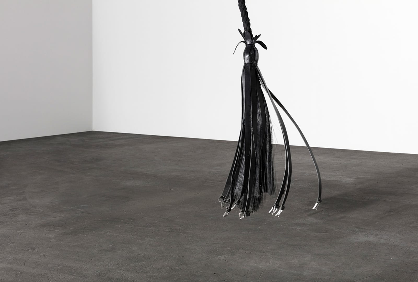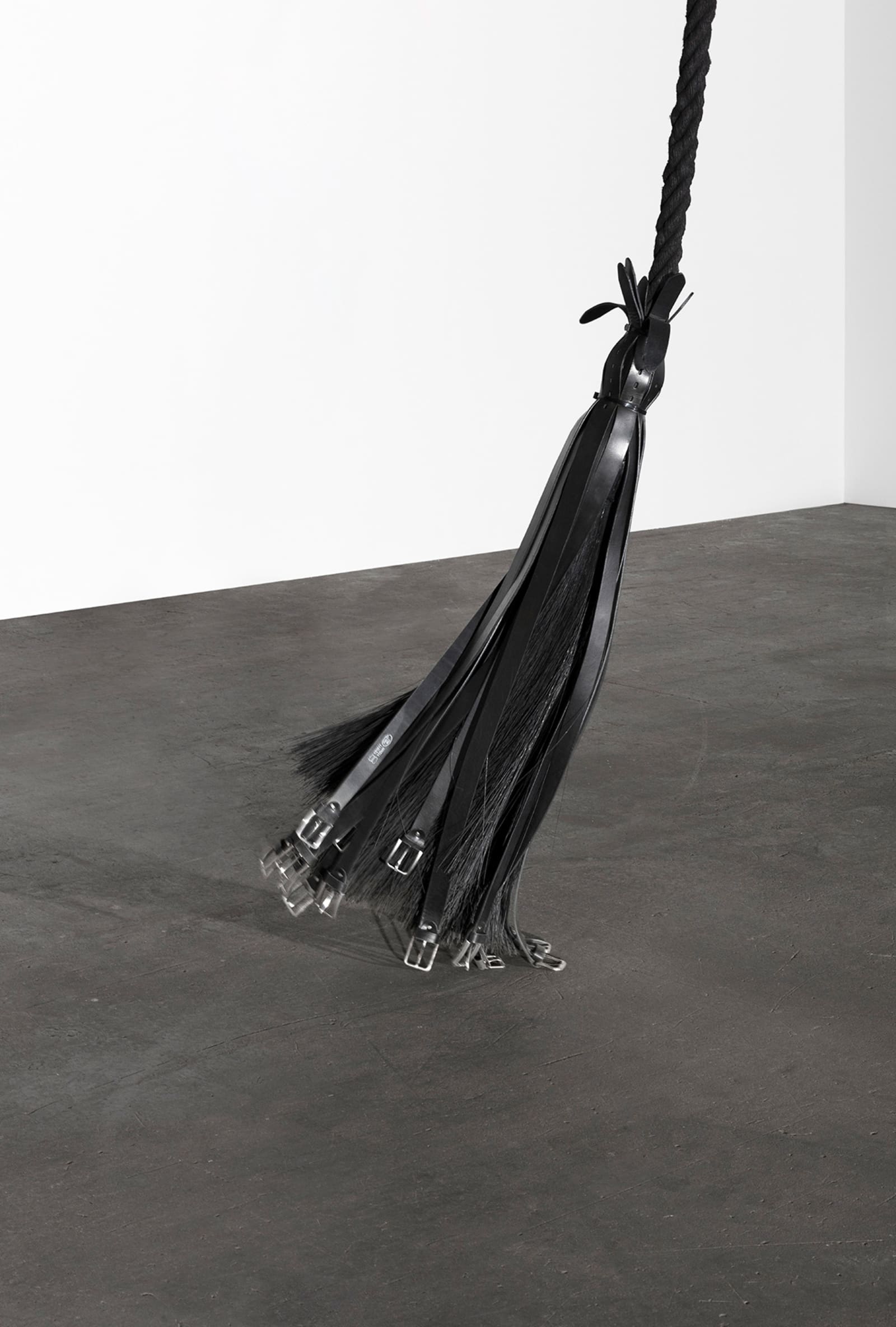 A hanging sculpture made of leather belts moves through the space, loudly sweeping across and hitting the floor. The screeching and metallic noises of the belts crushing on the surface are accompanied by the industrial sound created by the pneumatic pistons that keep the installation in motion. The resulting movements are precisely programmed into a choreography reminiscent of a dance or a forced and repetitive mantra.