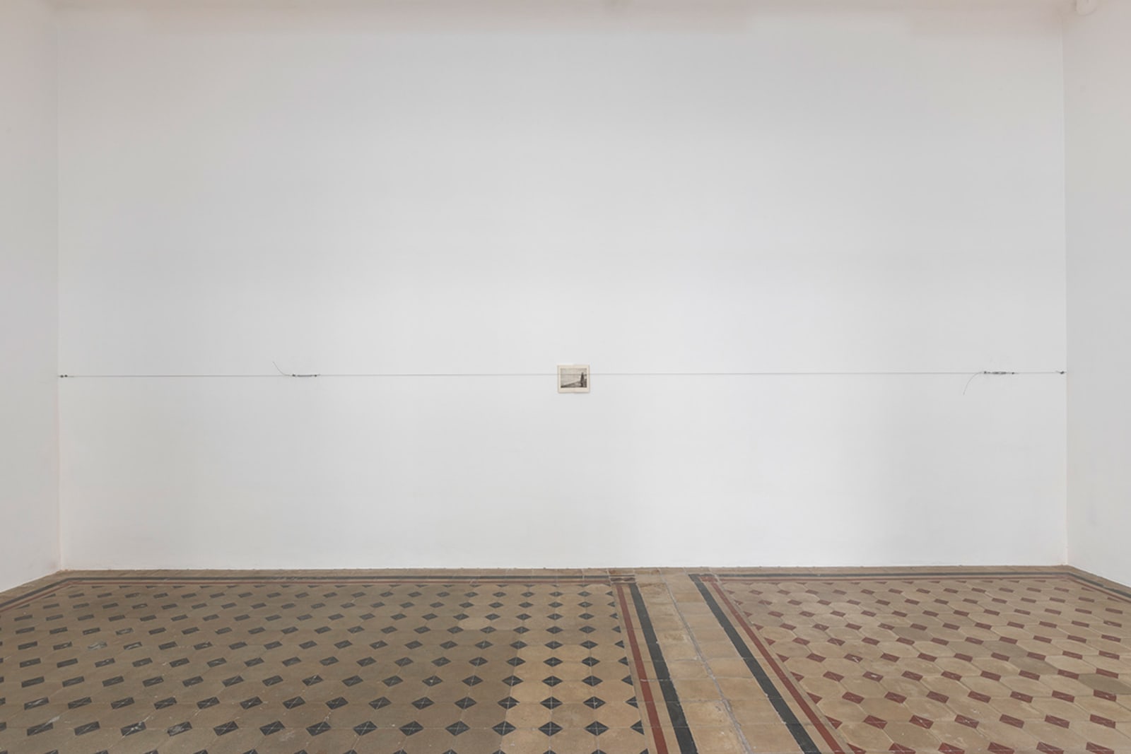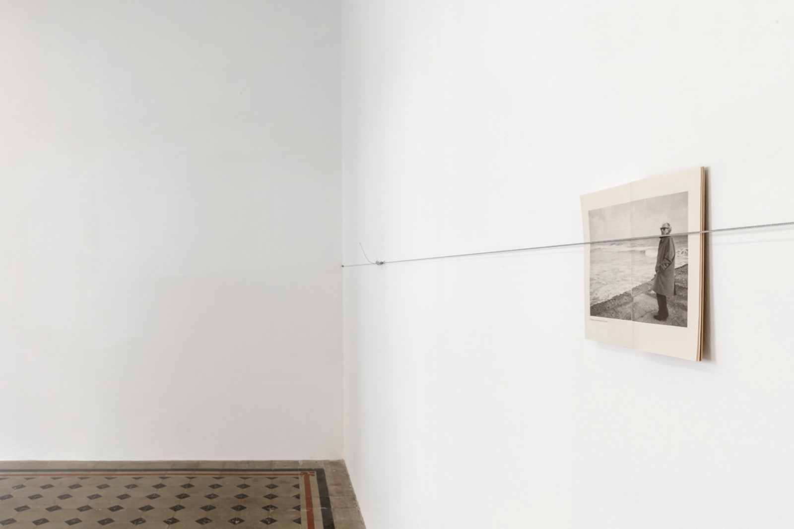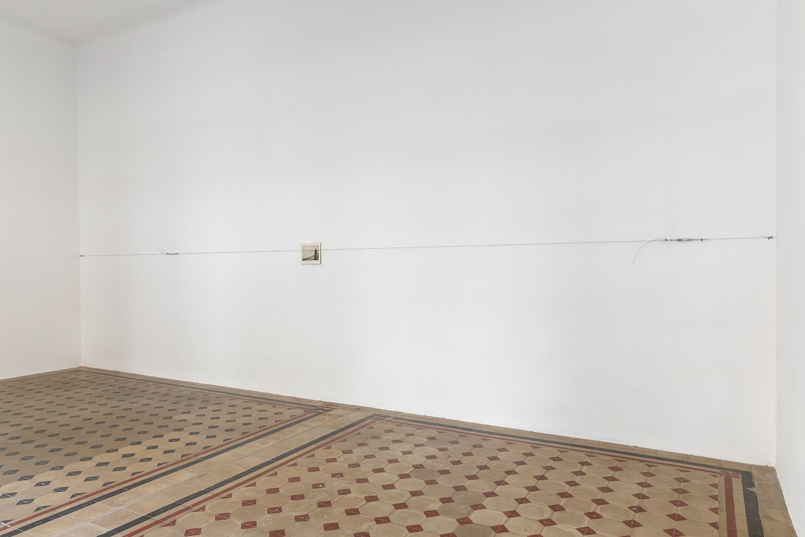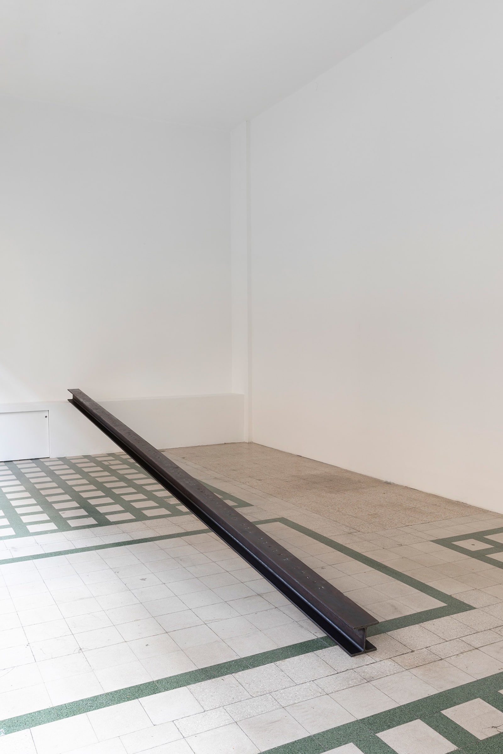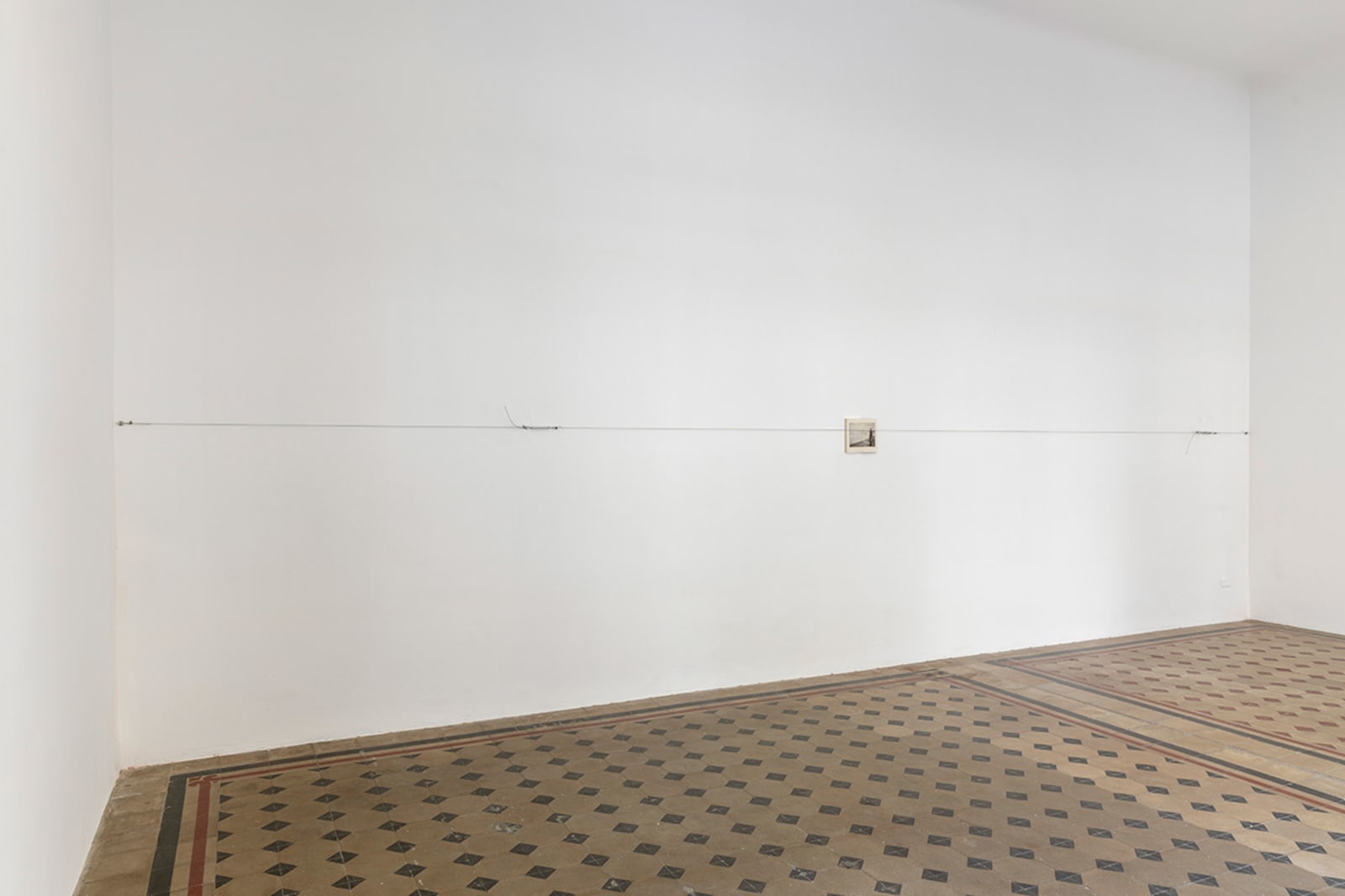 Things: flag, photograph, beam; lines: diagonal, horizontal, perpendicular; locations: floor, wall, space. These are some of the words on which Francesco Arena based his third solo show in Galleria Raffaella Cortese’s three exhibition venues, Terza mostra: tre cose [Third exhibition: three things]. As in his two previous projects with the gallery, each space is characterized by the presence of a single work. Without any specific order in their visit of the spaces, viewers move from the low level of the floor with Bandiera linearizzata [Linearized flag] to the high one of Orizzonte lasco [Loose horizon], to their union with Sentenza in sei metri da zero a sessantasei centimetri [Sentence in six meters from zero to sixty-six centimeters], which establishes a dialogue between height and walking surface.