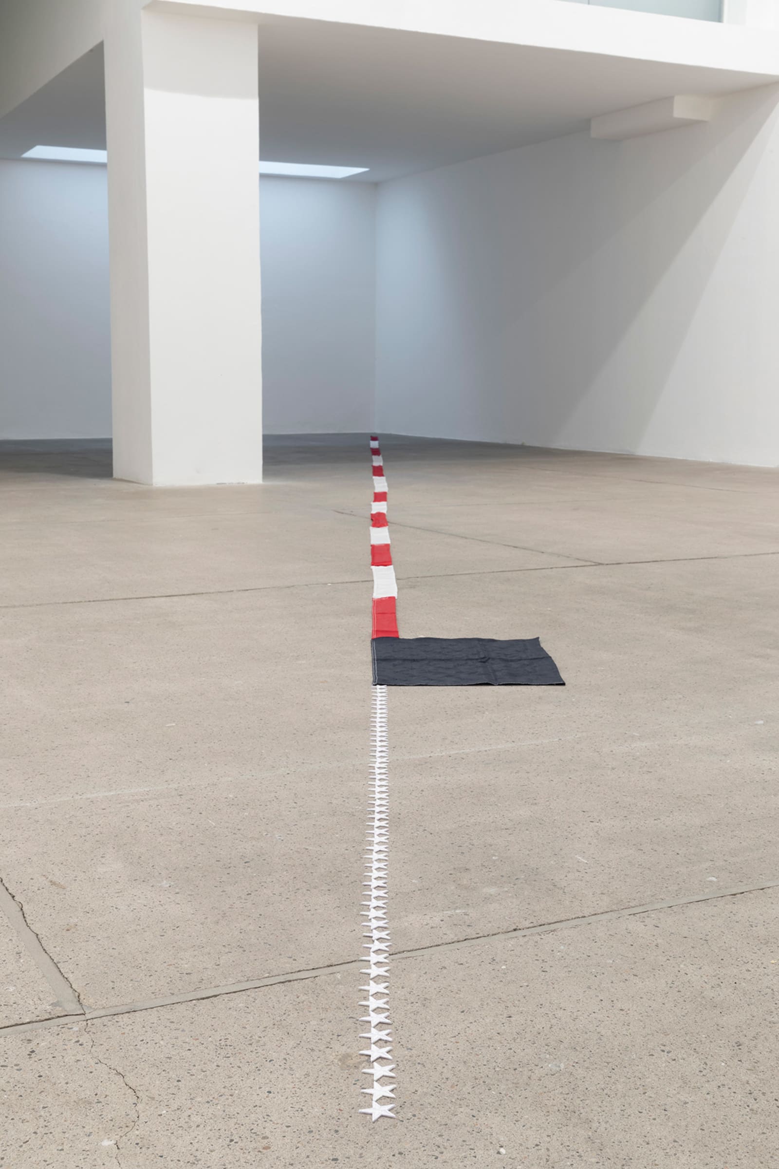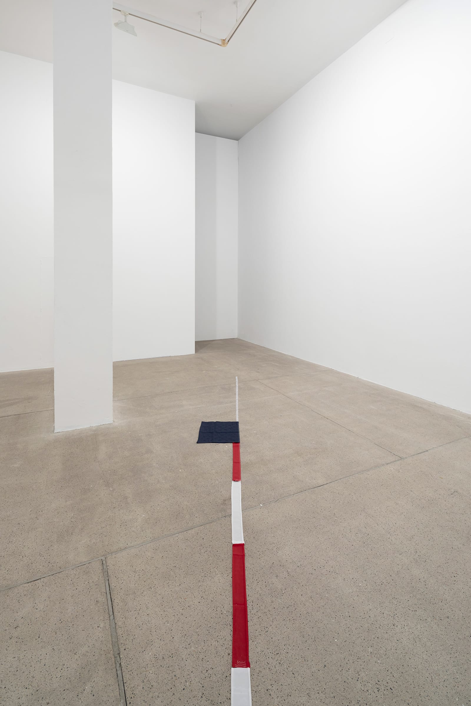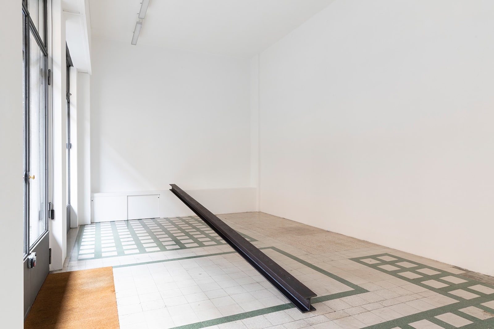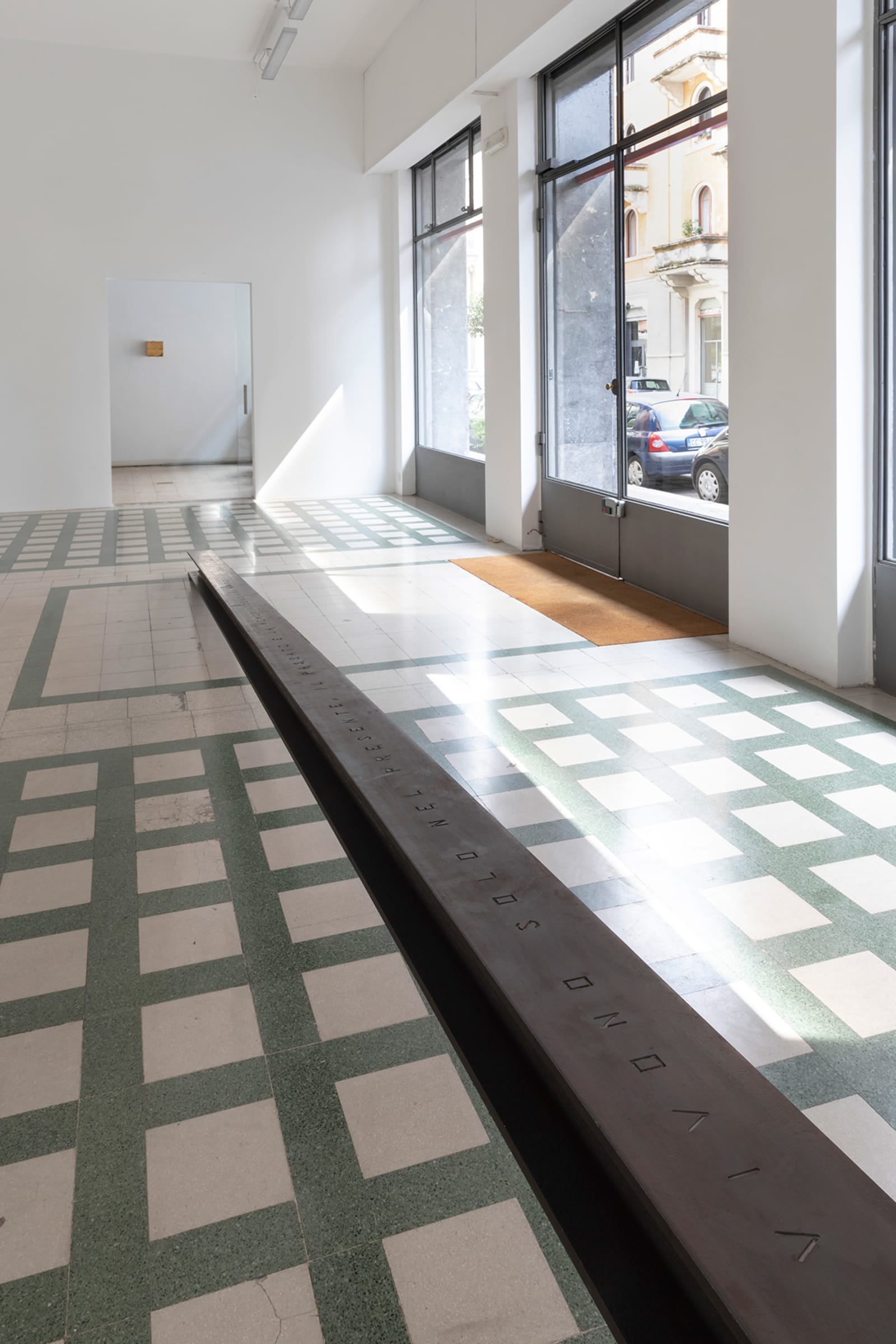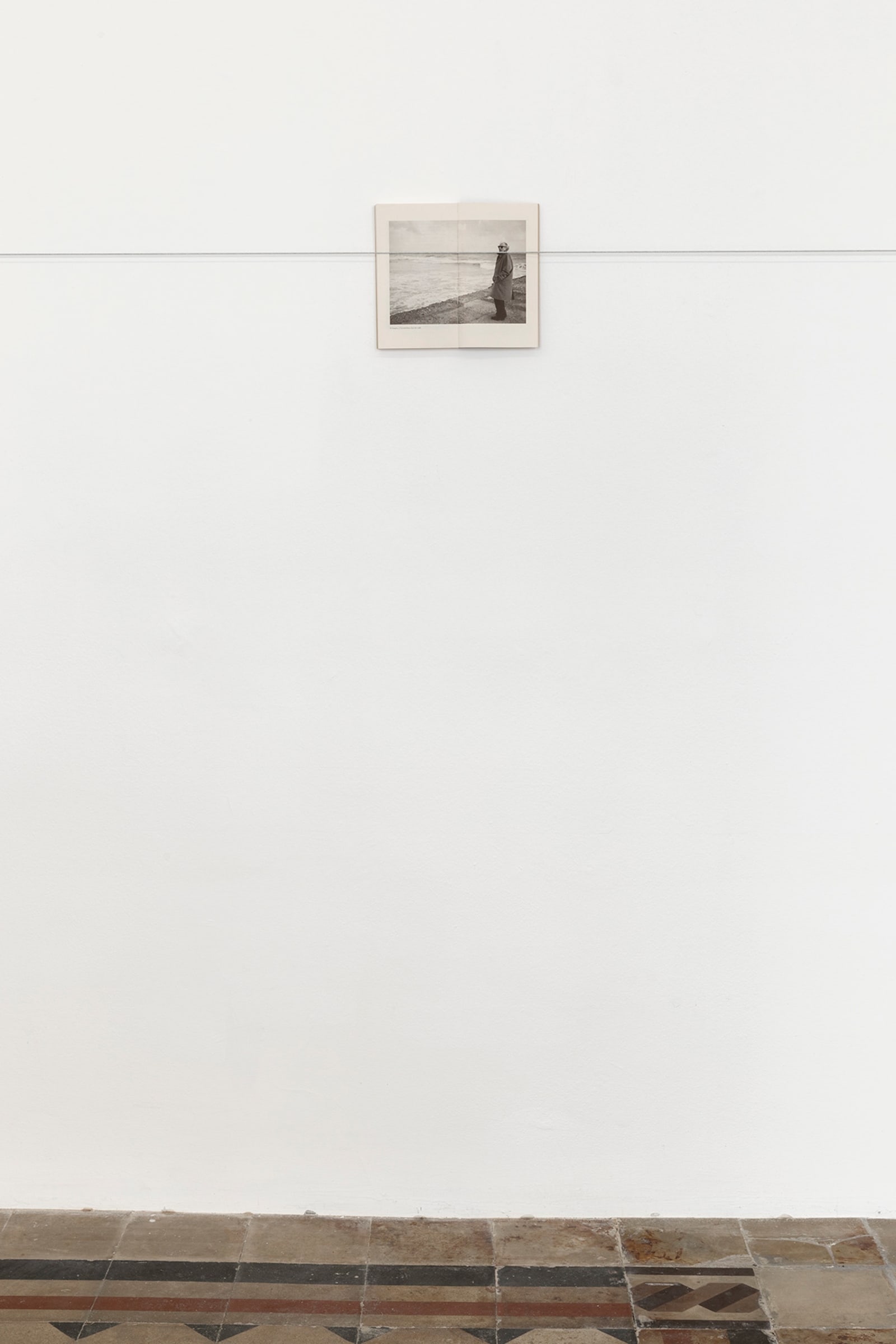Things: flag, photograph, beam; lines: diagonal, horizontal, perpendicular; locations: floor, wall, space. These are some of the words on which Francesco Arena based his third solo show in Galleria Raffaella Cortese’s three exhibition venues, Terza mostra: tre cose [Third exhibition: three things]. As in his two previous projects with the gallery, each space is characterized by the presence of a single work. Without any specific order in their visit of the spaces, viewers move from the low level of the floor with Bandiera linearizzata [Linearized flag] to the high one of Orizzonte lasco [Loose horizon], to their union with Sentenza in sei metri da zero a sessantasei centimetri [Sentence in six meters from zero to sixty-six centimeters], which establishes a dialogue between height and walking surface.