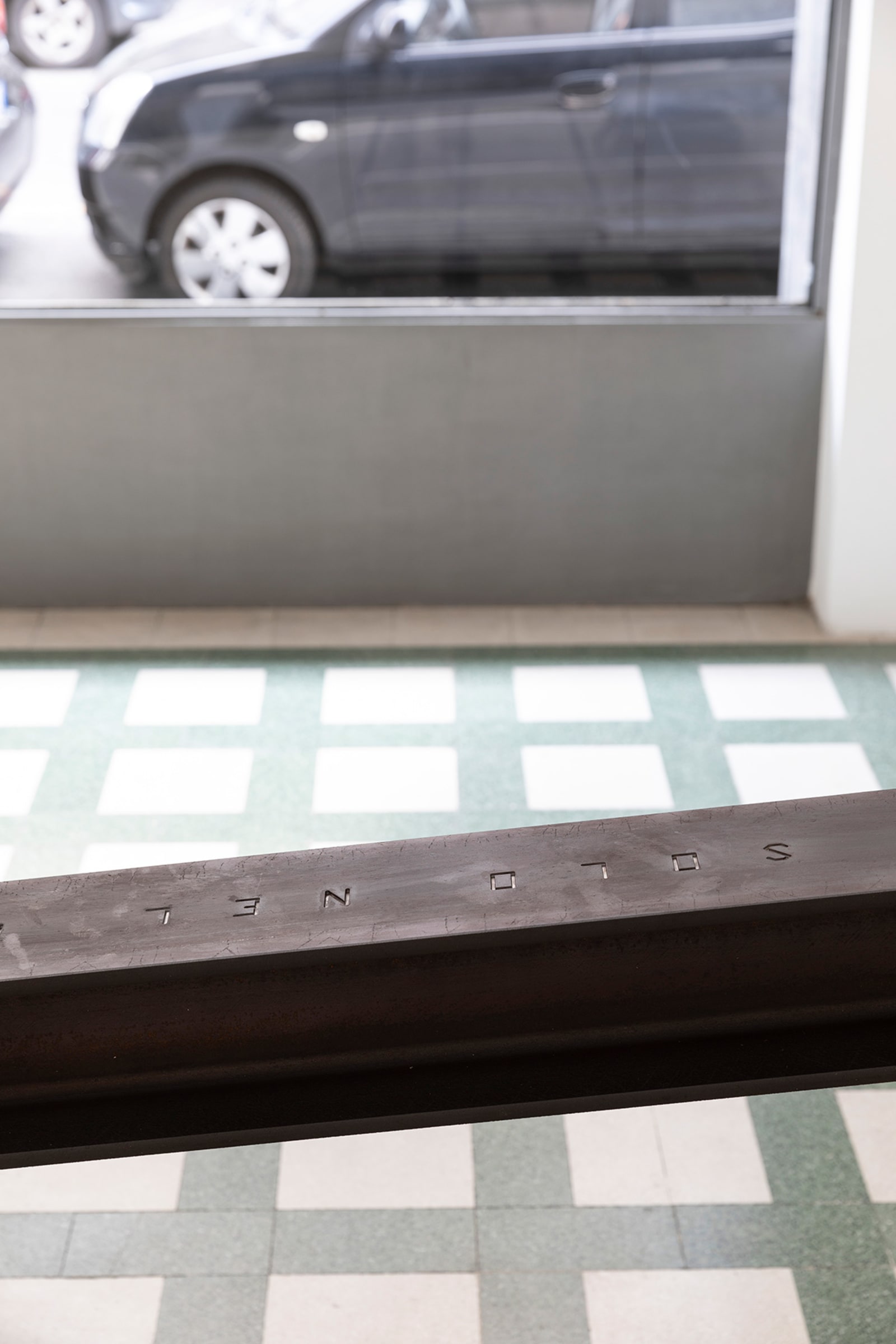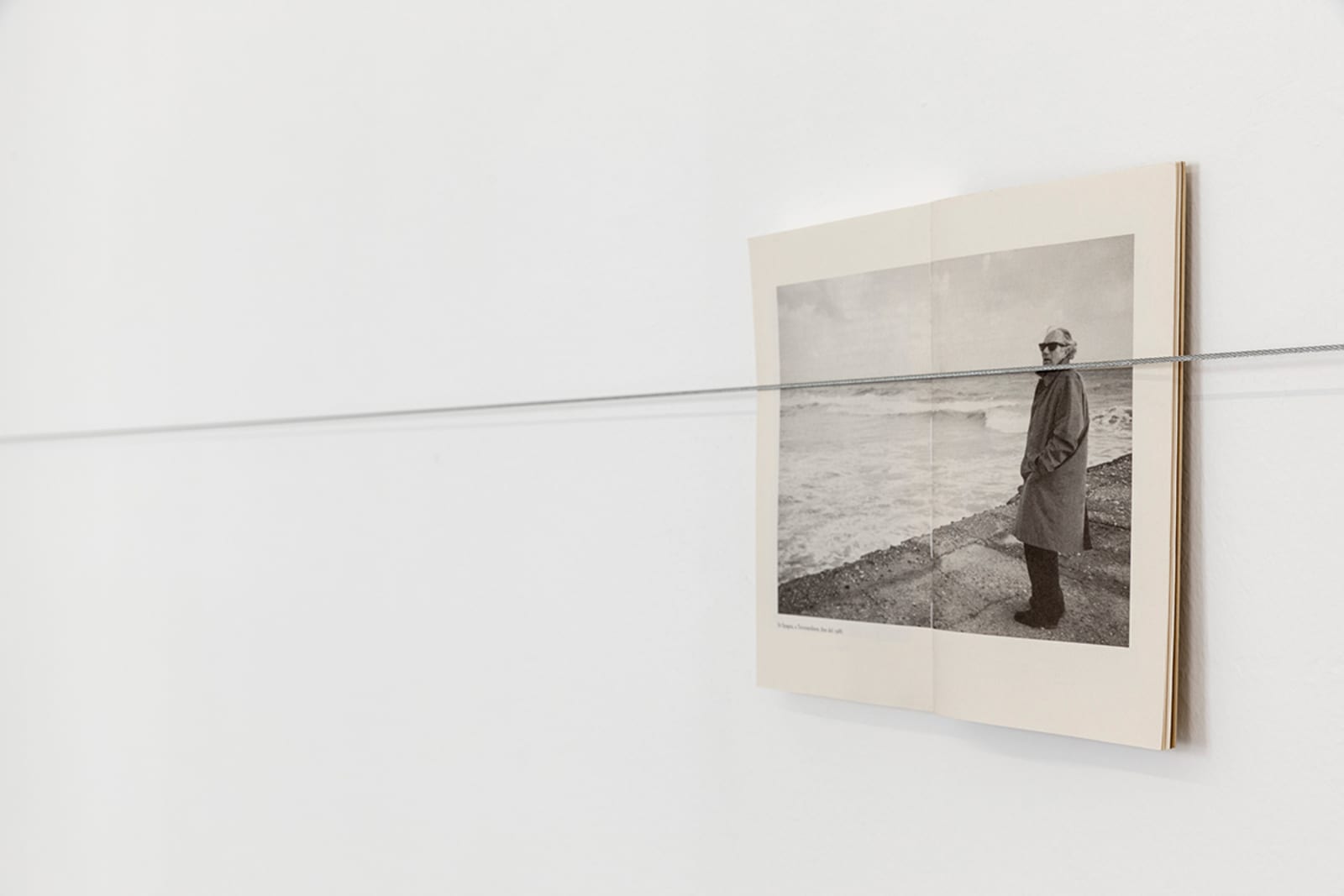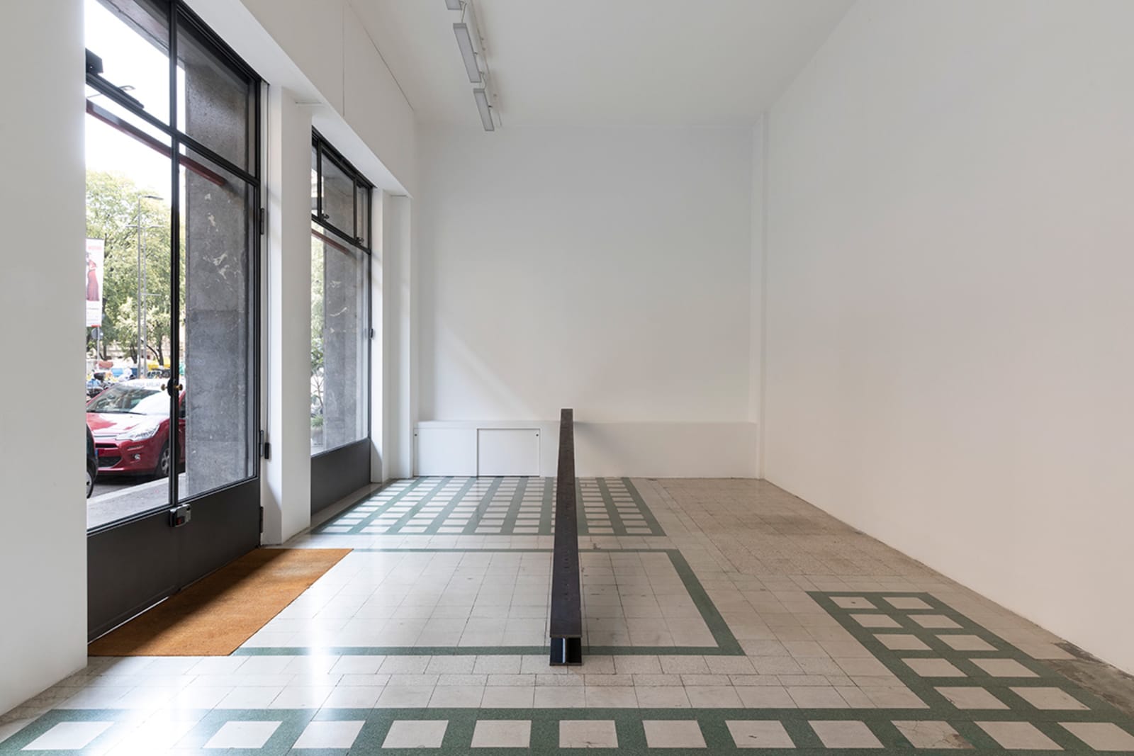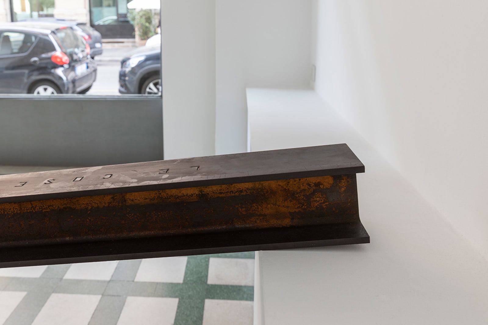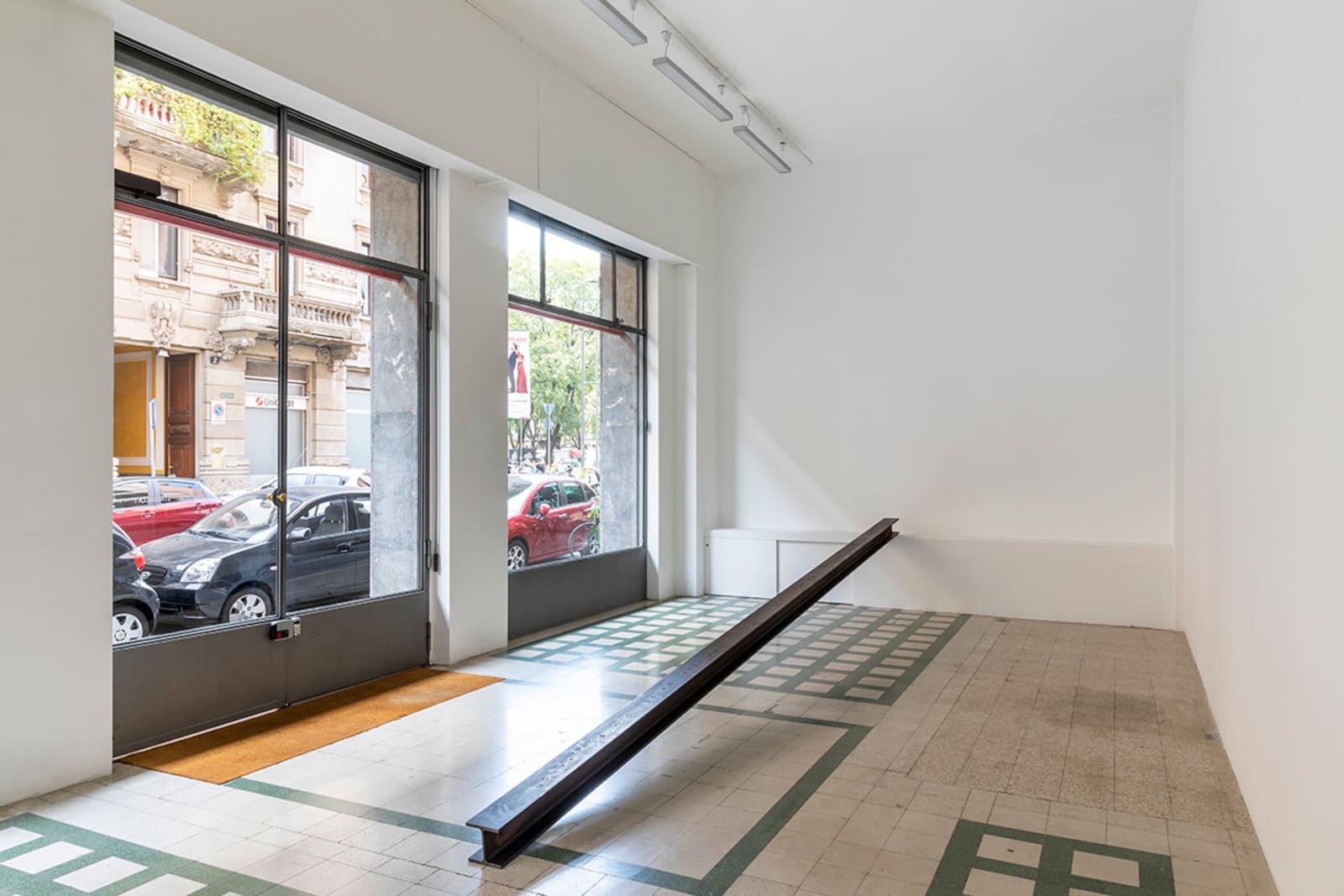 Things: flag, photograph, beam; lines: diagonal, horizontal, perpendicular; locations: floor, wall, space. These are some of the words on which Francesco Arena based his third solo show in Galleria Raffaella Cortese’s three exhibition venues, Terza mostra: tre cose [Third exhibition: three things]. As in his two previous projects with the gallery, each space is characterized by the presence of a single work. Without any specific order in their visit of the spaces, viewers move from the low level of the floor with Bandiera linearizzata [Linearized flag] to the high one of Orizzonte lasco [Loose horizon], to their union with Sentenza in sei metri da zero a sessantasei centimetri [Sentence in six meters from zero to sixty-six centimeters], which establishes a dialogue between height and walking surface.