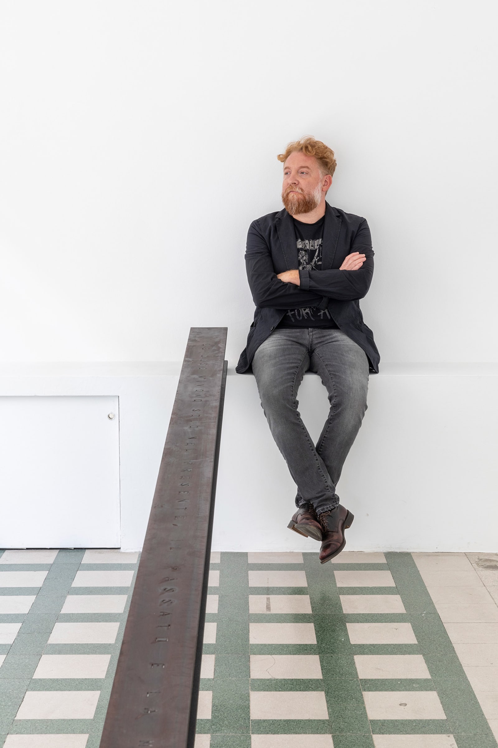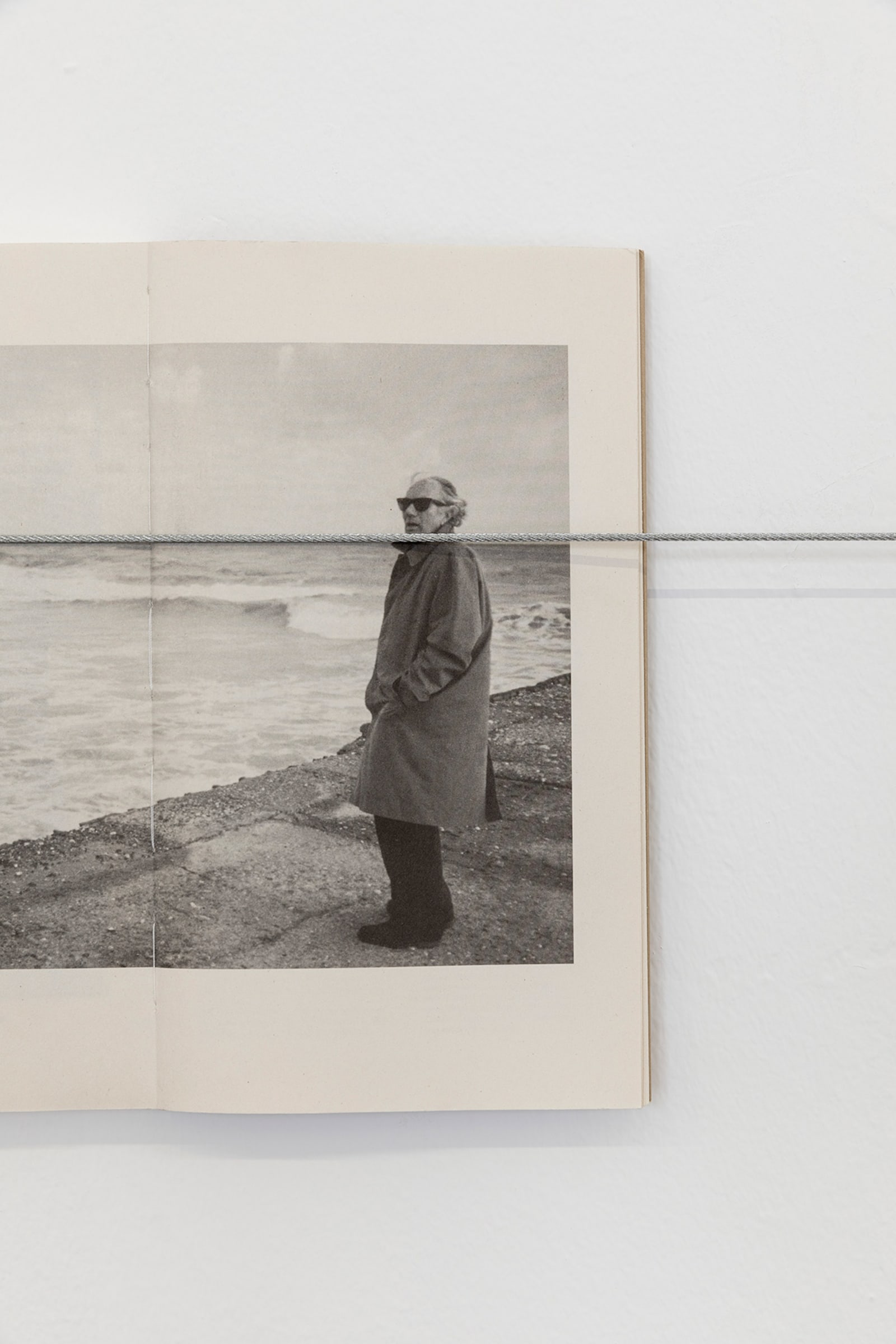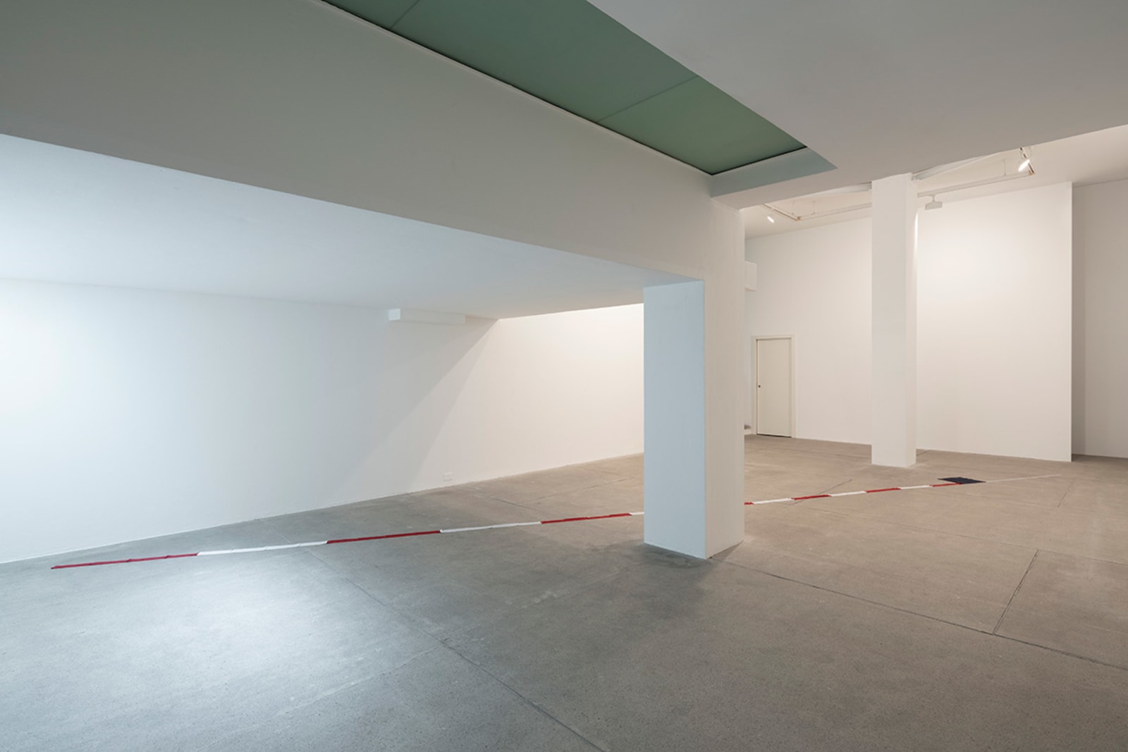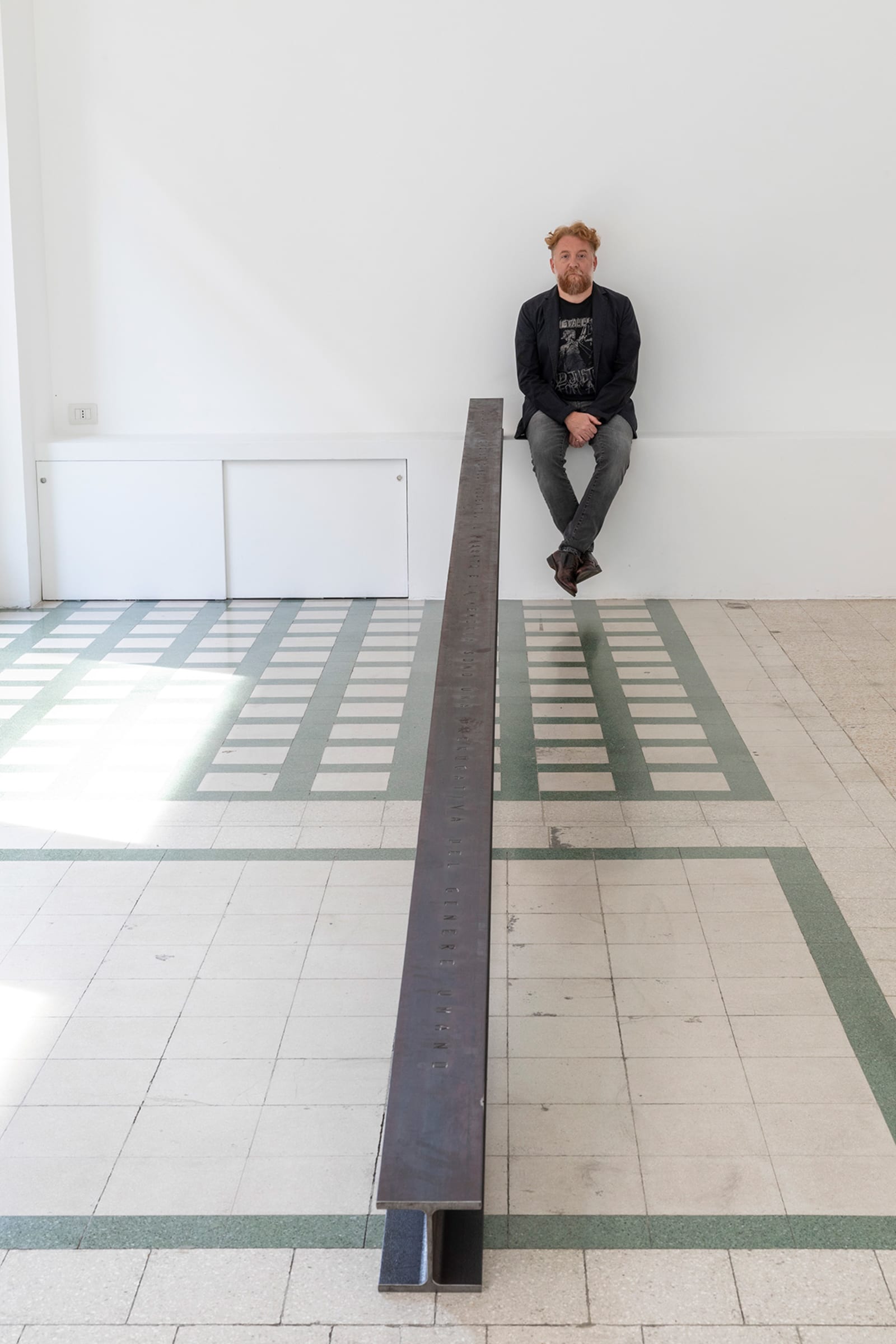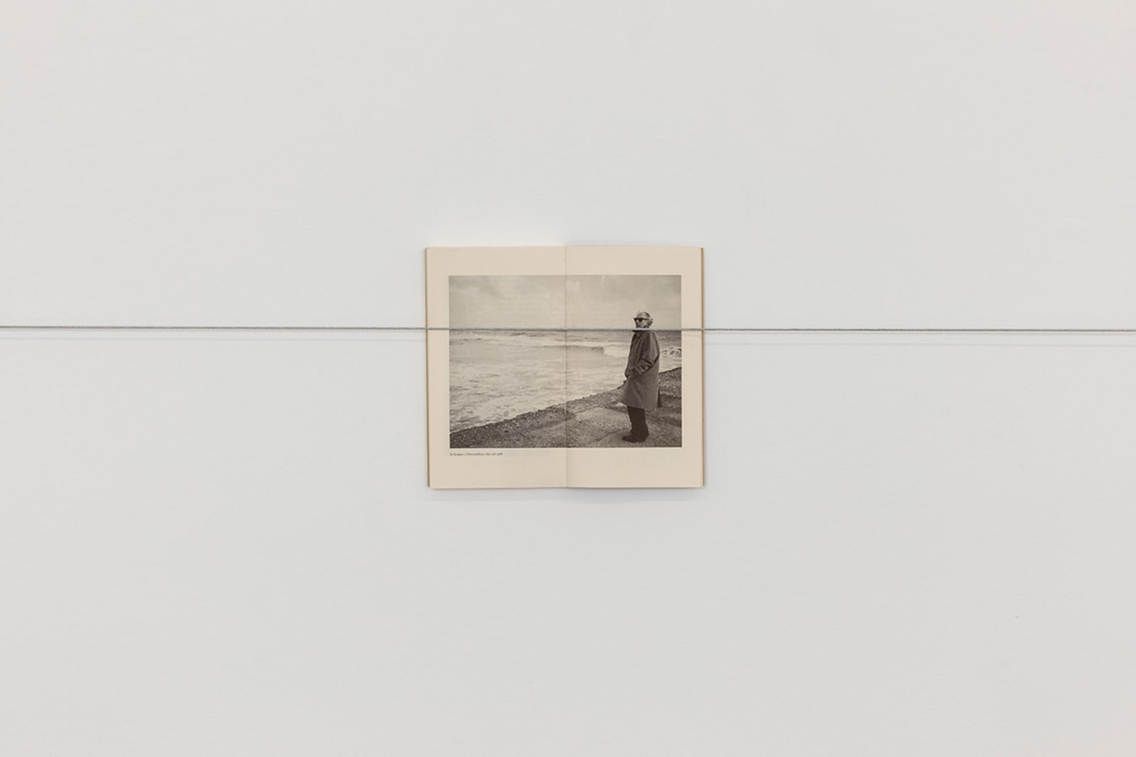 Things: flag, photograph, beam; lines: diagonal, horizontal, perpendicular; locations: floor, wall, space. These are some of the words on which Francesco Arena based his third solo show in Galleria Raffaella Cortese’s three exhibition venues, Terza mostra: tre cose [Third exhibition: three things]. As in his two previous projects with the gallery, each space is characterized by the presence of a single work. Without any specific order in their visit of the spaces, viewers move from the low level of the floor with Bandiera linearizzata [Linearized flag] to the high one of Orizzonte lasco [Loose horizon], to their union with Sentenza in sei metri da zero a sessantasei centimetri [Sentence in six meters from zero to sixty-six centimeters], which establishes a dialogue between height and walking surface.