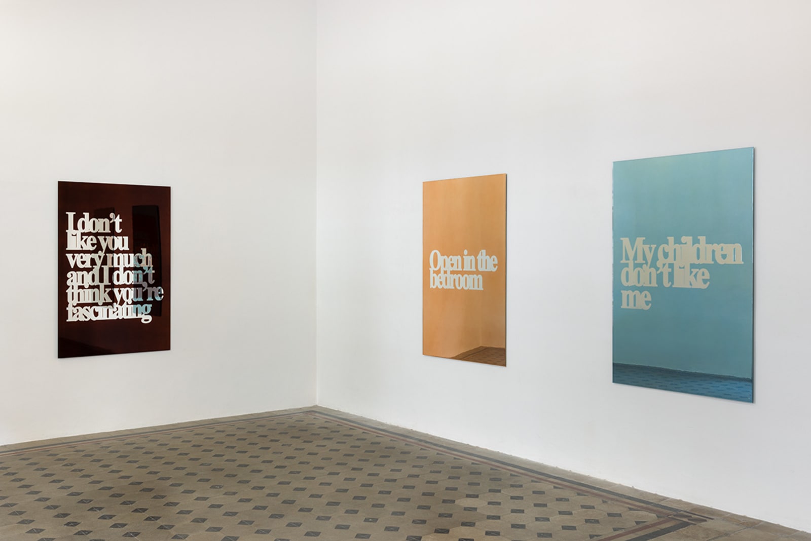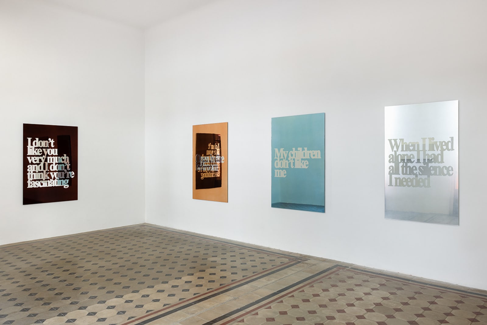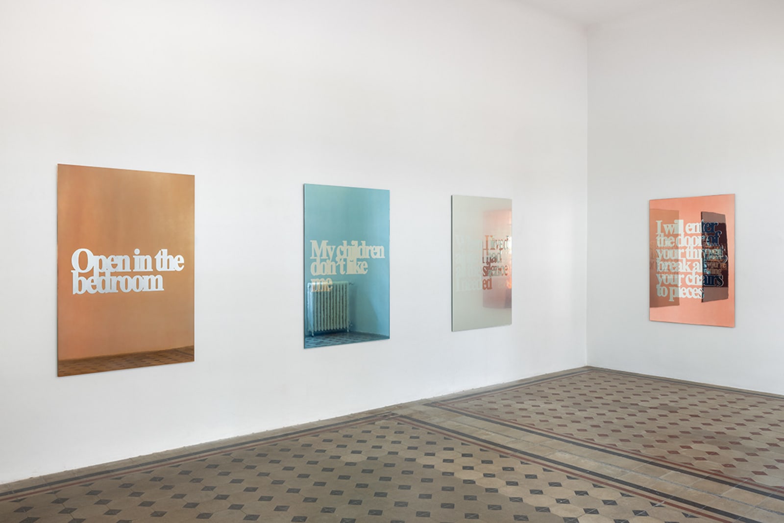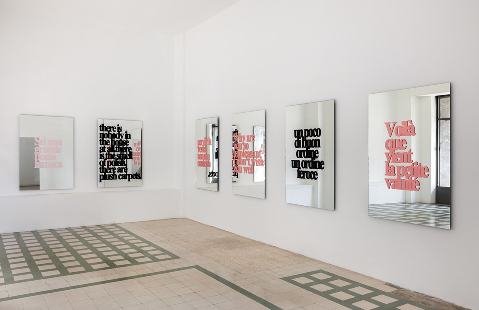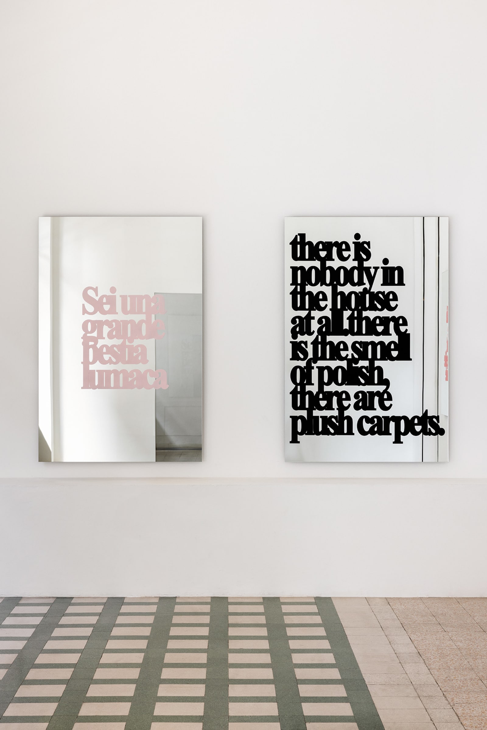 The six mirrors shown in via Stradella 1 feature sentences painted directly on the surface. Mirroring each other, they create a cacophony of overlapping voices capable of transforming the space into a labyrinth of references and situations. These works materialize the trilingual poetry of stateless writer Amelia Rosselli as well as the pitiless, poignant words of contemporary short story novelist Diane Williams and Sylvia Plath’s classical observation.