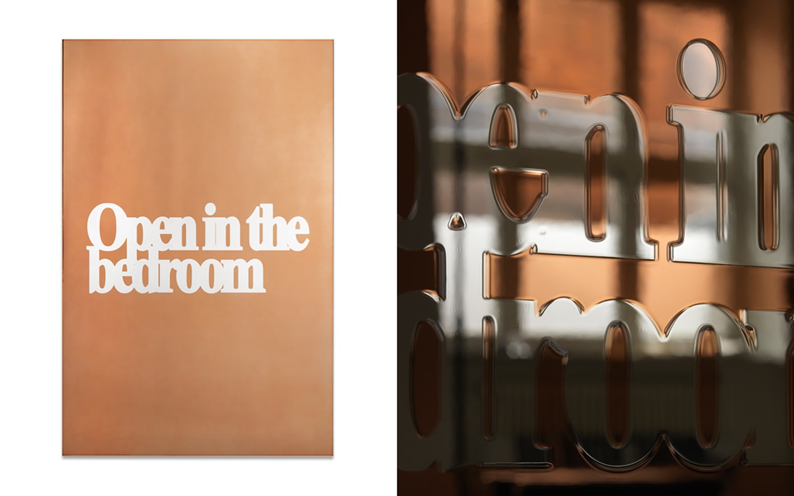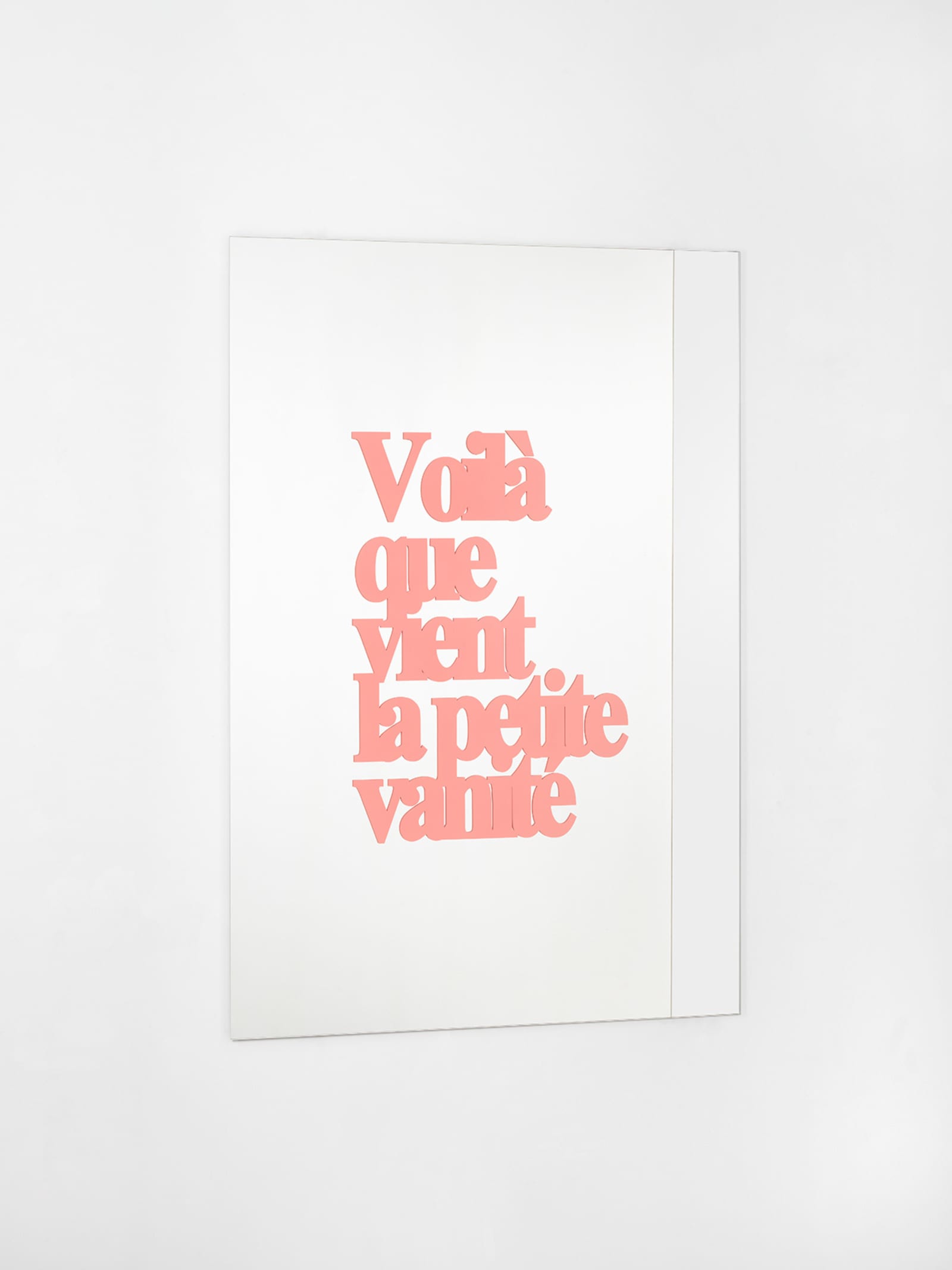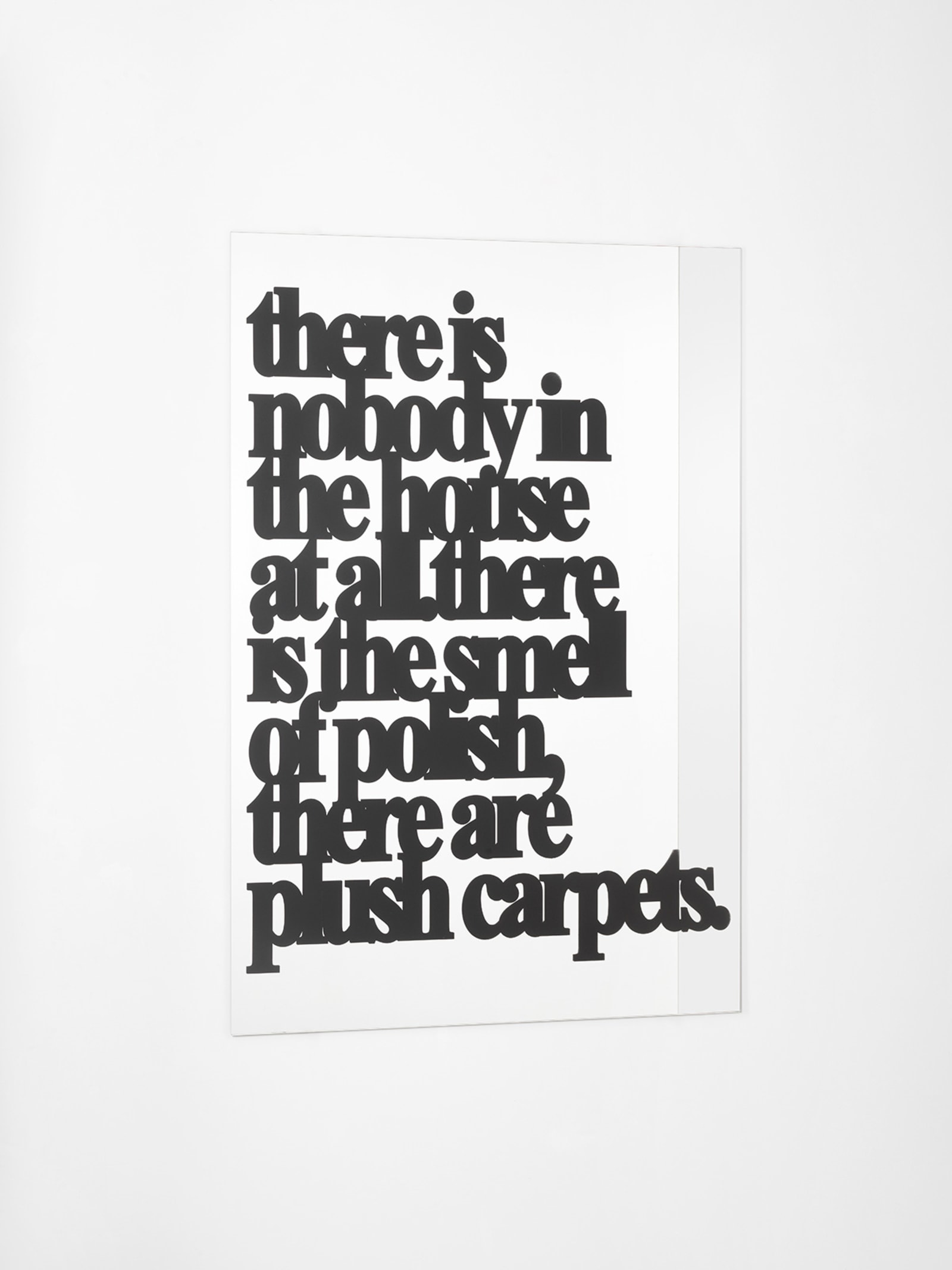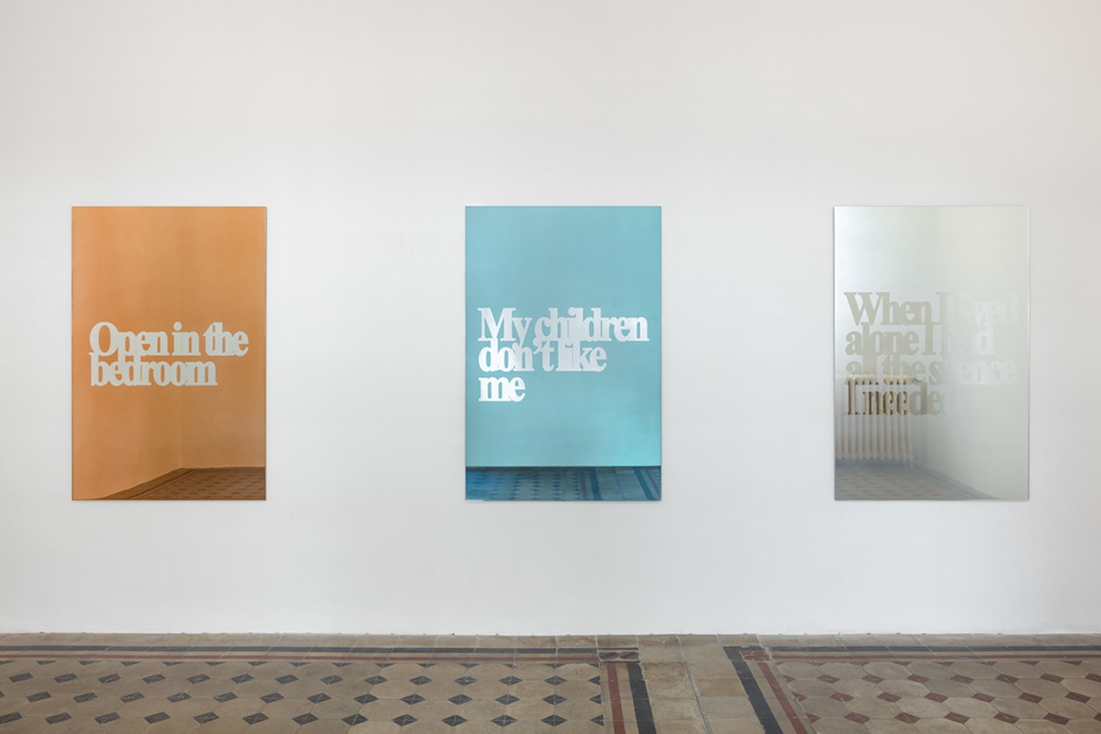 A new series of mirrors depicts quotes and edited texts by writers, all centered around the discomfort stemming from relationships and living within domestic walls. Is A Room of One’s Own—Virginia Woolf’s statement of women’s need for a physical and mental space for self-expression–still relevant?