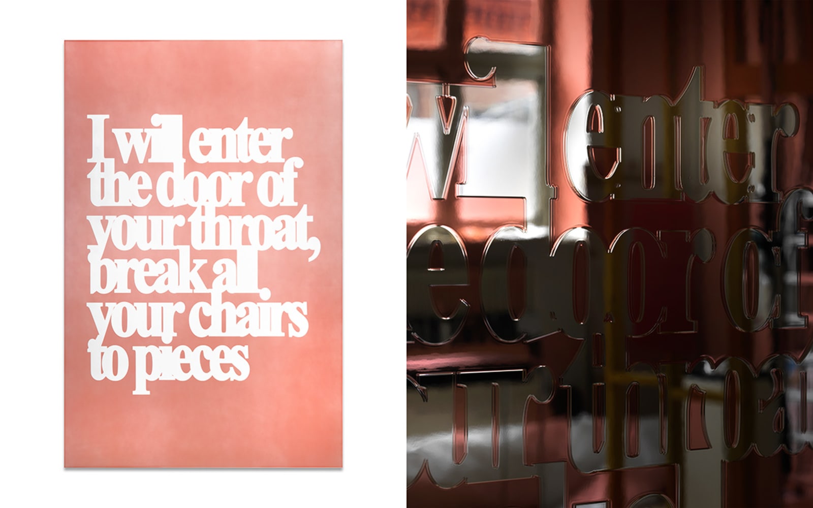 The quotations are mean, harsh, and in total contrast to the slick perfection of the works, in which the words seem to emerge beneath a liquid surface. These sentences come from contemporary writers, well known for their unmediated and uneasy storytelling: from the native American poet Natalie Diaz, to the merciless Lydia Davis and, once again, the refined and scornful words of Diane Williams.
