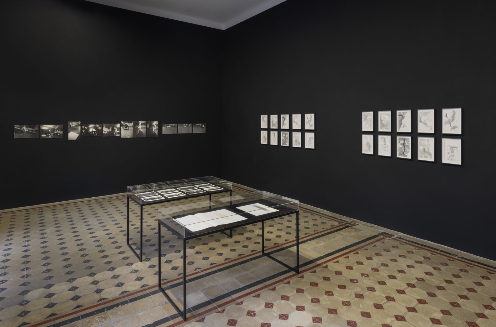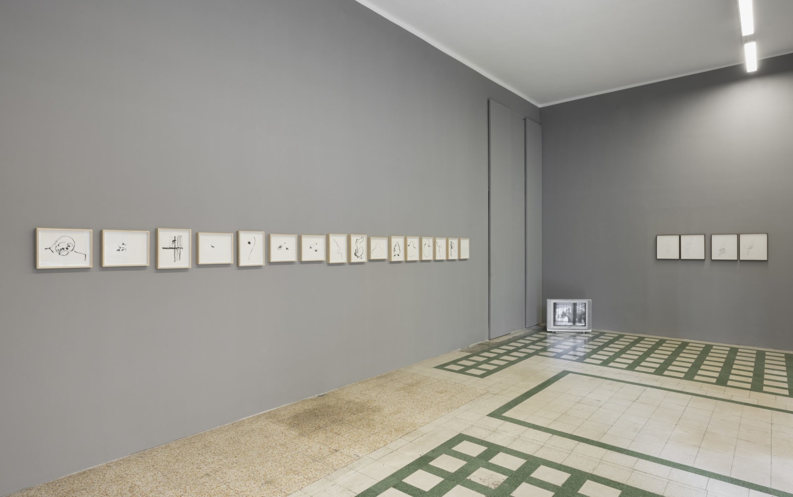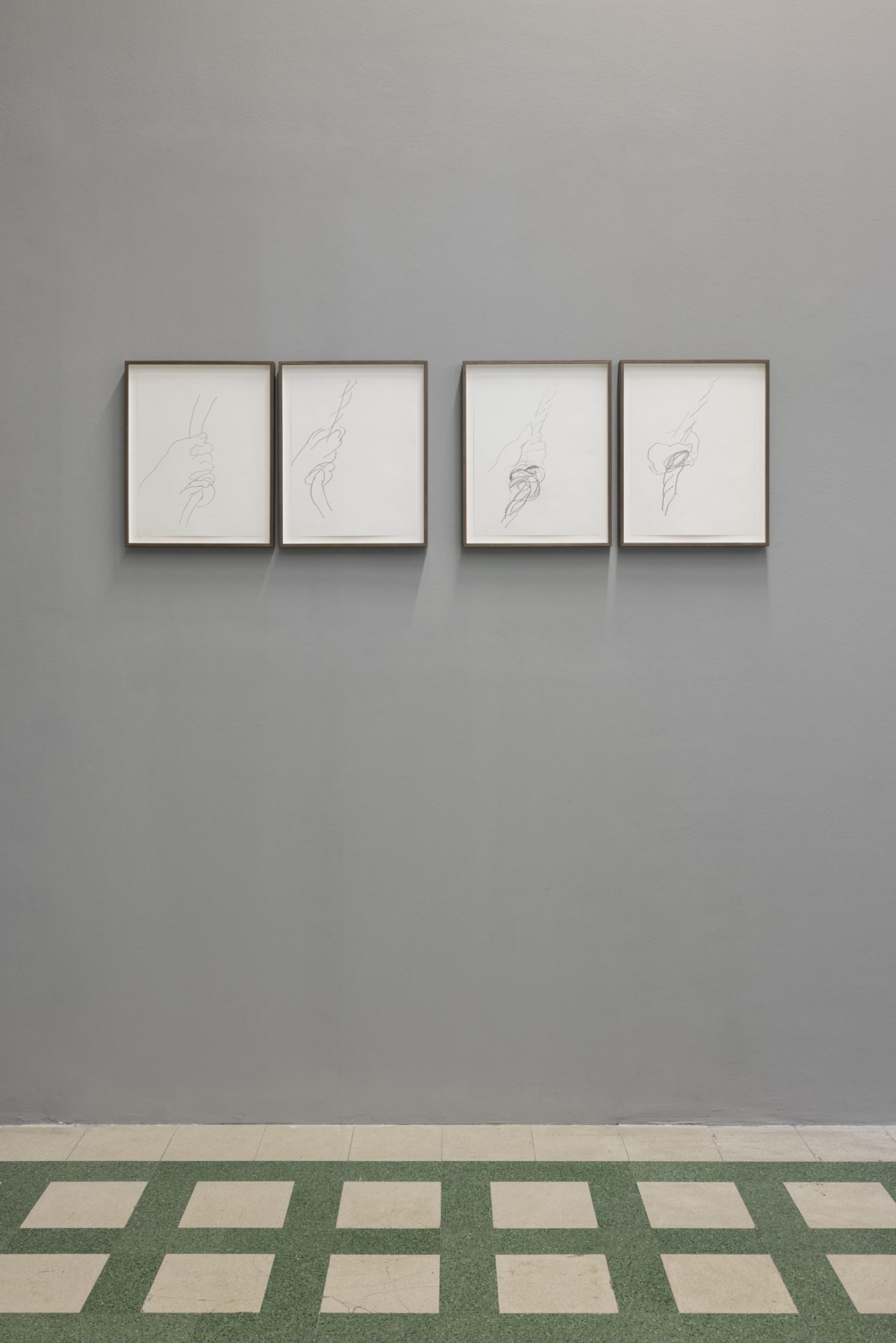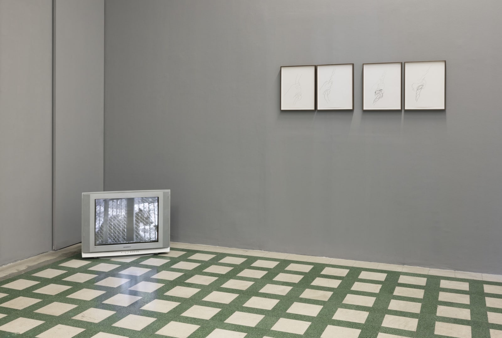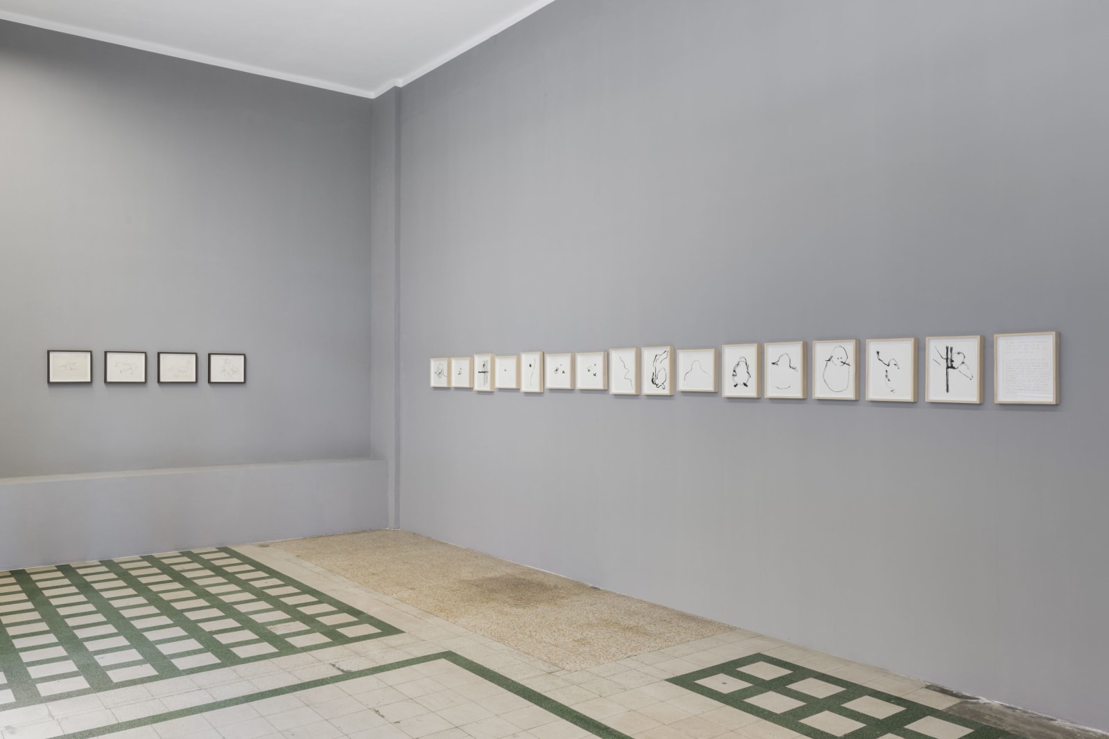 The venue in via Stradella 1 focuses mainly on the prolonged study of the animals and their unconditioned movements undertaken by Simone Forti in 1968. This in-depth research can be seen in the series Tree Drawing: I Stand Where a Bear Stood Clawing This Tree of 2010, an intimate and poetic work on the artist’s almost physical relationship with these mighty animals, and in the polyptych Animal Study – Oxen, Turkey, Ostrich (1982) drawings that mark the beginning of the use of language in the artist’s work and show the attempt to transcribe the wholeness of animal bodies and their fluidity by relating their movements to their communication systems, for a study on the relationship between dance and speech.