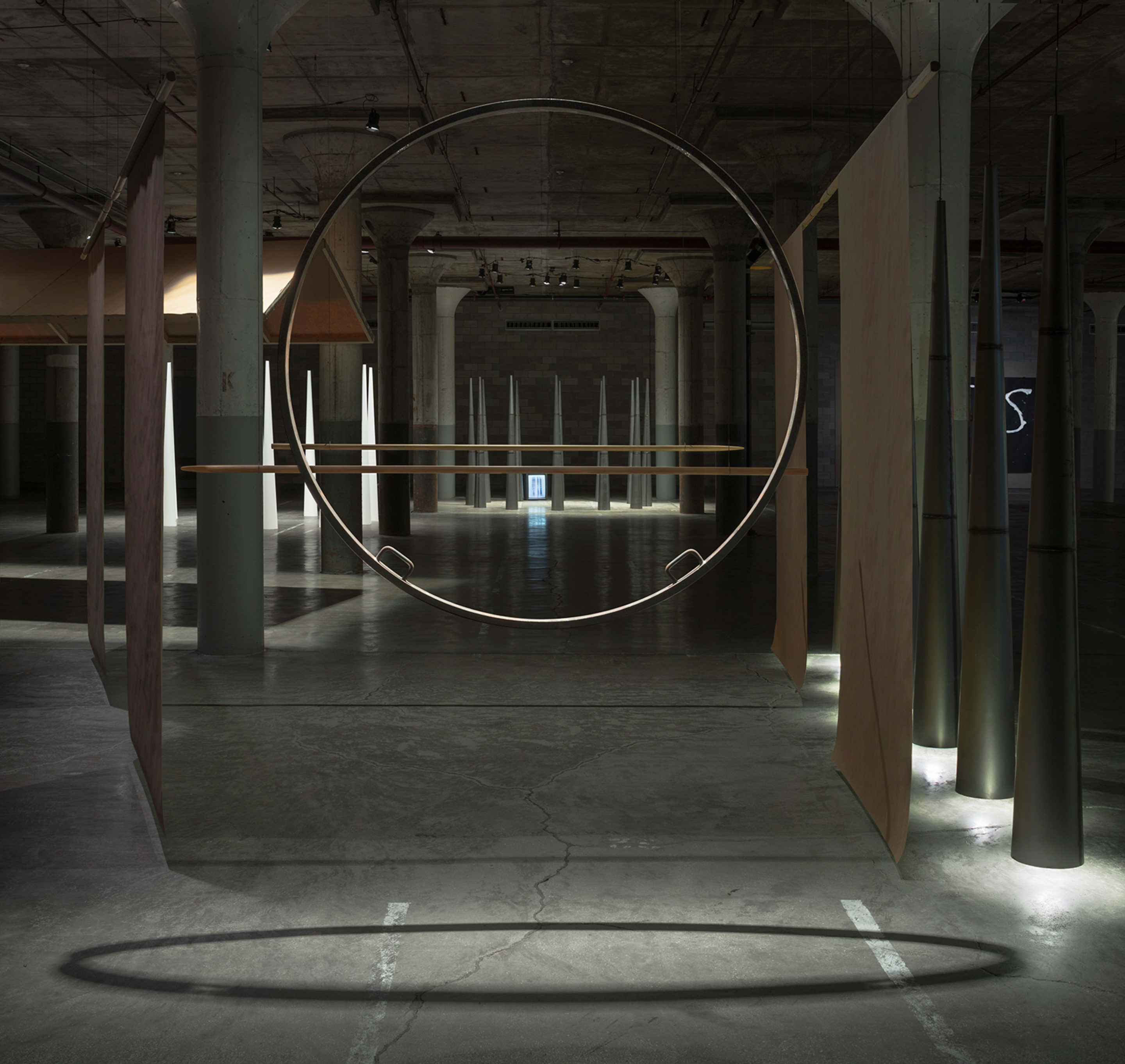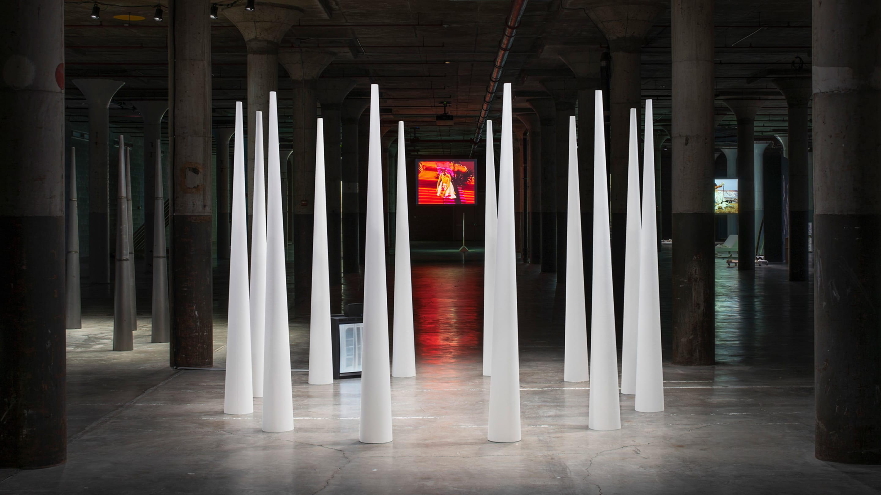 Jonas created Stage Sets for her first solo exhibition, which was held at the Institute of Contemporary Art (ICA), University of Pennsylvania in Philadelphia. Composed of elements from several different performance works, including Funnel (1974) and Mirage (1976), Stage Sets was what Jonas referred to at the time as an “environment”. Suspended paper walls, punctuated with horizontal rods, receded toward a hoop, as in the set for Funnel. Metal cones, like those used in Mirage, were also suspended from the ceiling, directing light into pools on the floor. Other components included replicas of an accounting chair Jonas used in Organic Honey, a ladder, a suspended rooflike structure, a tall, mirrored compartment topped with a red, open-frame conical form, a large, sloped table with drawings, and a mirror with a mechanical moth toy. Jonas also included wall drawings related to those that appear in the film and performance Mirage (1976). The ICA billed the exhibition as “an environment and four events,” a five-part program comprising the environment Stage Sets (1976), and four related events: a performance of Mirage (1976); the premiere performance of The Juniper Tree (1976), commissioned by the ICA for an audience of children; a screening of Jonas’s films; and continuous daily screenings of a program of Jonas’s videos. In 2018, Jonas reconstructed Stage Sets (1976/2018) at Tate Modern, London, and the work was subsequently acquired by the Dia Art Foundation, New York, acquired the installation Stage Sets (1976/2018) in 2019.