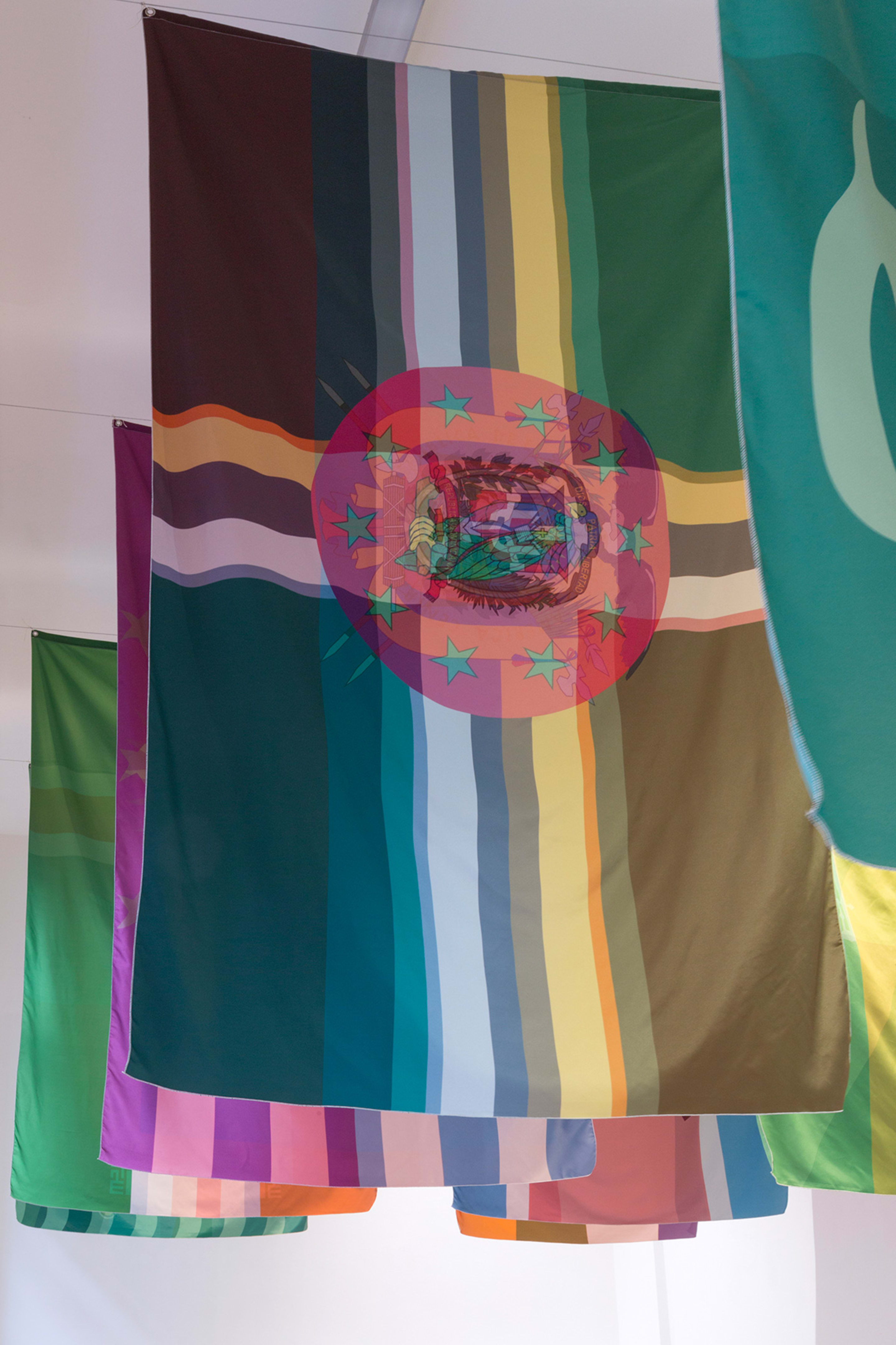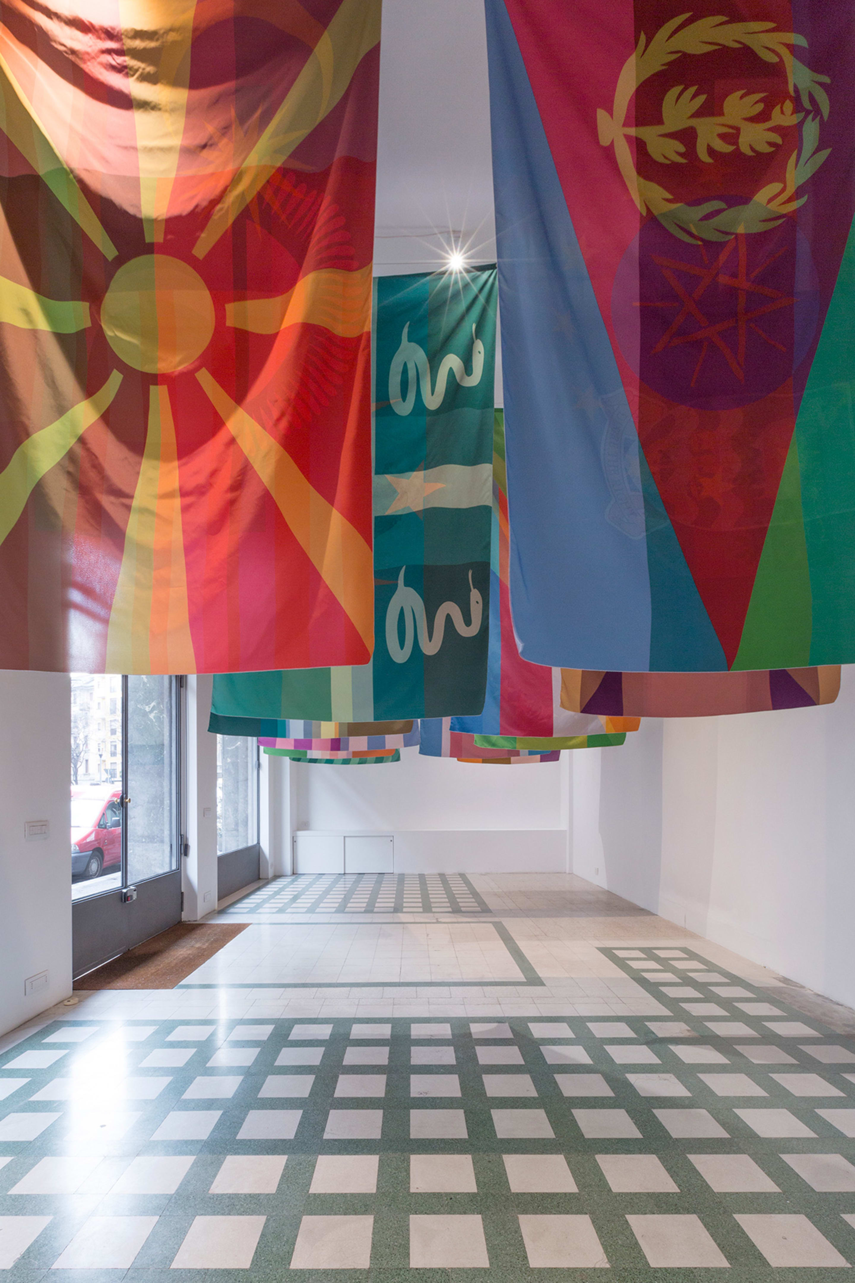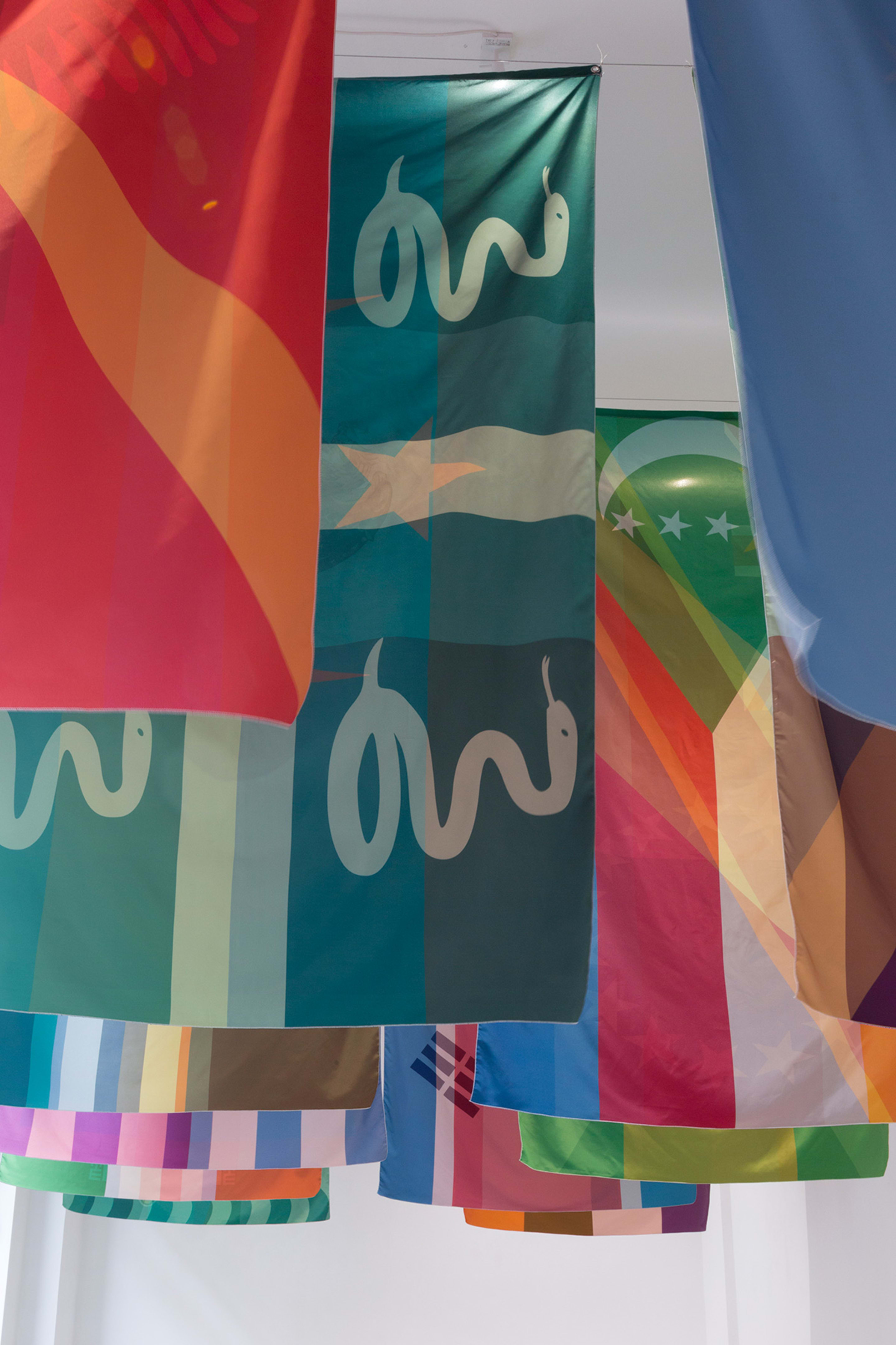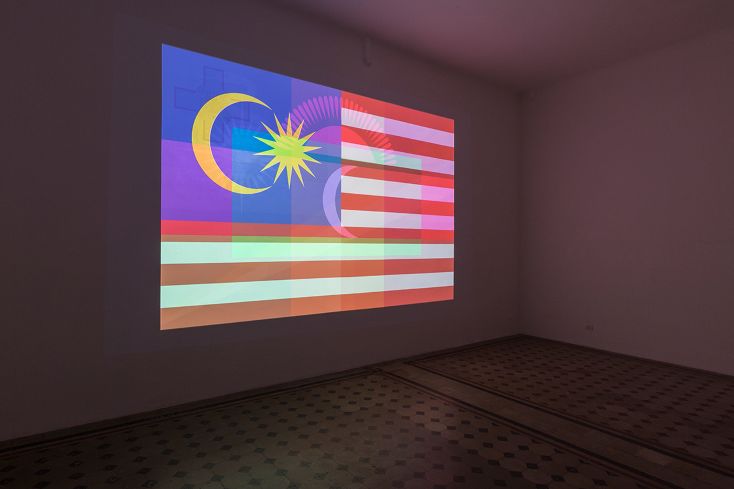 The video To Breathe – The Flags (2012) reflects on a transnational state of identity, merging two hundred forty-six national flags as indistinguishable cross-pollinating visual symbols: their purported intents—as symbols of state sovereignty and nationhood— are emptied and reconfigured by layering and cross-fading. As the images are semi-transparent, the colors and designs of multiple flags are intermixed, resulting in a visual and symbolic breakdown of hierarchies, and transcendence of boundaries blurring the distinctions between different countries.