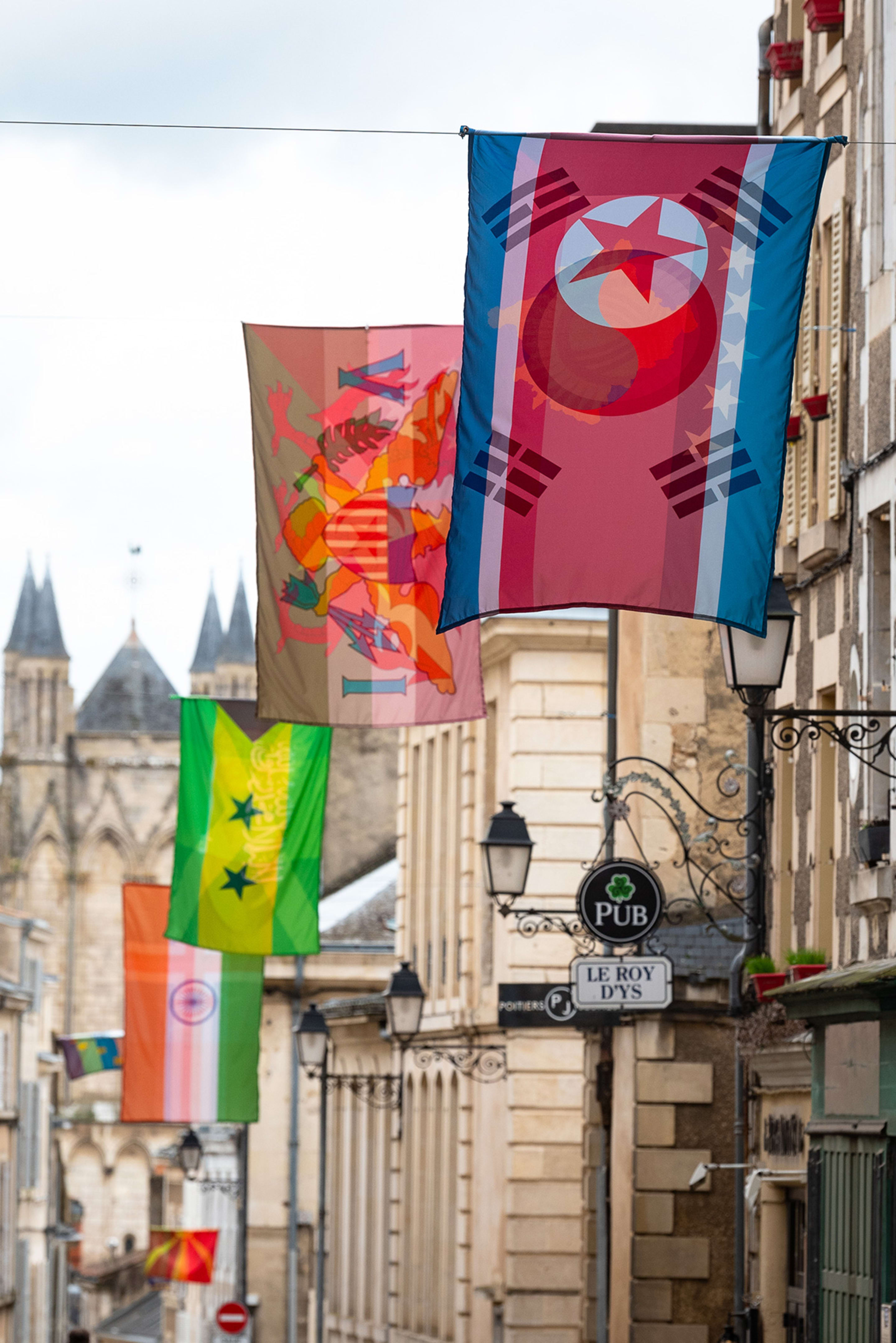 To Breathe – Zone of Nowhere exists in a multi-form installation, where the number of flags adapts to the space: it has been installed in 2018 at PICA Perth Institute of Contemporary Art and as an outdoor installation at Traversées \ Kimsooja in Poitiers. The work’s effect transforms the ubiquitous national symbol of the flag into a more tentative object, one that is provisional and fluid, without hierarchy or political bias, putting all nations on the same level: a visual experience in which differences and conflicts between nations can fuse and blend together as one.