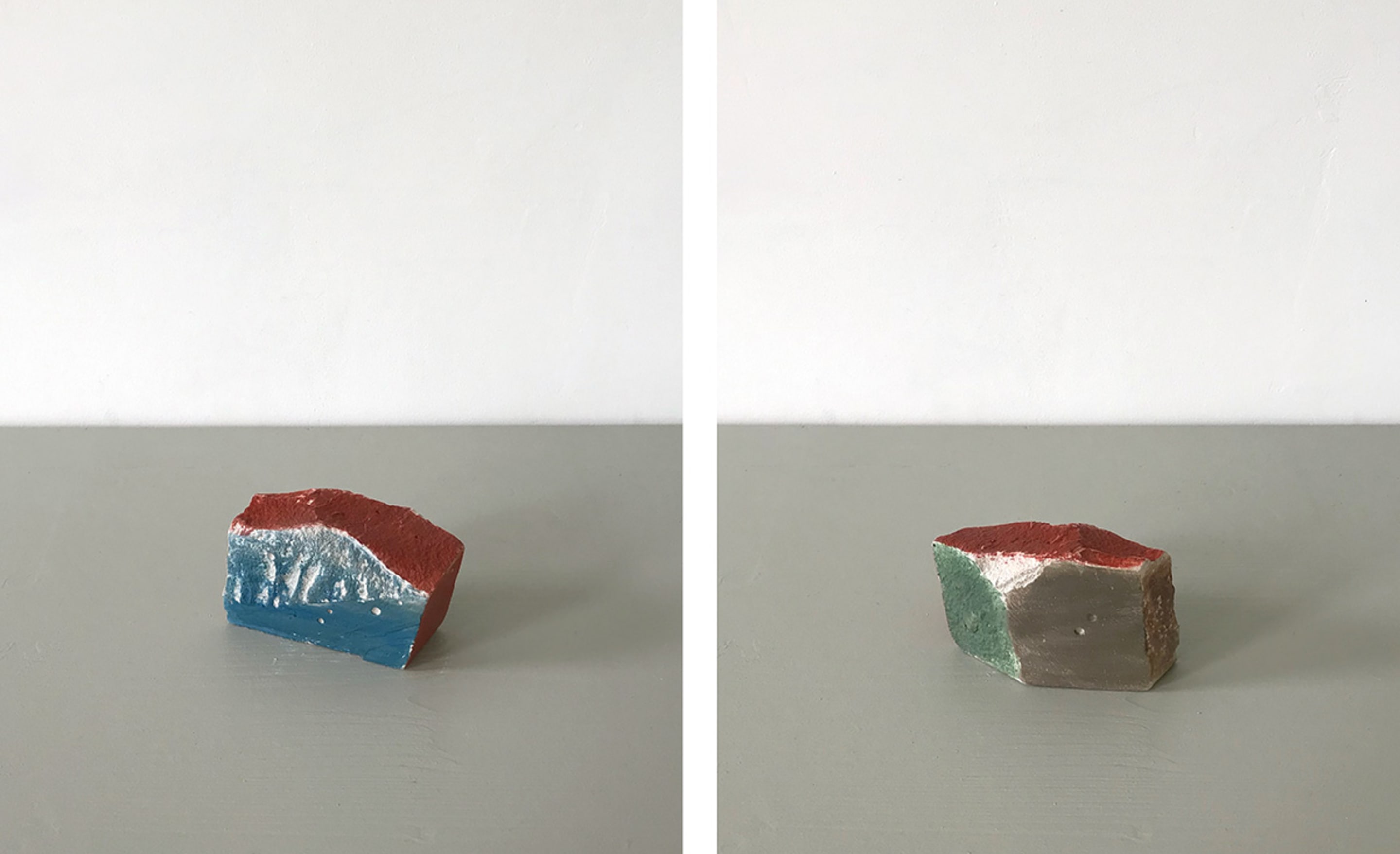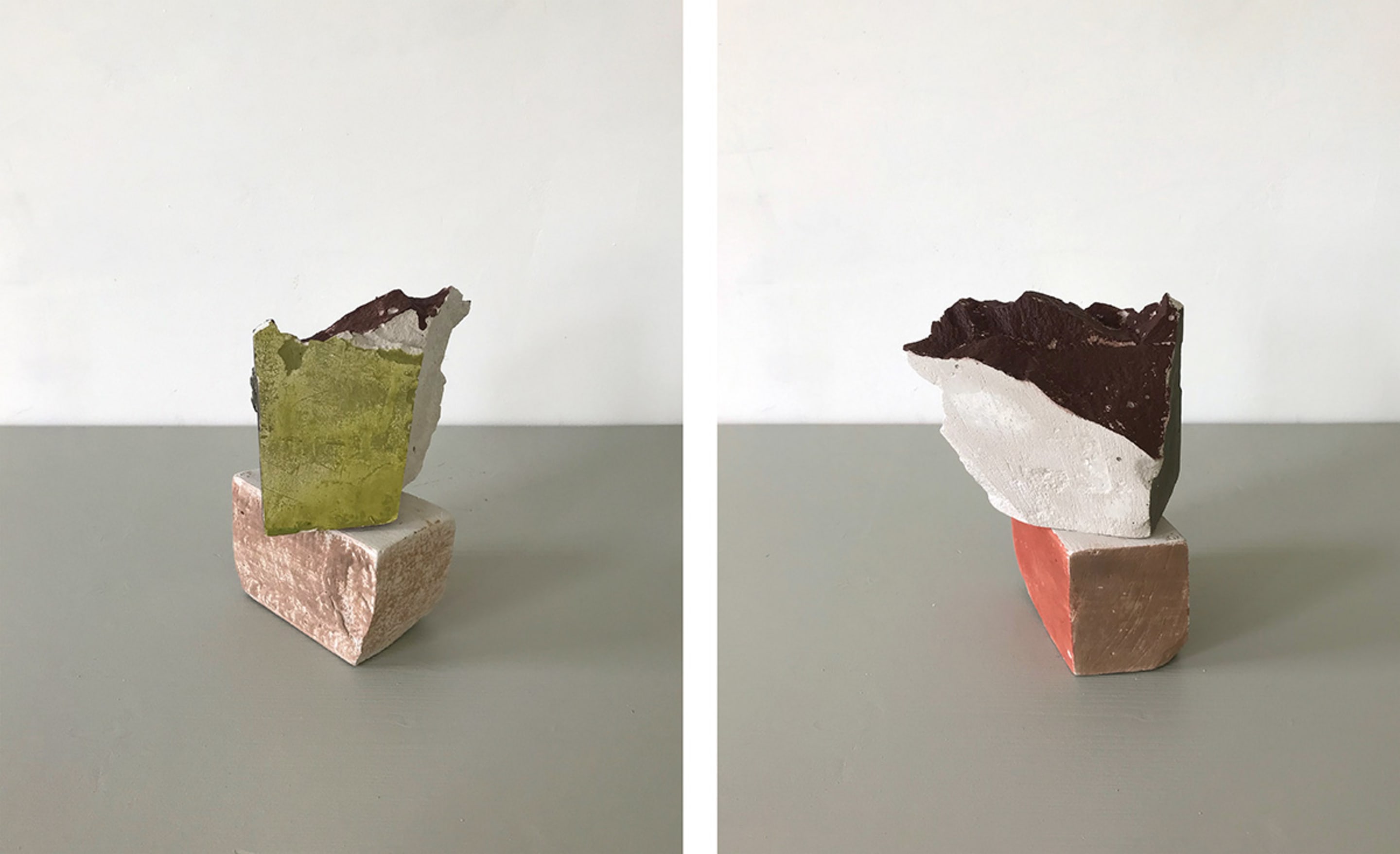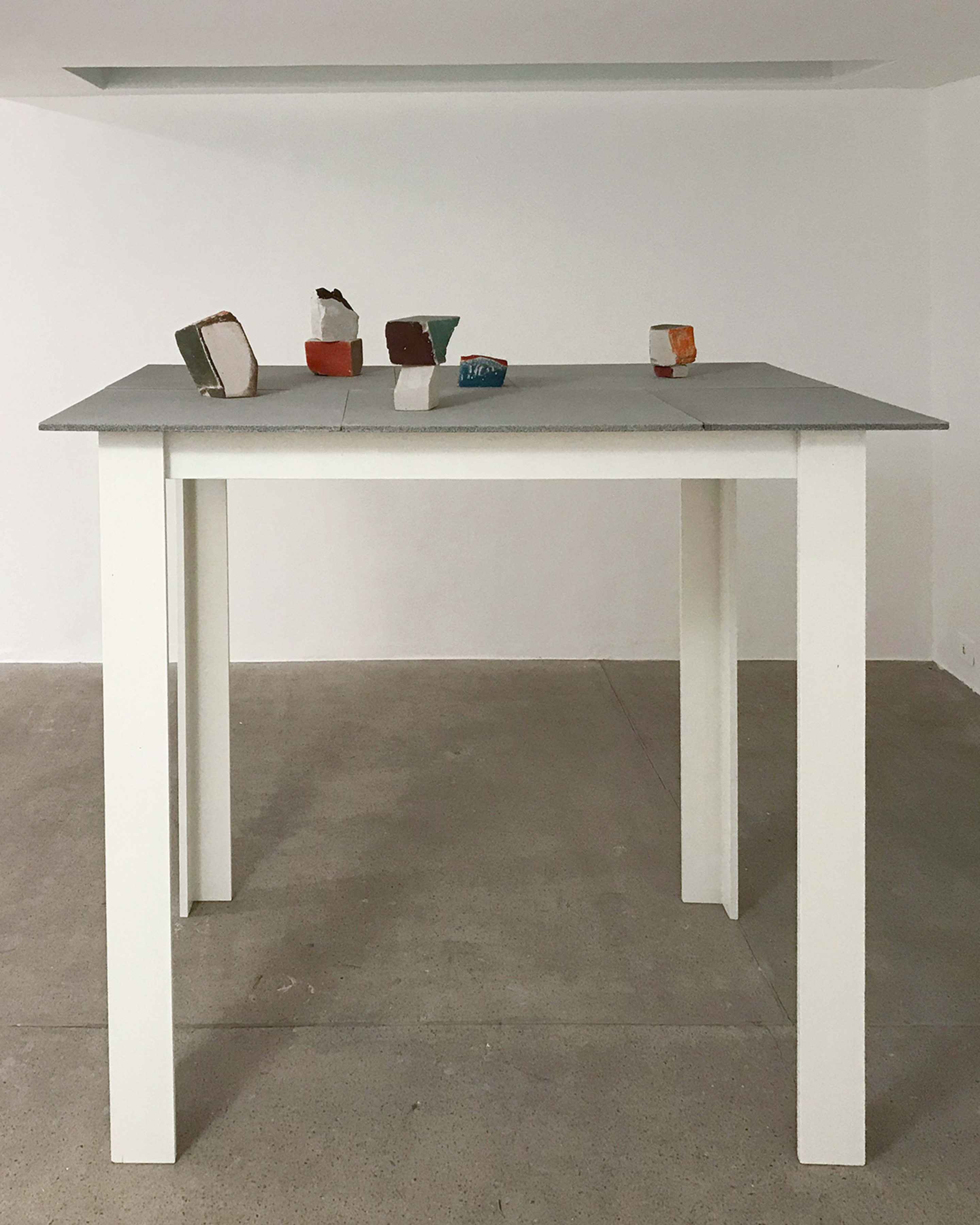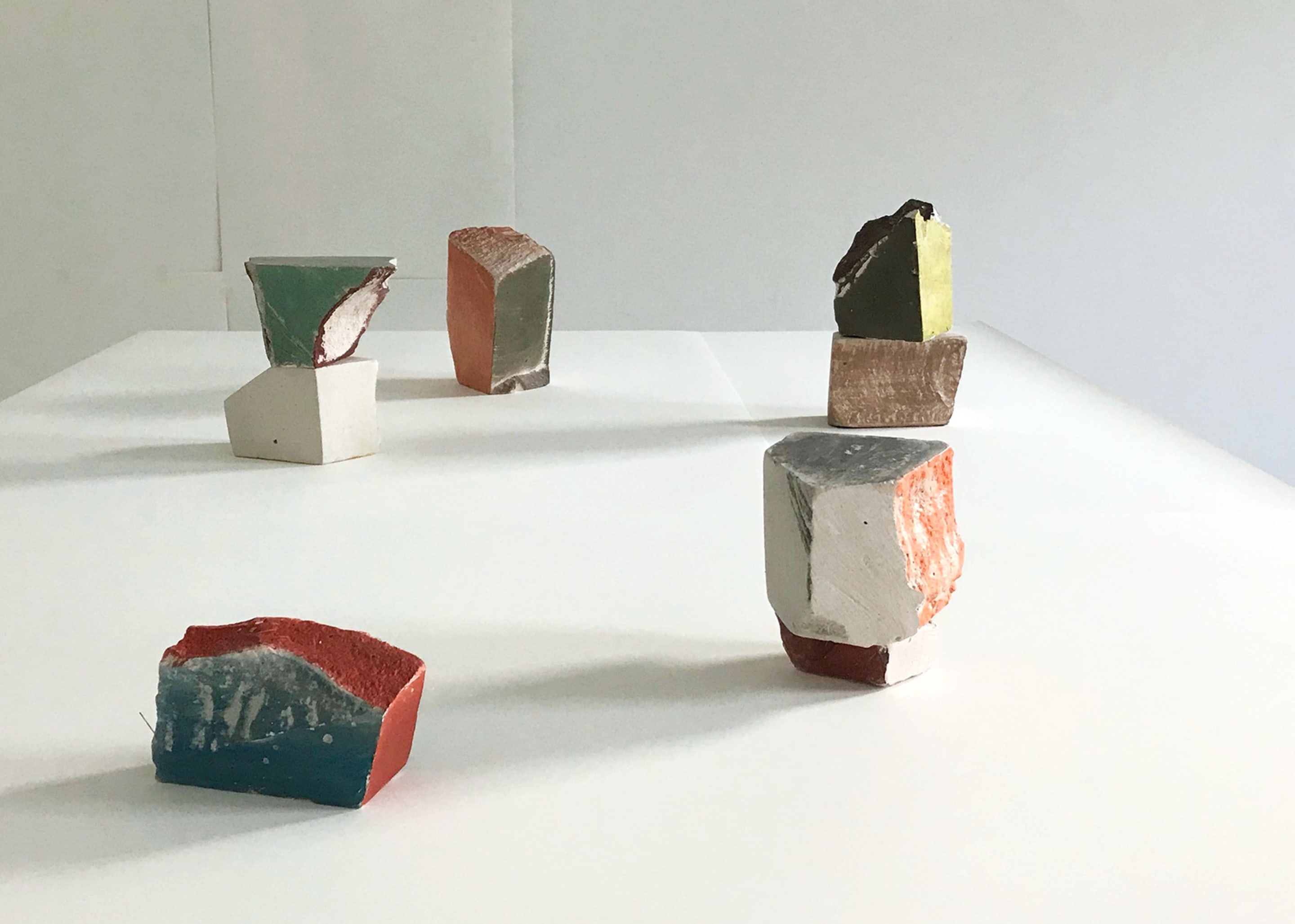 Five sculptures, small angular plaster objects, cut along straight lines, lay on a table of light‑colored wood and stand as outlines of human heads. They are part of Bächli’s most recent production and were first exhibited in her solo exhibition at Kunsthalle Karlsruhe in 2019: composed of flat, porous surfaces, whose imperfect conjunctions contain the fields of colors, they recall the very same palettes that occupy the walls, and present the very same painterly qualities they own on paper.