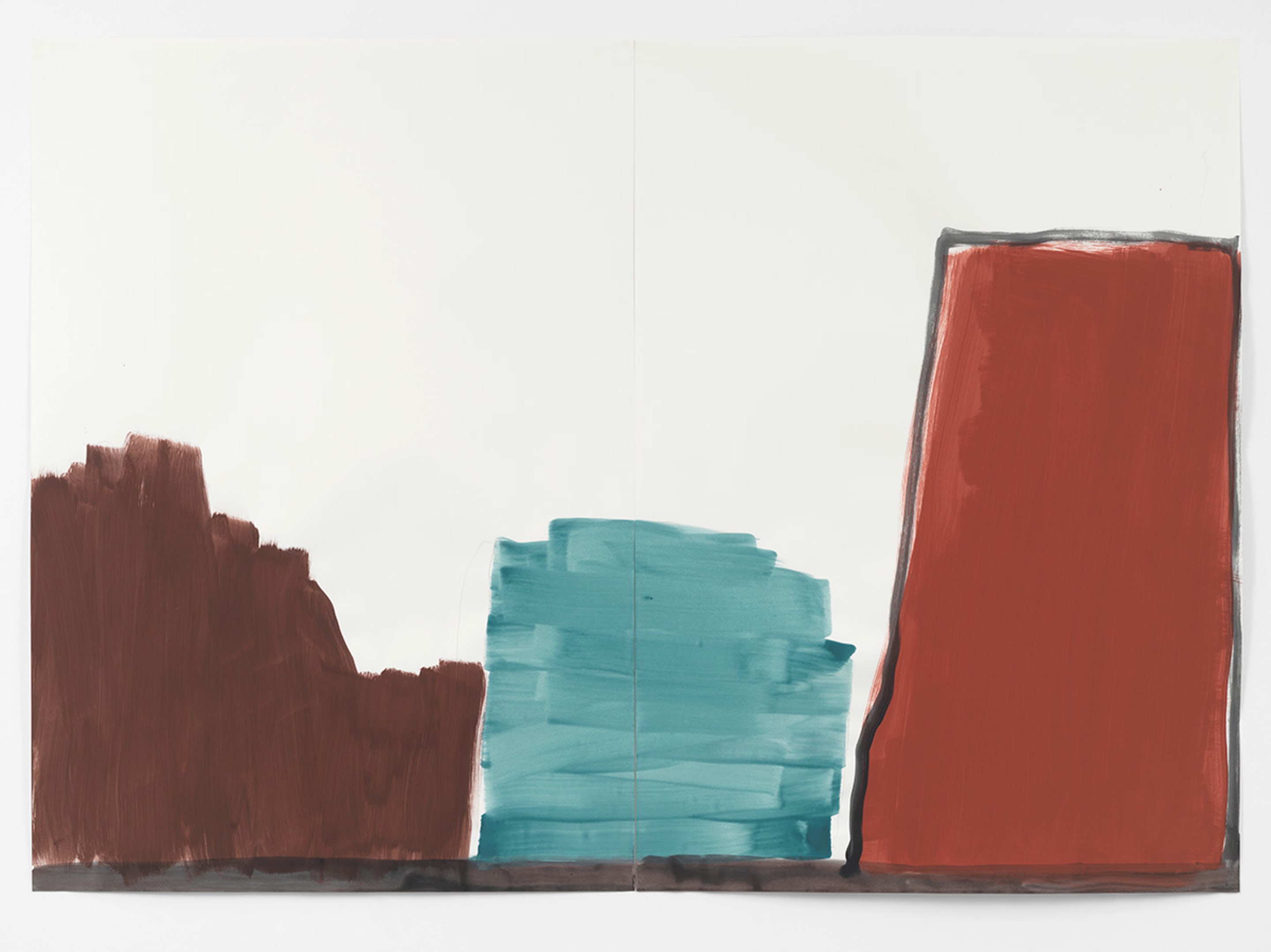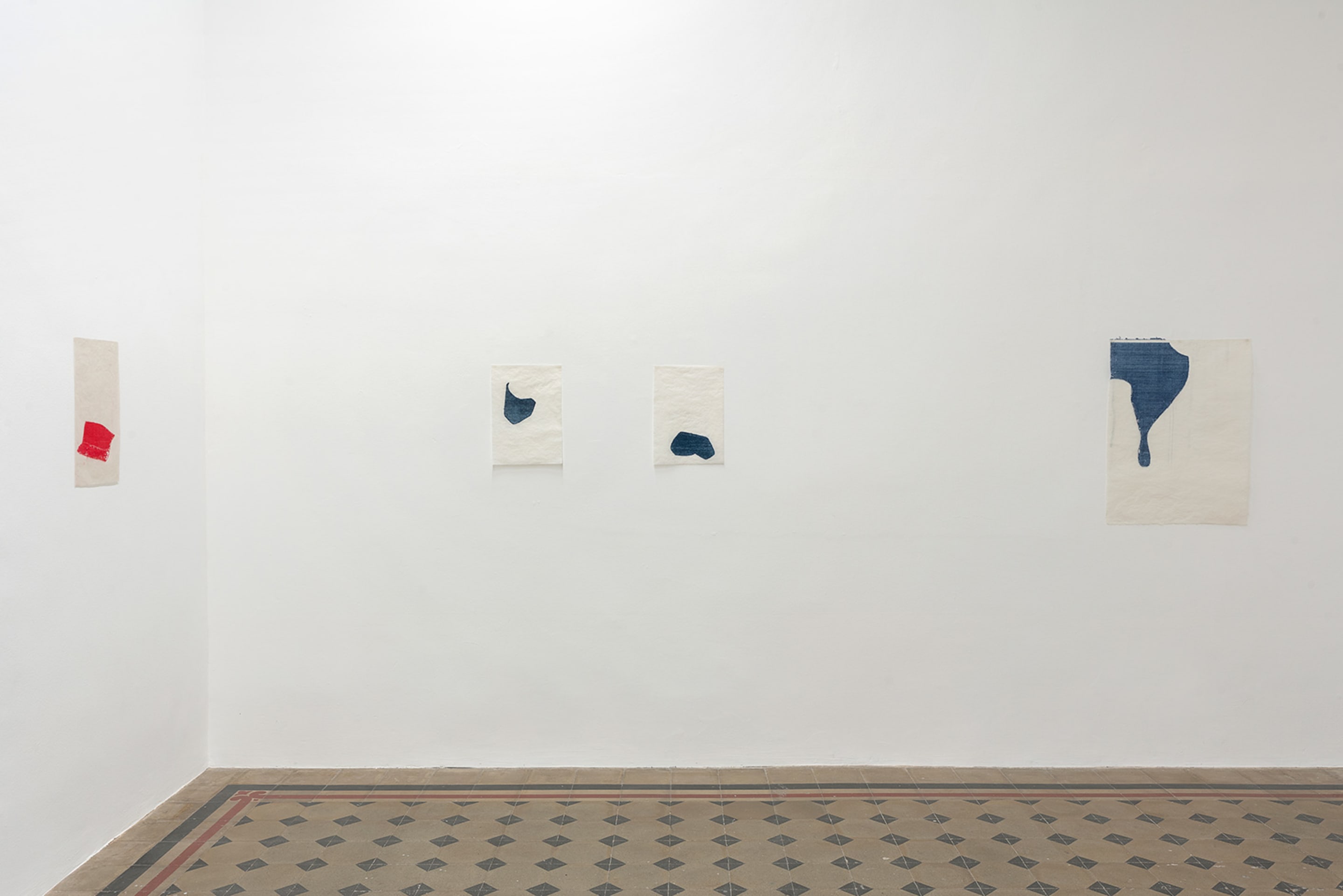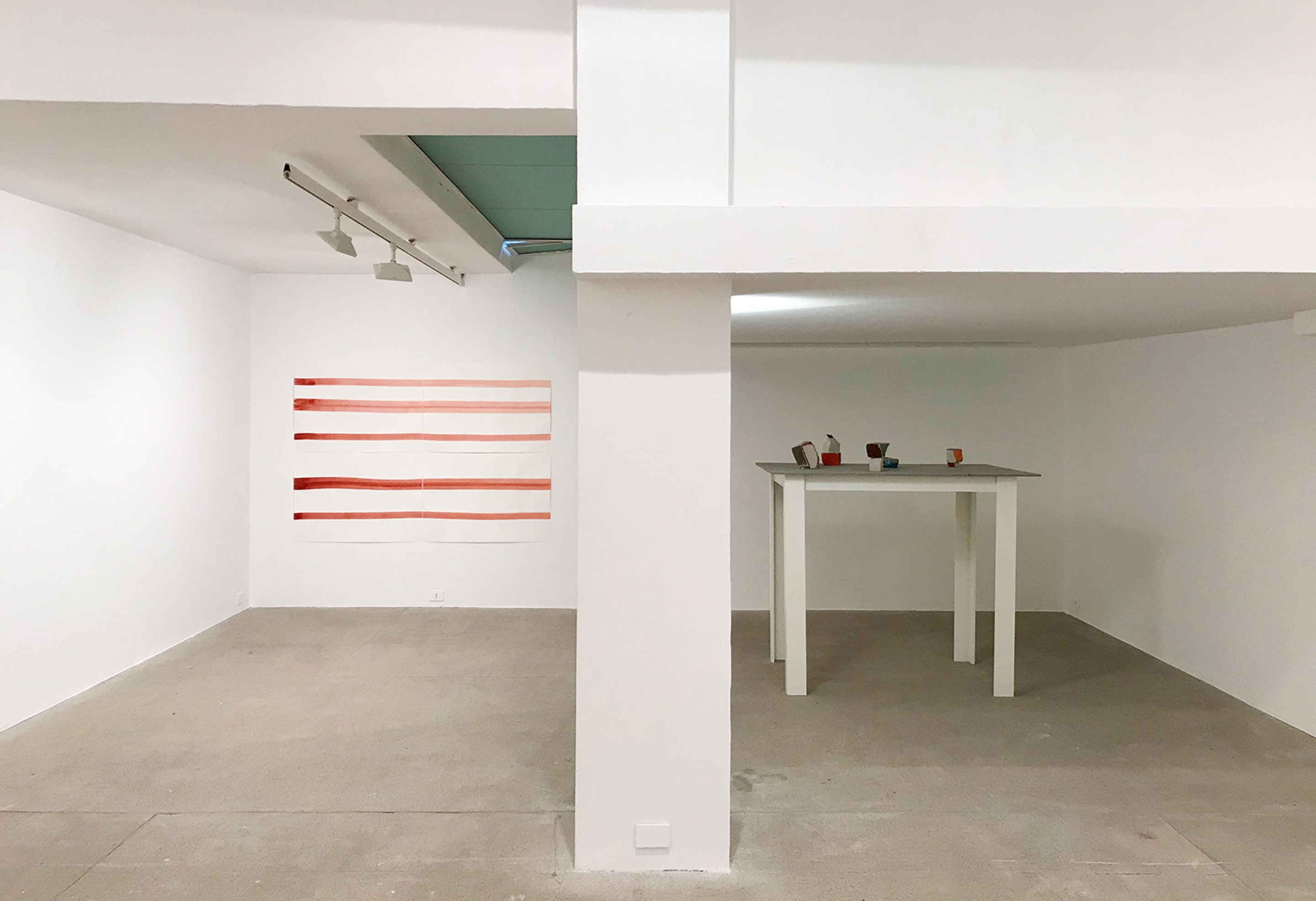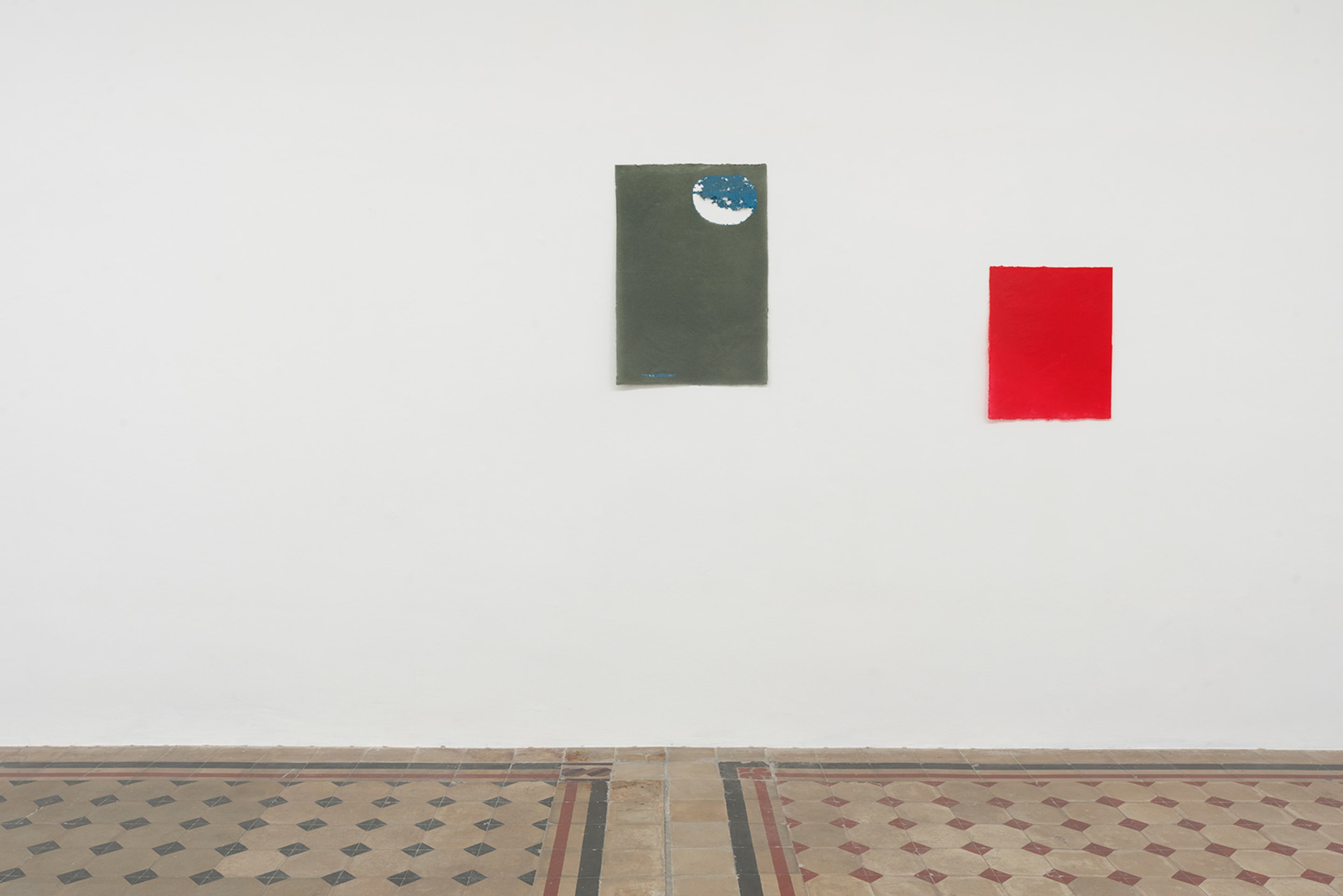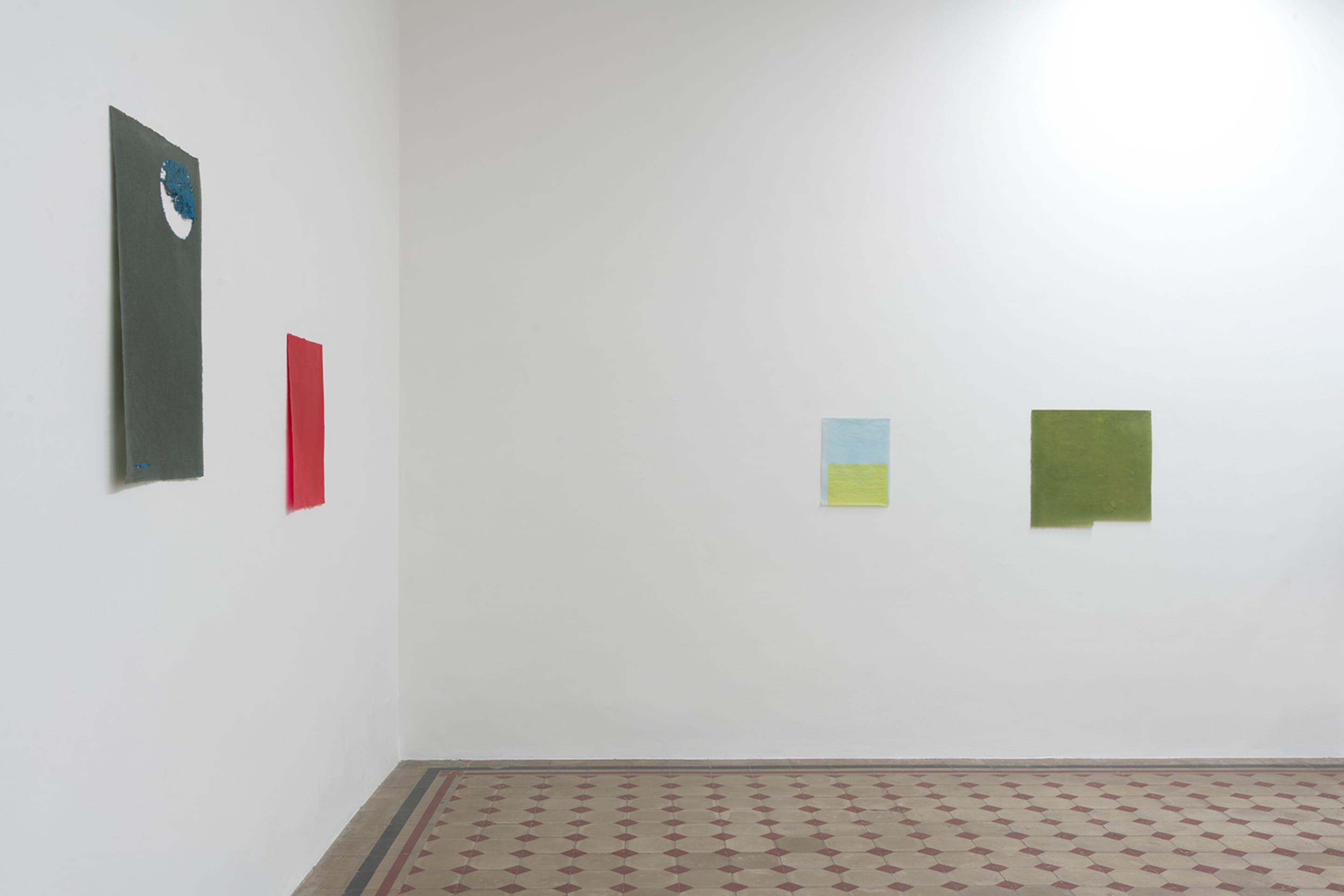 Five sculptures, small angular plaster objects, cut along straight lines, lay on a table of light‑colored wood and stand as outlines of human heads. They are part of Bächli’s most recent production and were first exhibited in her solo exhibition at Kunsthalle Karlsruhe in 2019: composed of flat, porous surfaces, whose imperfect conjunctions contain the fields of colors, they recall the very same palettes that occupy the walls, and present the very same painterly qualities they own on paper.