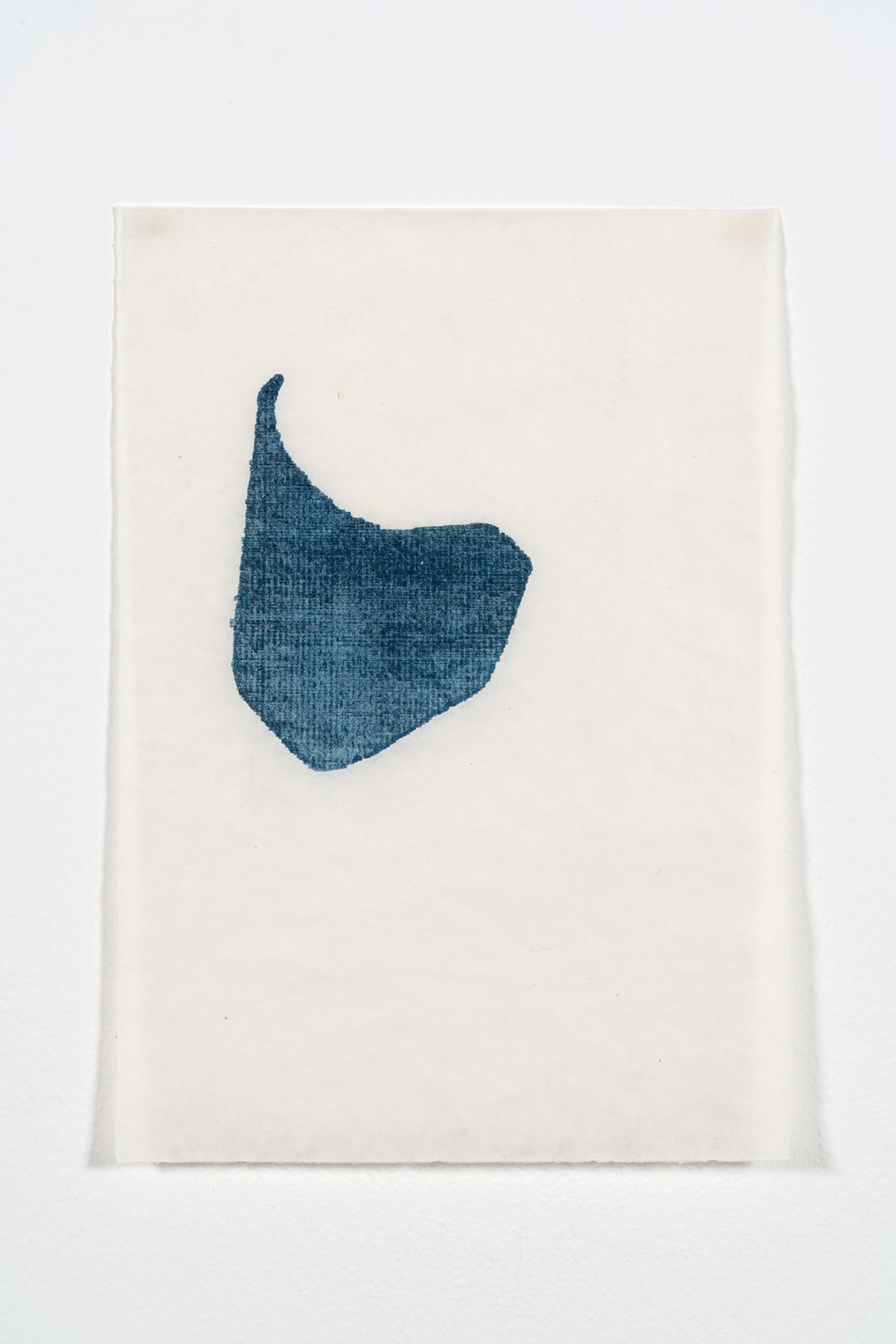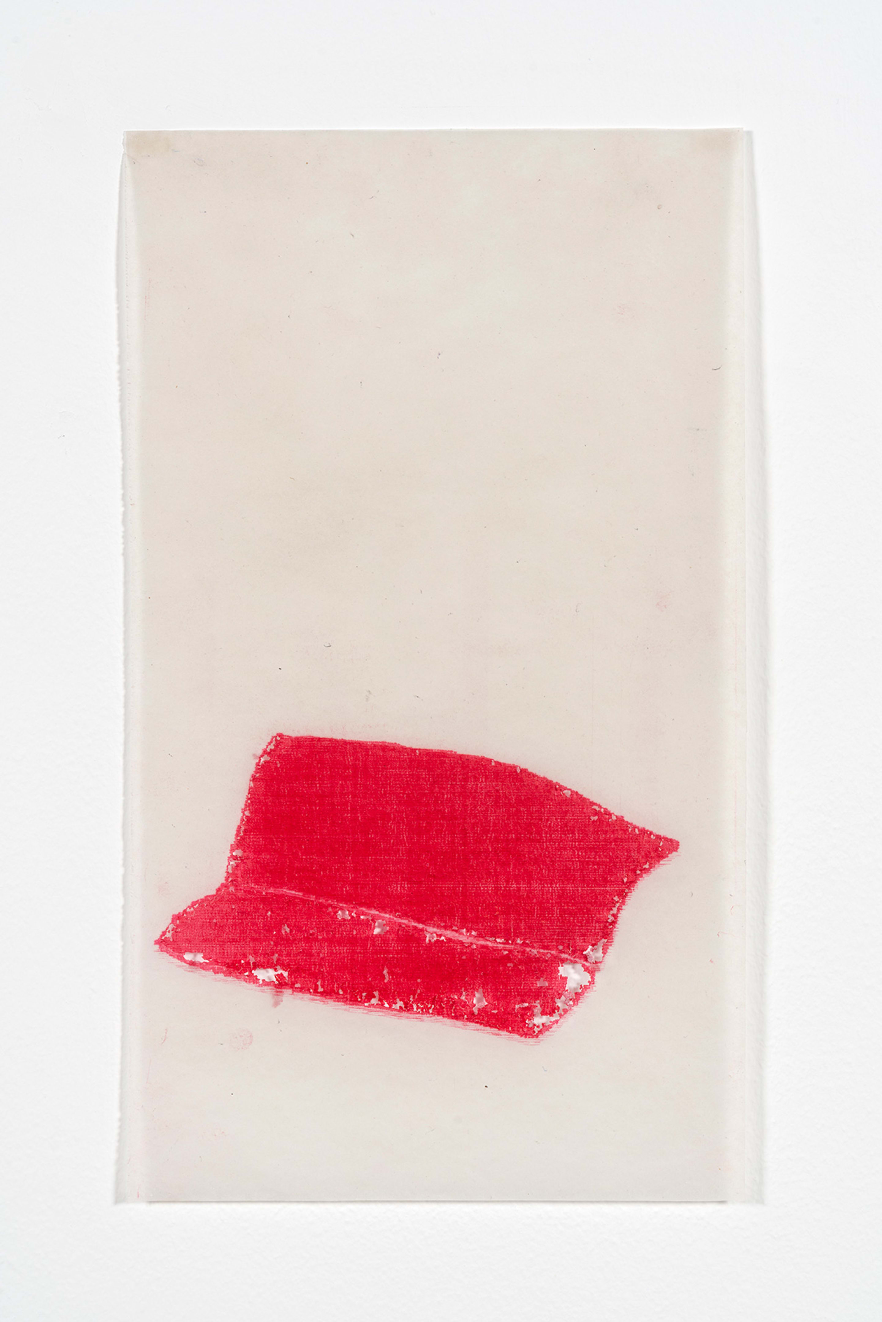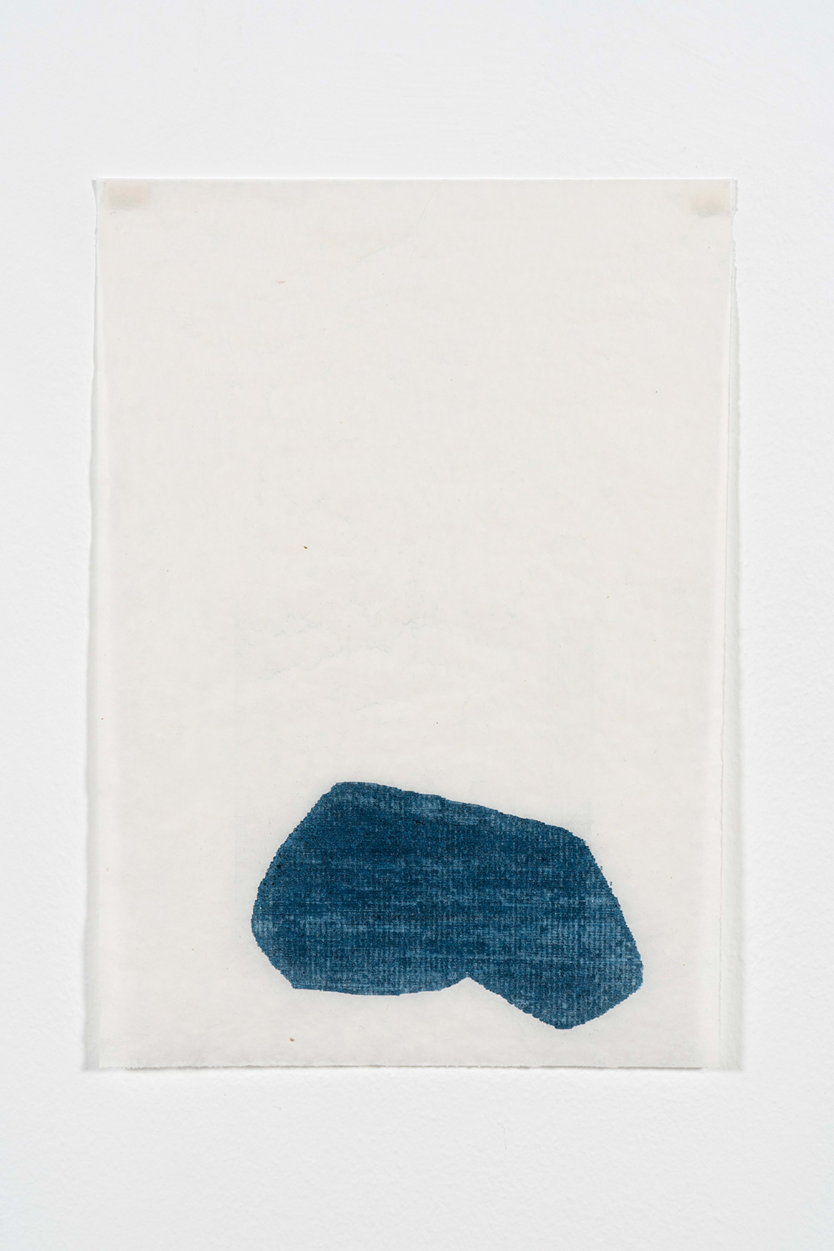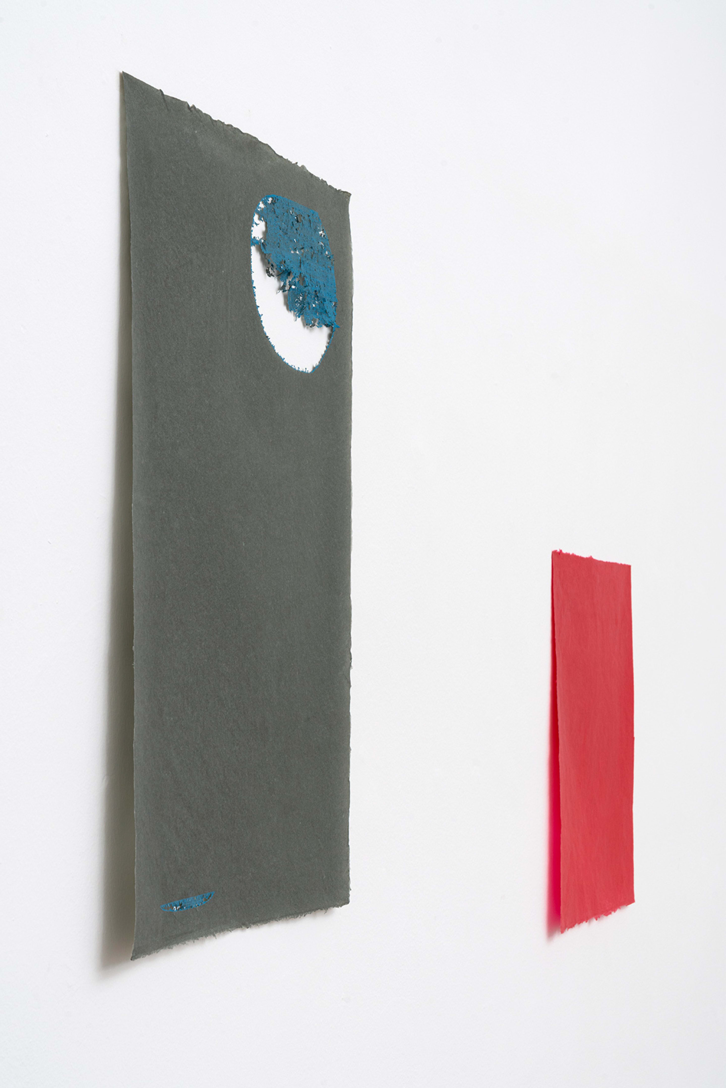 Five sculptures, small angular plaster objects, cut along straight lines, lay on a table of light‑colored wood and stand as outlines of human heads. They are part of Bächli’s most recent production and were first exhibited in her solo exhibition at Kunsthalle Karlsruhe in 2019: composed of flat, porous surfaces, whose imperfect conjunctions contain the fields of colors, they recall the very same palettes that occupy the walls, and present the very same painterly qualities they own on paper.