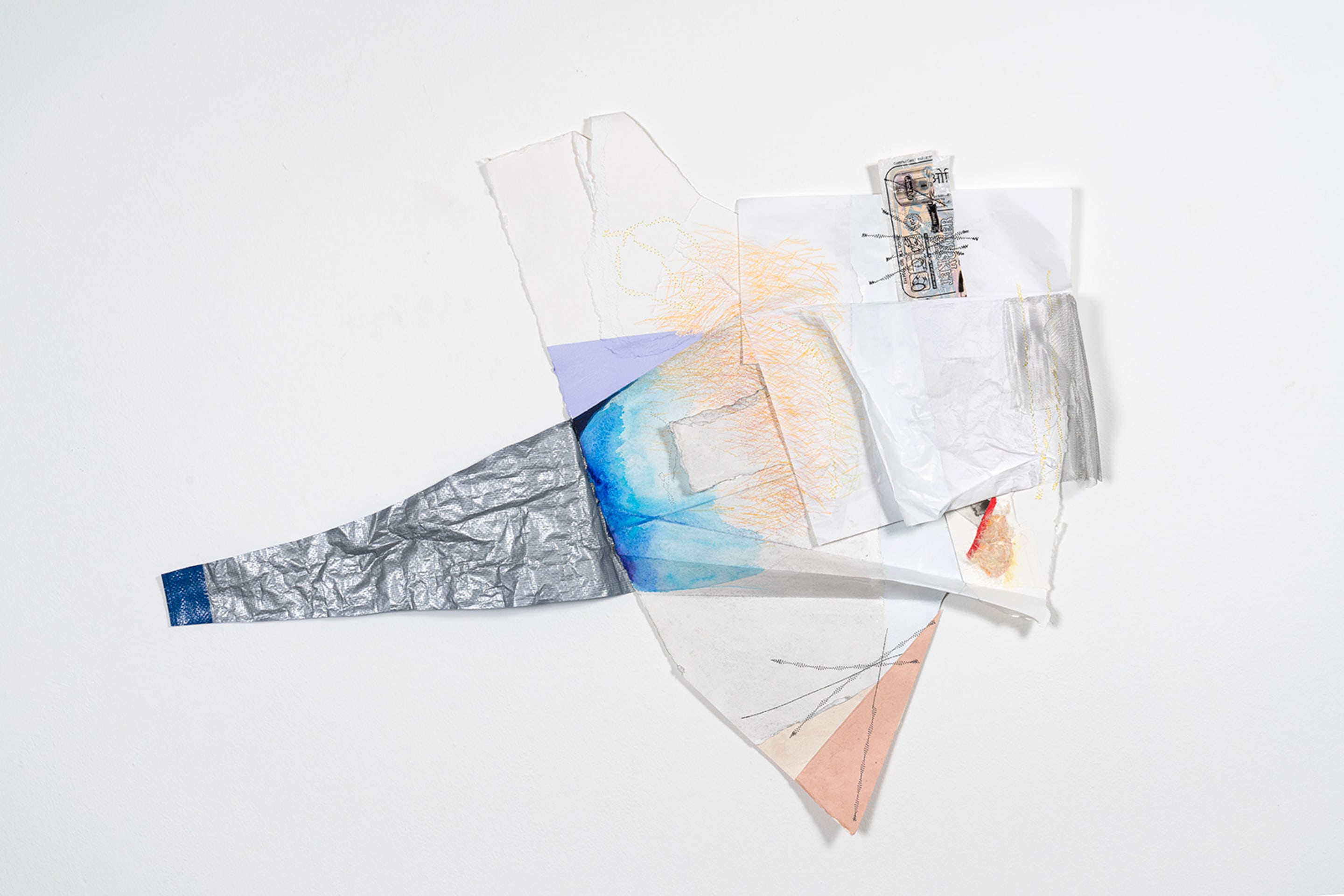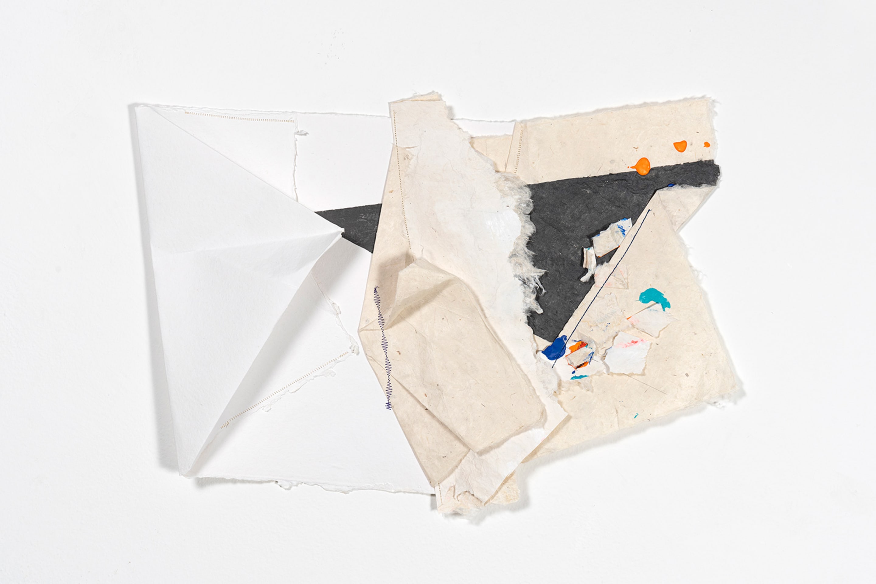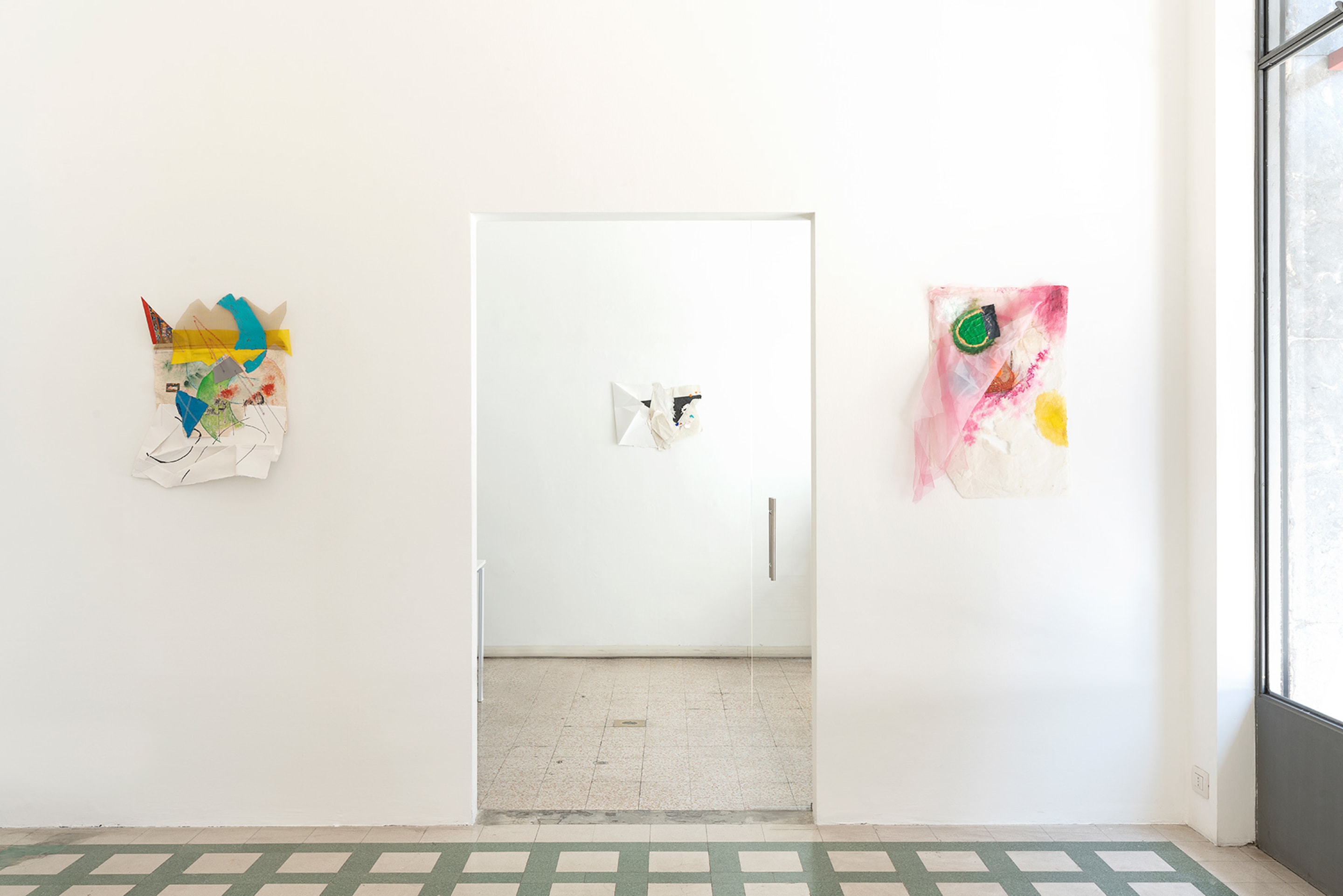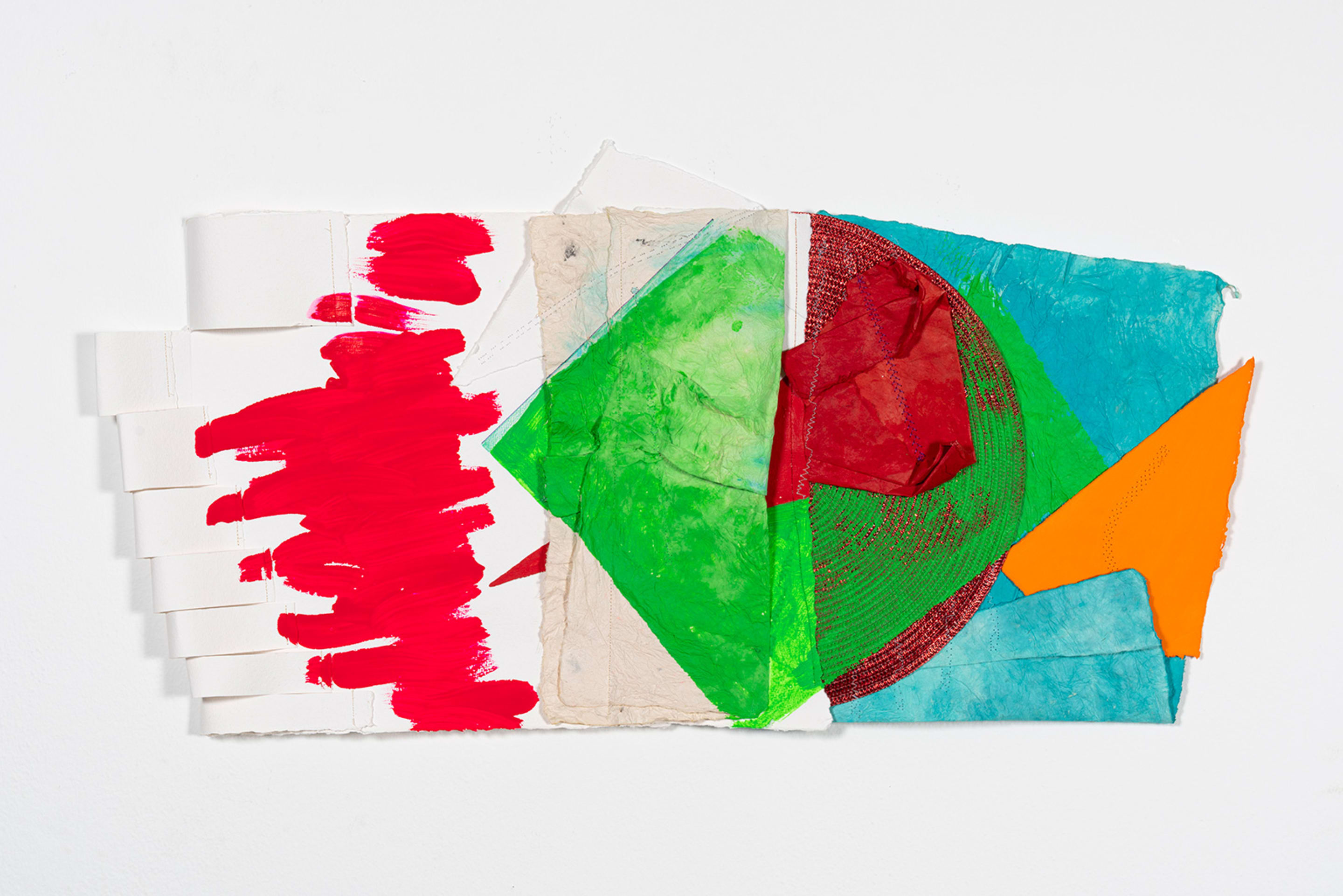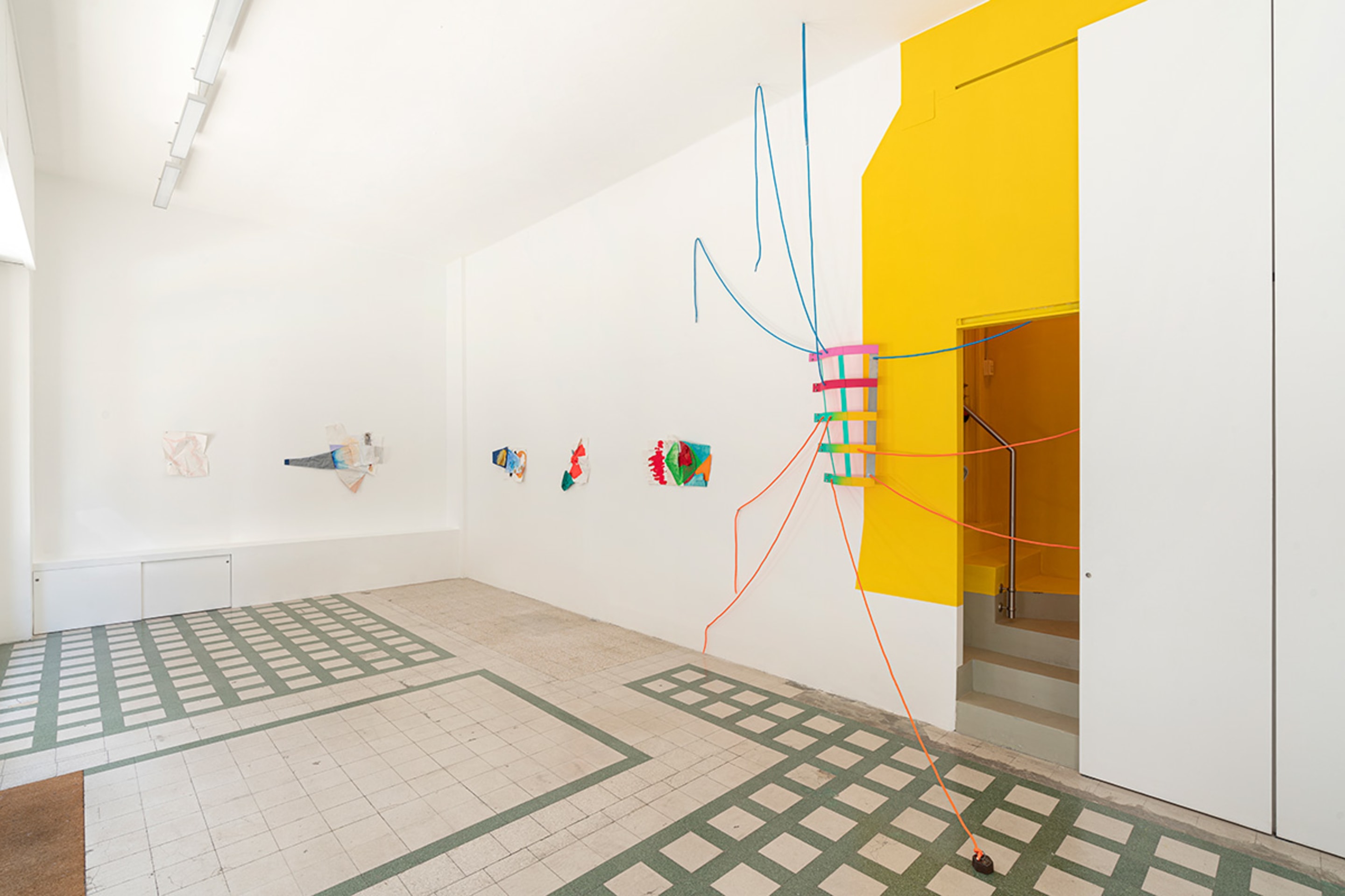 In via Stradella 1 Jessica Stockholder presents a selection of Corona Virus homeworks, works produced during 2020, a year defined by dramatic shifts in the time and space of production. At the outset of the Covid-19 pandemic Stockholder was unable to access her studio and developed a way of working that was possible from her home as is indicated by their titles. Taking paper as a starting point, and working with the volumes that paper allows, these works were made by folding, sewing, gluing, and cutting, enacted on a variety of materials: paper, fabric, markers, pencils, threads, tulle, boot laces, and more. The works hang on walls in pictorial space, and yet they claim a sculptural dimension. This duality between picture making and sculptural form is consistent throughout Stockholder’s work.