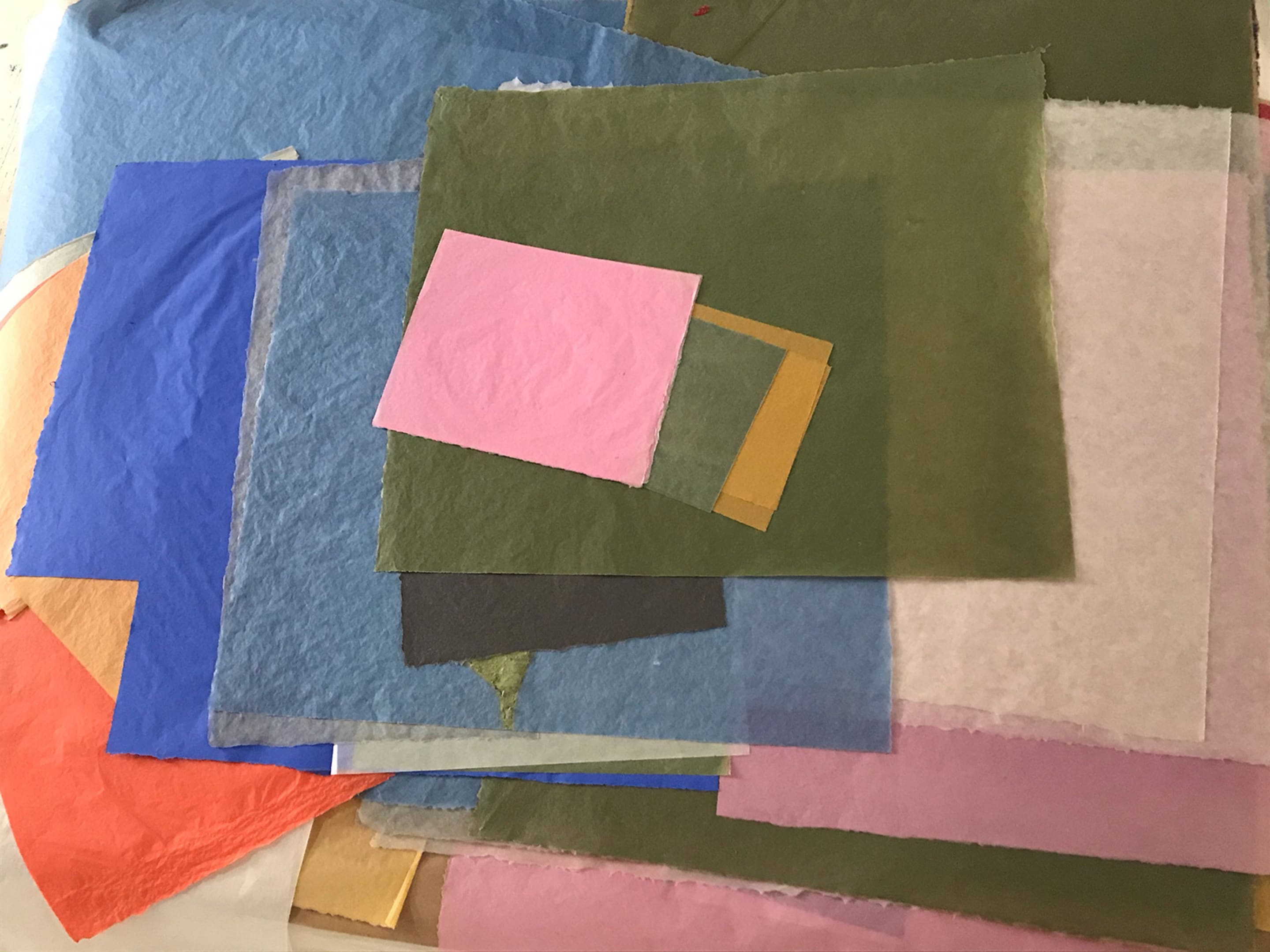 Lokta paper, watercolor paper, brass screen, thread, pencil, pencil crayon, acrylic paint, marker, thread, vinyl, fragment of Nepalese painting, plastic tarp